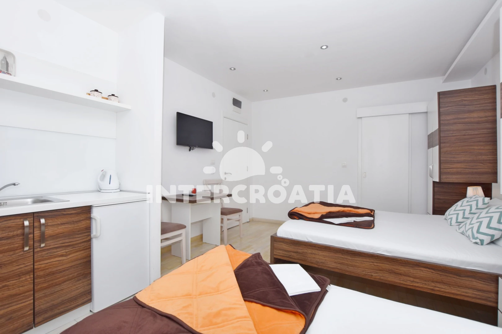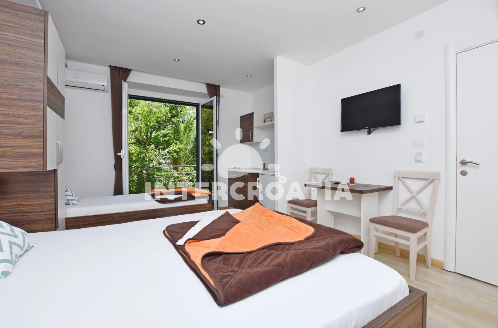 Apartmán typu studio (25 m2) s balkonem, a výhledem na moře. Nachází se ve 2. patře objektu. Kuchyňská linka je vybavena varnou deskou, rychlovarnou konvicí, nádobím, lednicí. K dispozici dvoulůžko, televize, žehlička. Koupelna se sprchovým koutem, umyvadlem, fénem a WC.