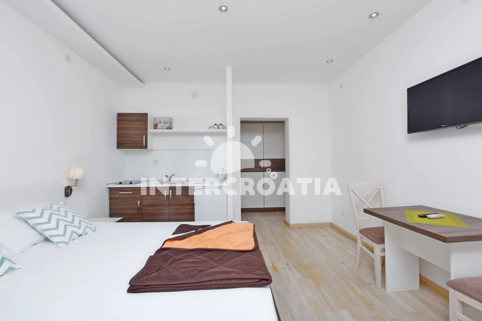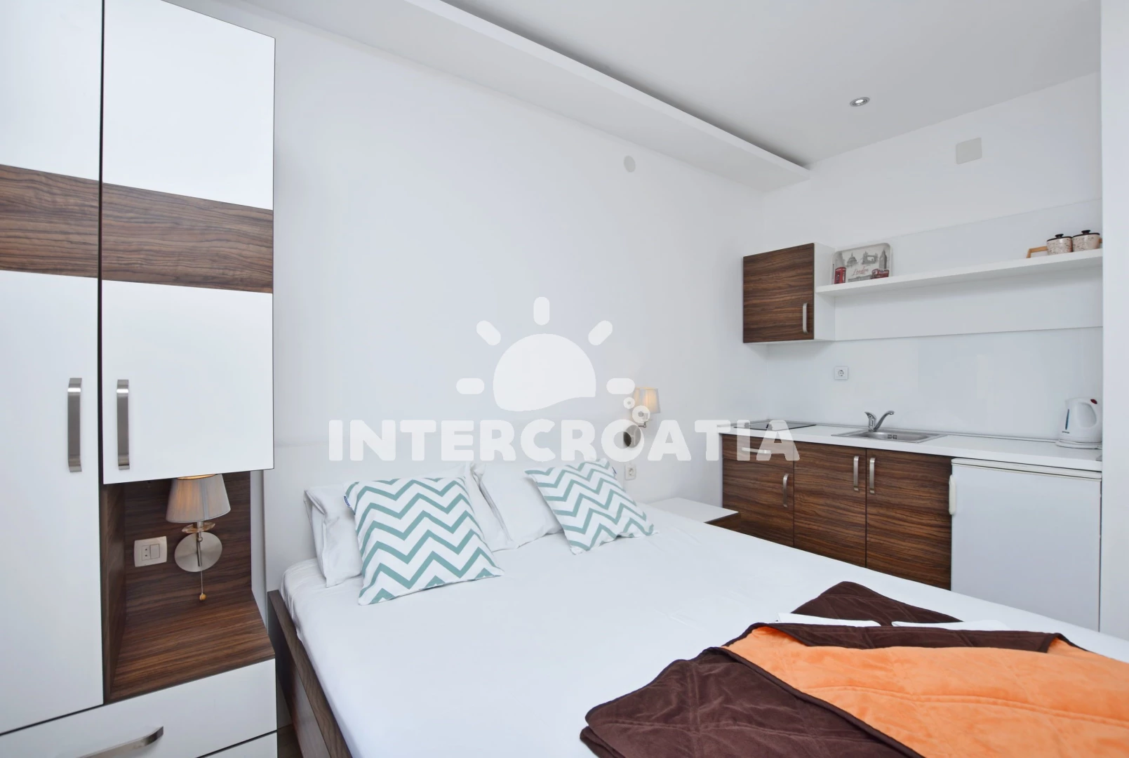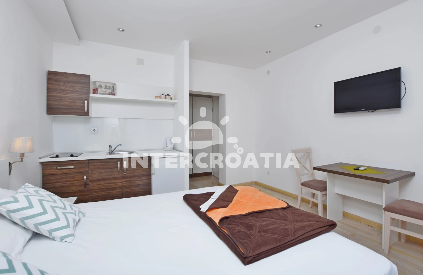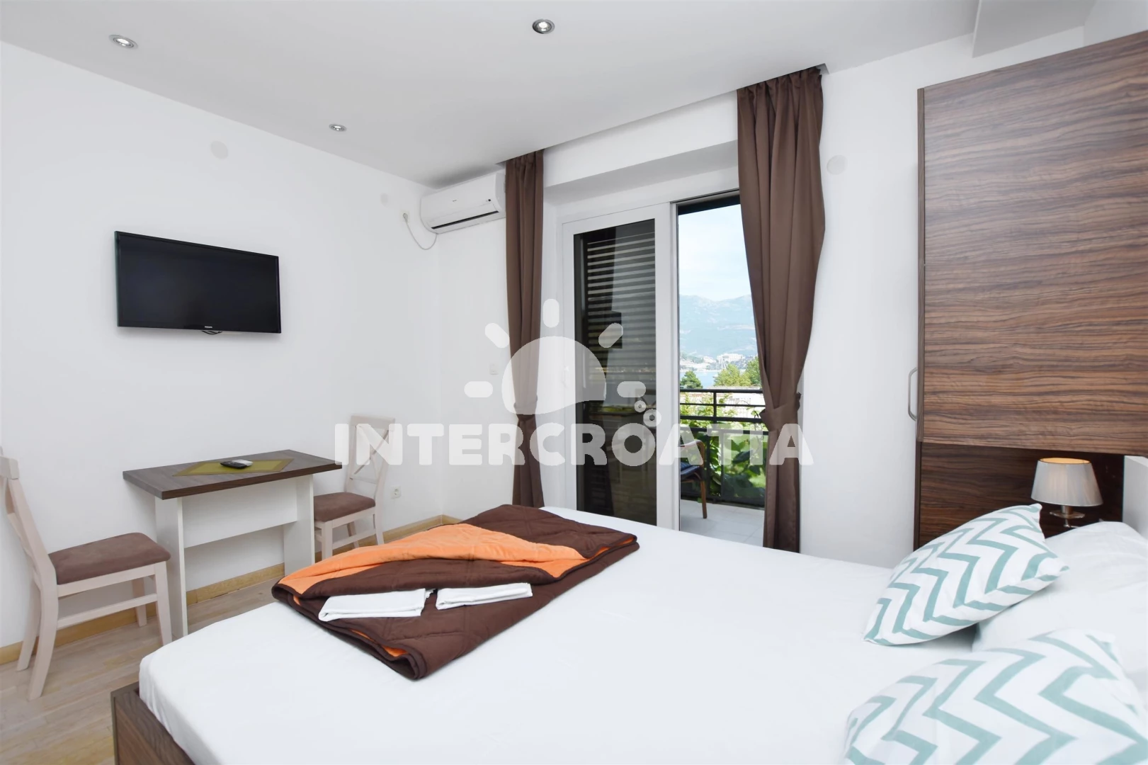 Apartmán typu studio (25 m2) s balkonem, a výhledem na moře. Nachází se ve 2. patře objektu. Kuchyňská linka je vybavena varnou deskou, rychlovarnou konvicí, nádobím, lednicí. K dispozici dvoulůžko, televize, žehlička. Koupelna se sprchovým koutem, umyvadlem, fénem a WC.