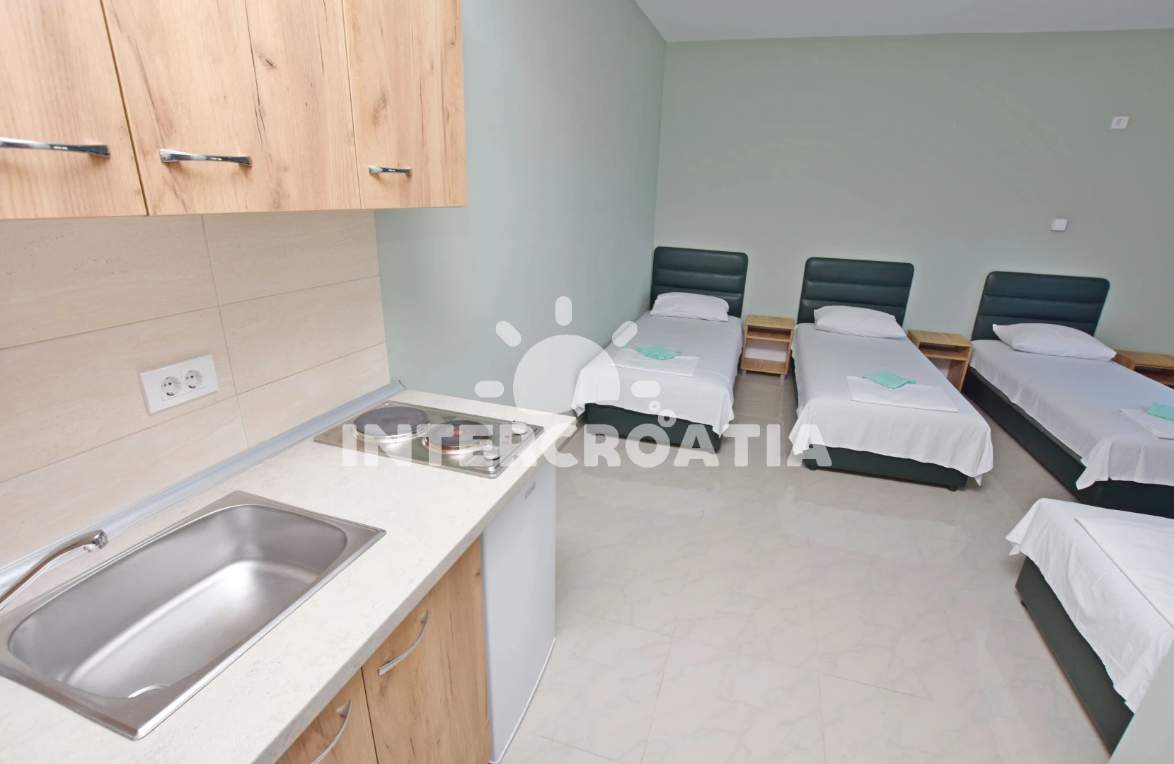 Apartmán typu studio (25 m2) s terasou. Nachází se ve 2. patře objektu. Kuchyňská linka je vybavena varnou deskou, nádobím, lednicí. K dispozici televize se satelitním programem. Koupelna se sprchovým koutem, umyvadlem, WC.