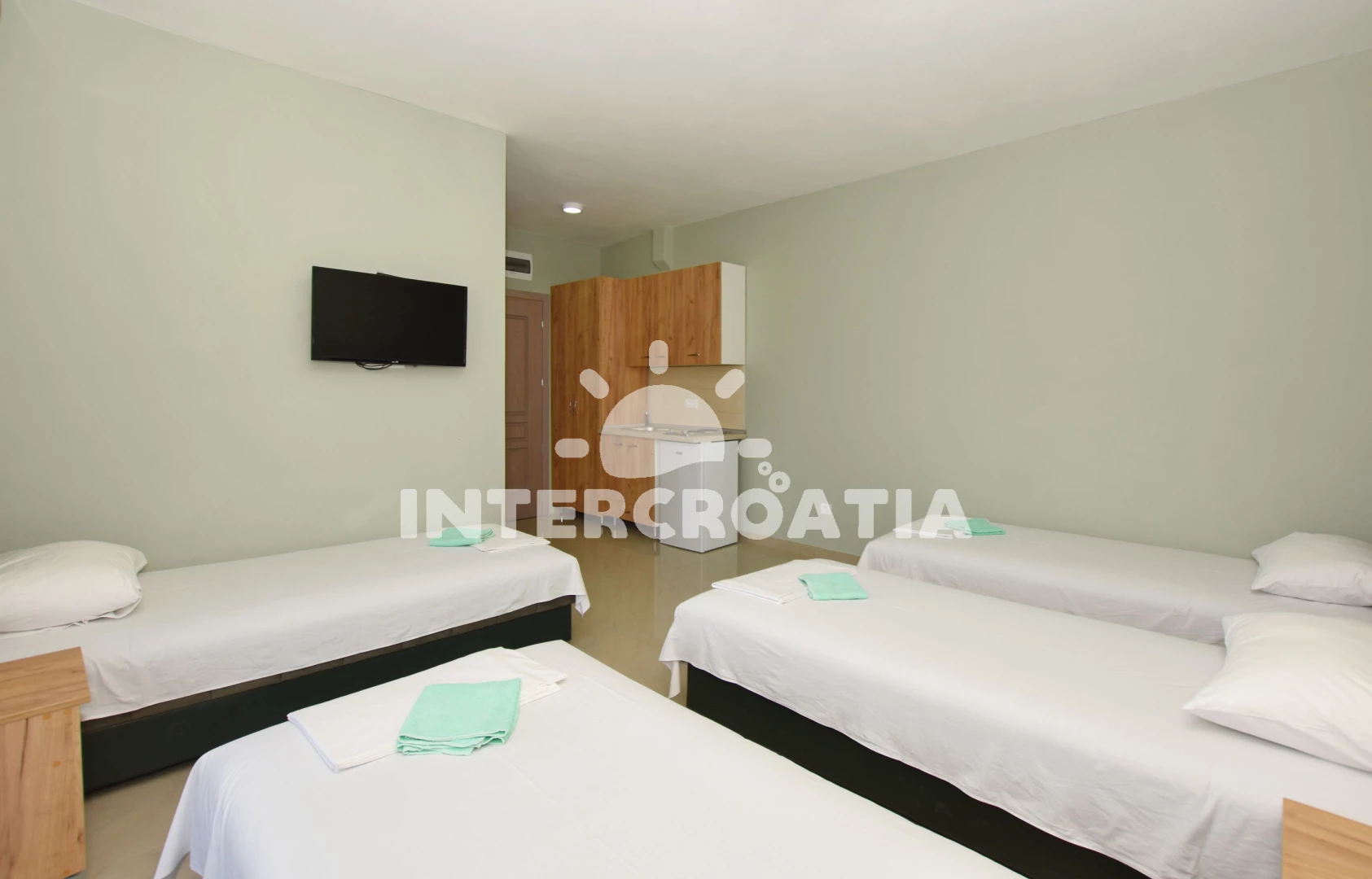 Apartmán typu studio (25 m2) s terasou. Nachází se ve 4. nebo vyšším patře objektu. Kuchyňská linka je vybavena varnou deskou, nádobím, lednicí. K dispozici televize se satelitním programem. Koupelna se sprchovým koutem, umyvadlem, WC.