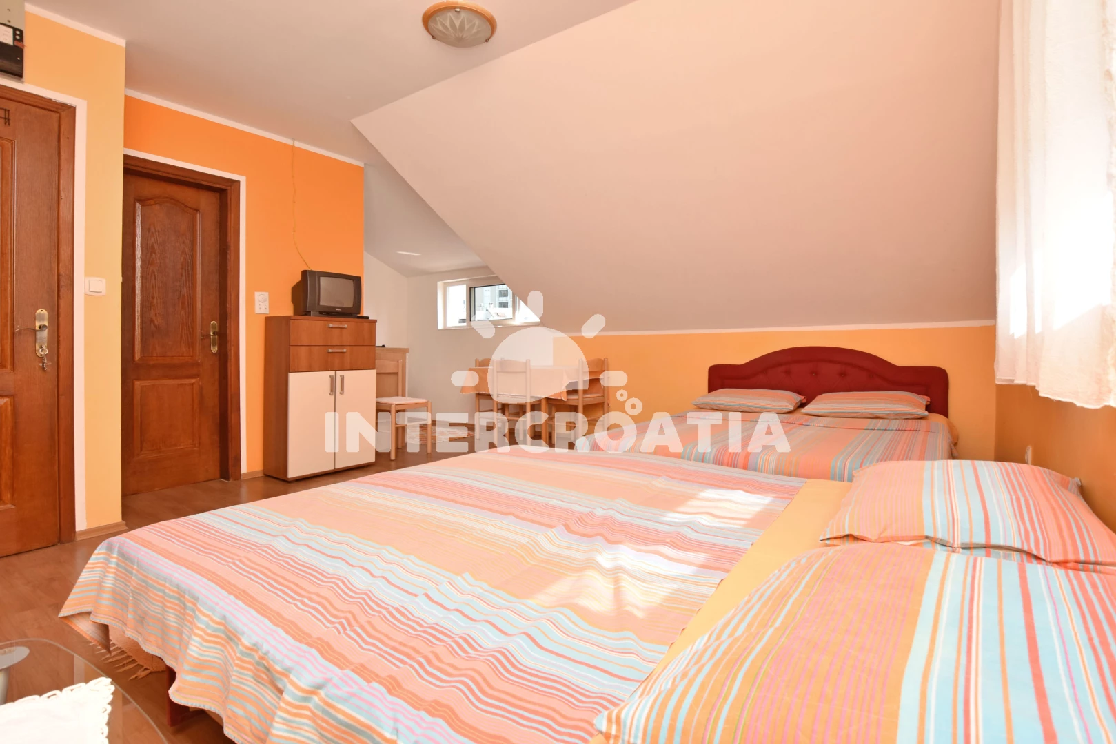 Apartmán se nachází 300 m od moře a pláže. Pláž je skalnatá, oblázková, větší kamení a betonové desky. Apartmán disponuje bazénem s lehátky pro ubytované hosty. Parkování je před domem.