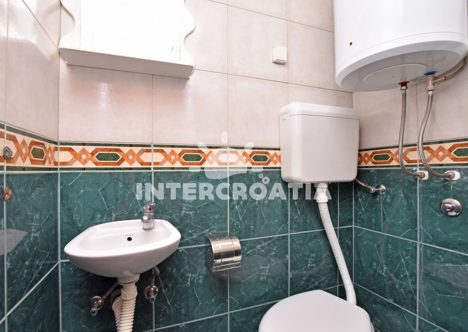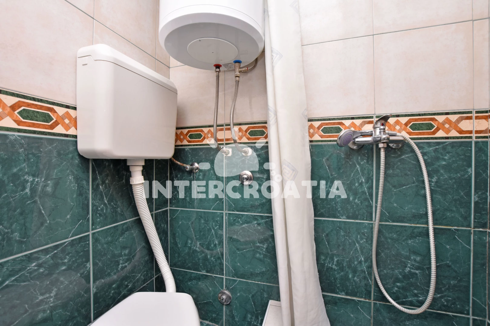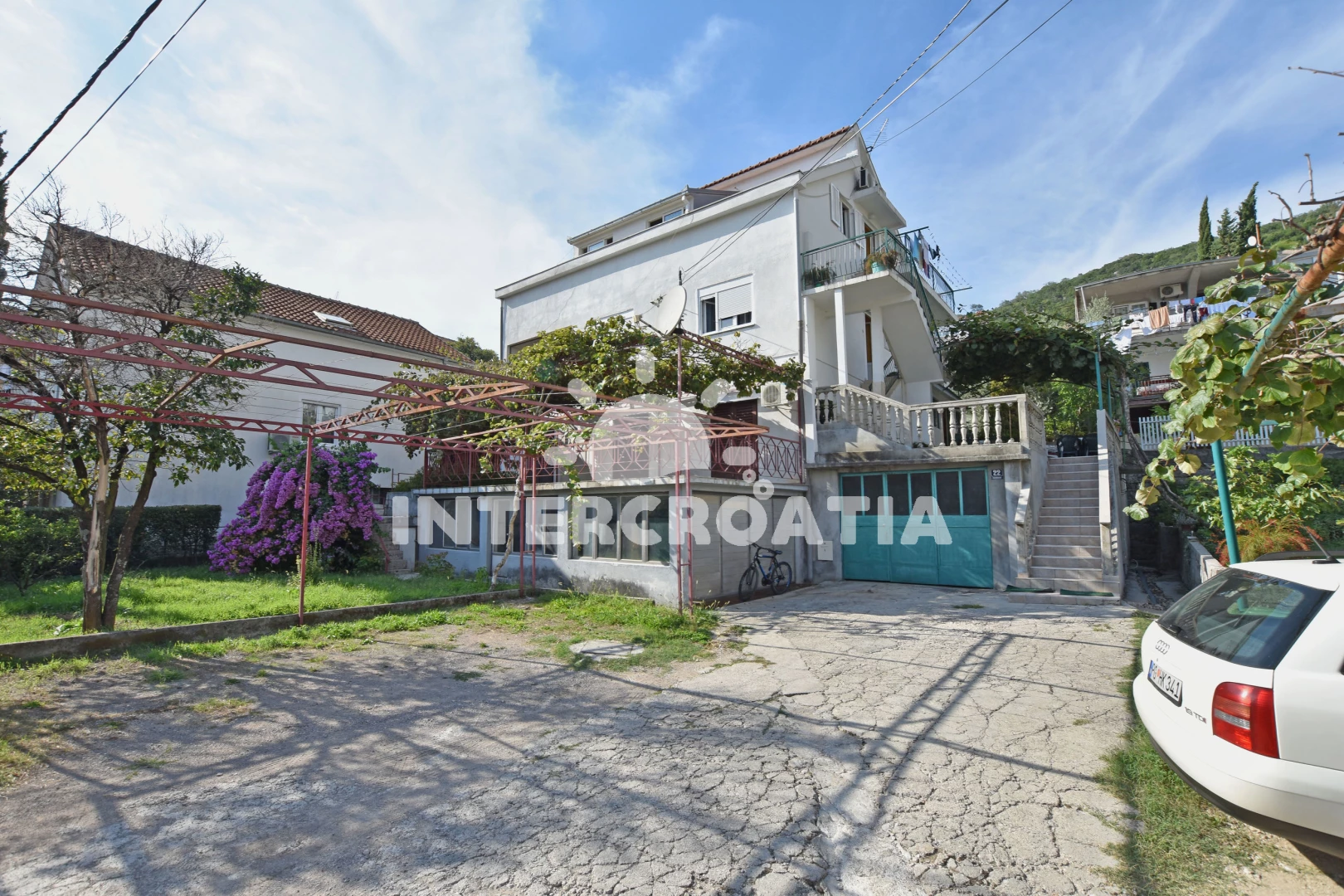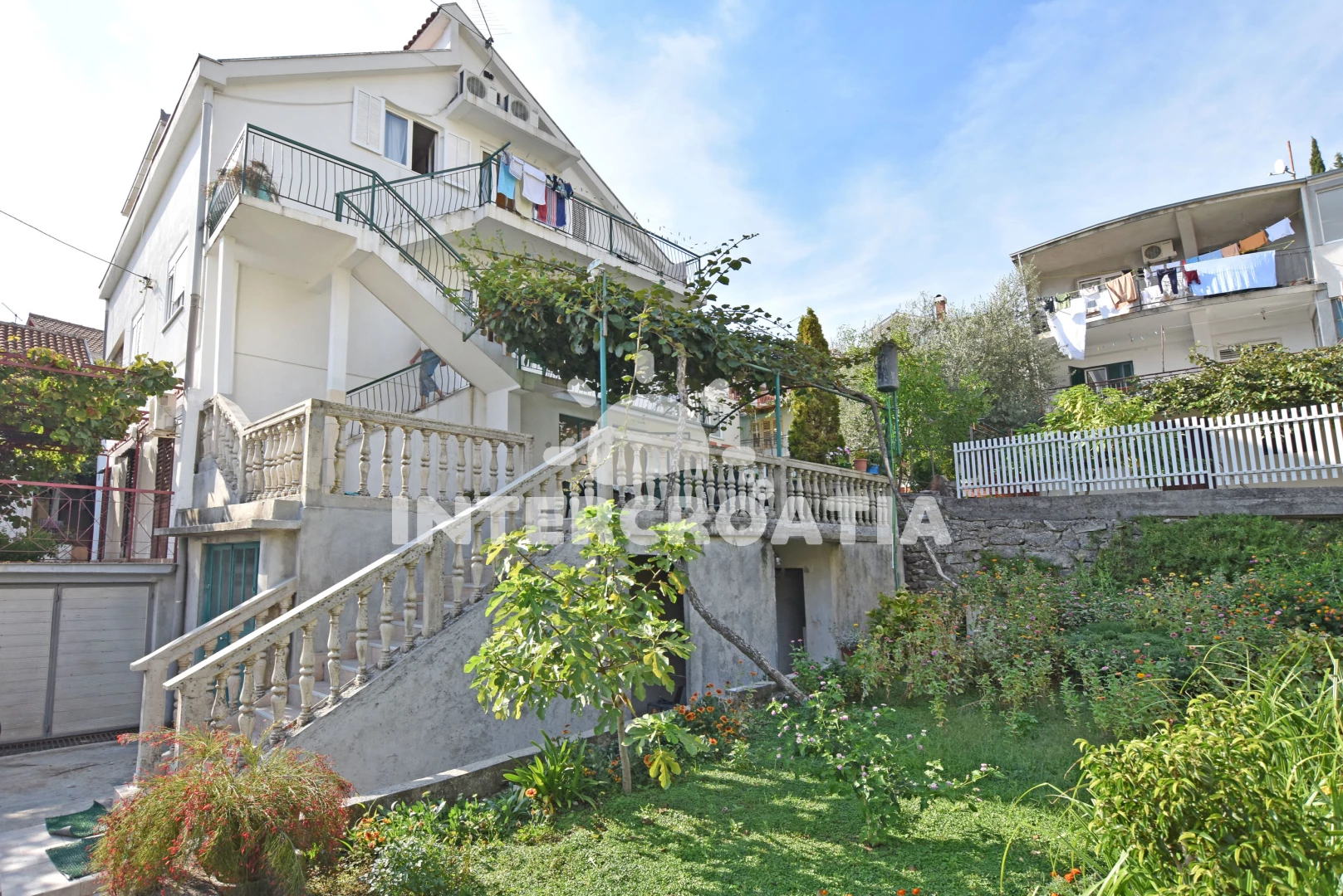 Apartmán se nachází 300 m od moře a pláže. Pláž je skalnatá, oblázková, větší kamení a betonové desky. Apartmán disponuje bazénem s lehátky pro ubytované hosty. Parkování je před domem.