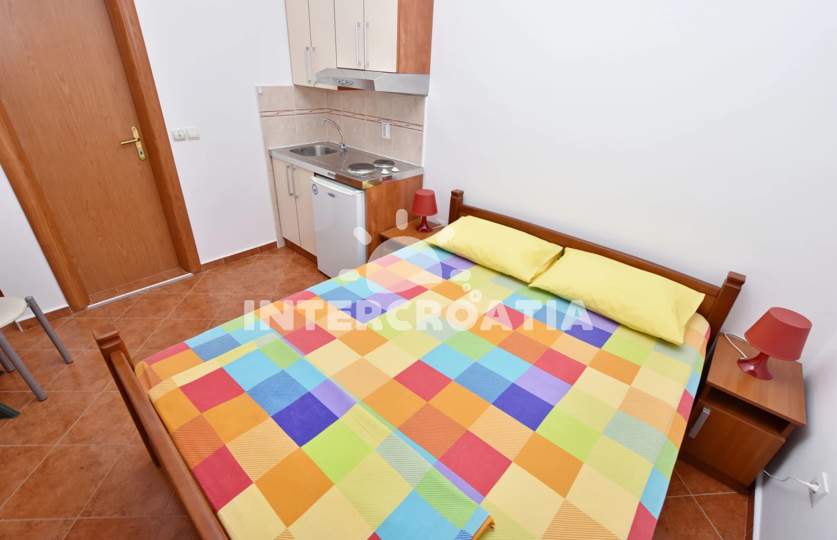 Apartmán typu studio (20 m2). Nachází se v přízemí objektu. Kuchyňská linka je vybavena varnou deskou, toustovačem, rychlovarnou konvicí, nádobím, lednicí. K dispozici dvoulůžko, televize se satelitním programem, žehlička. Koupelna se sprchovým koutem, umyvadlem, WC. Hostům je k dispozici parkování u objektu zdarma.