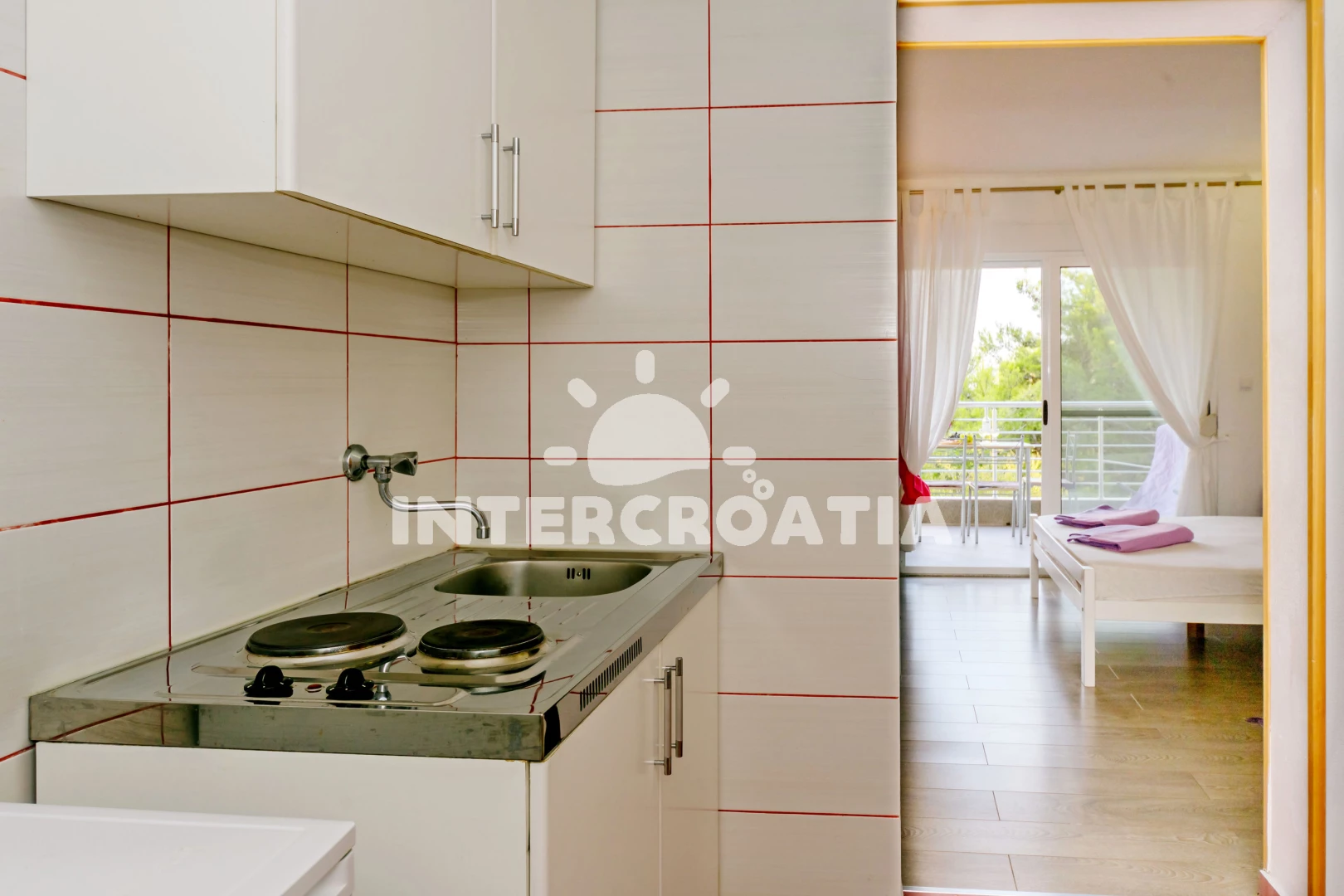 Apartmán typu studio (42 m2) s terasou. Nachází se v 1. patře objektu. Kuchyňská linka je vybavena varnou deskou, rychlovarnou konvicí, nádobím, lednicí. K dispozici dvoulůžko, televize se satelitním programem, žehlička. Koupelna se sprchovým koutem, umyvadlem, fénem a WC. Hostům je k dispozici parkování u objektu zdarma.