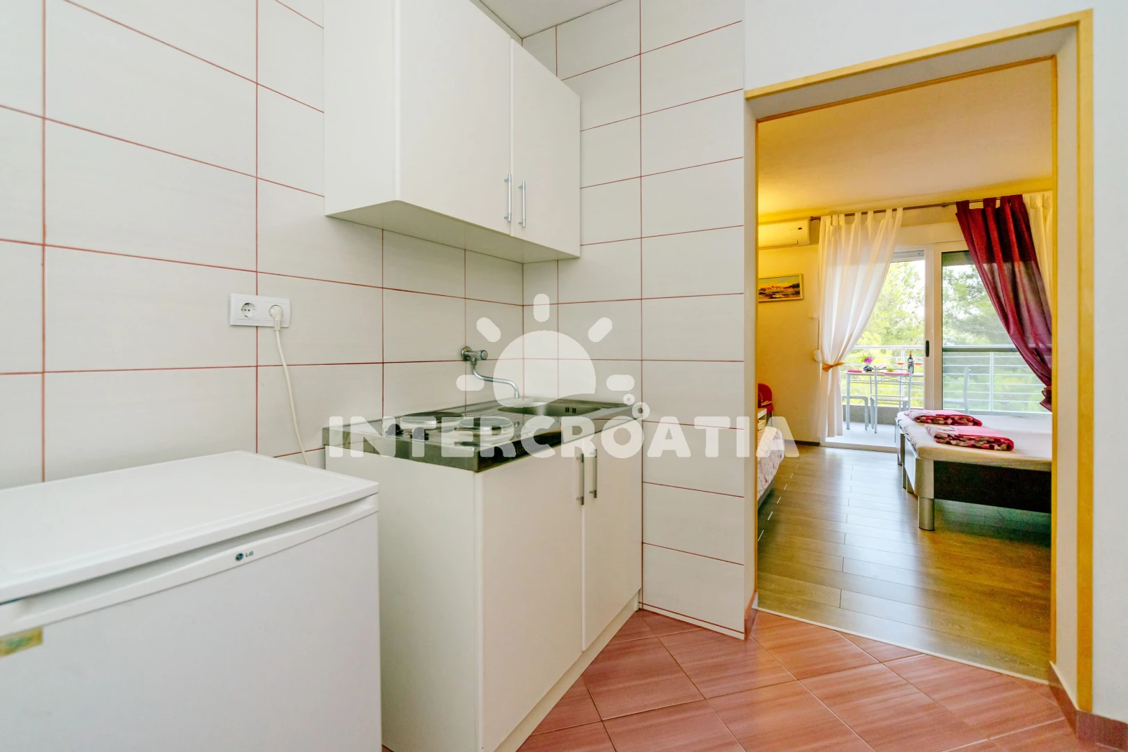 Apartmán typu studio (42 m2) s terasou. Nachází se v 1. patře objektu. Kuchyňská linka je vybavena varnou deskou, rychlovarnou konvicí, nádobím, lednicí. K dispozici dvoulůžko, televize se satelitním programem, žehlička. Koupelna se sprchovým koutem, umyvadlem, fénem a WC. Hostům je k dispozici parkování u objektu zdarma.