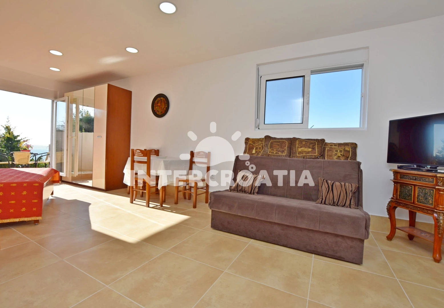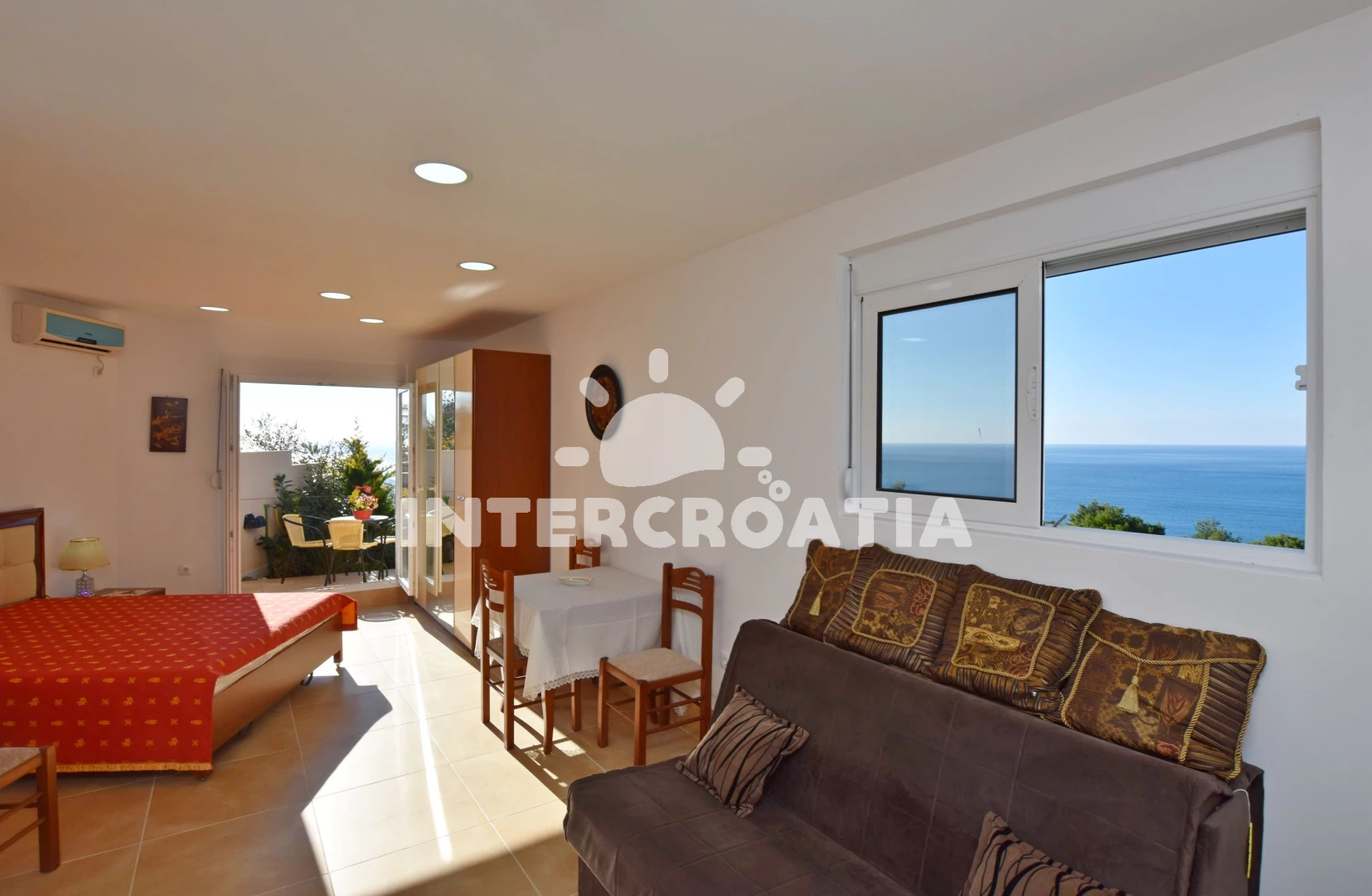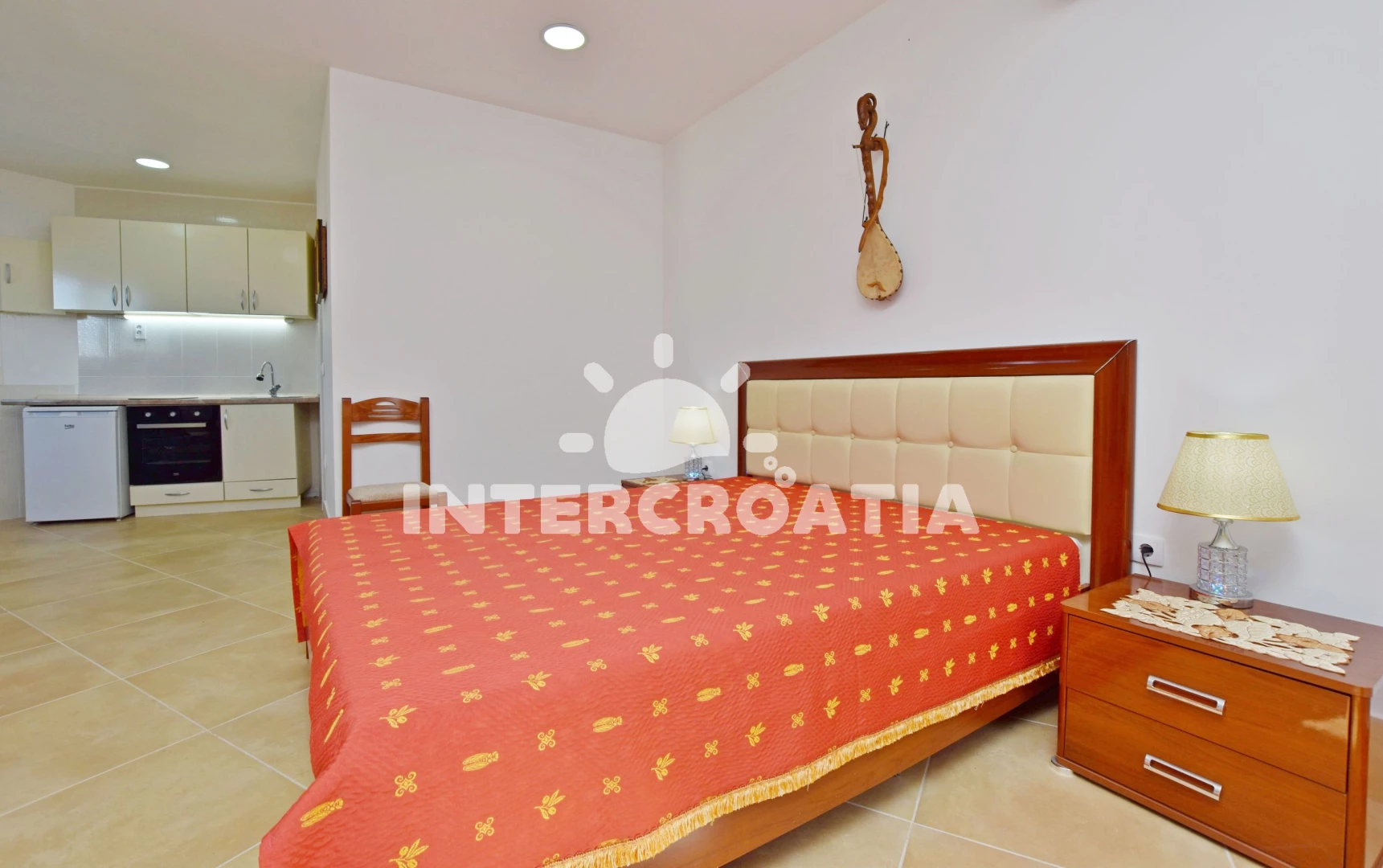 Apartmán typu studio (30 m2) s terasou. Nachází se v přízemí objektu. Kuchyňská linka je vybavena varnou deskou, toustovačem, kávovarem, troubou, mikrovlnnou troubou, rychlovarnou konvicí, nádobím, lednicí. K dispozici dvoulůžko, televize se satelitním programem, žehlička. Koupelna se sprchovým koutem, umyvadlem, fénem a WC.
