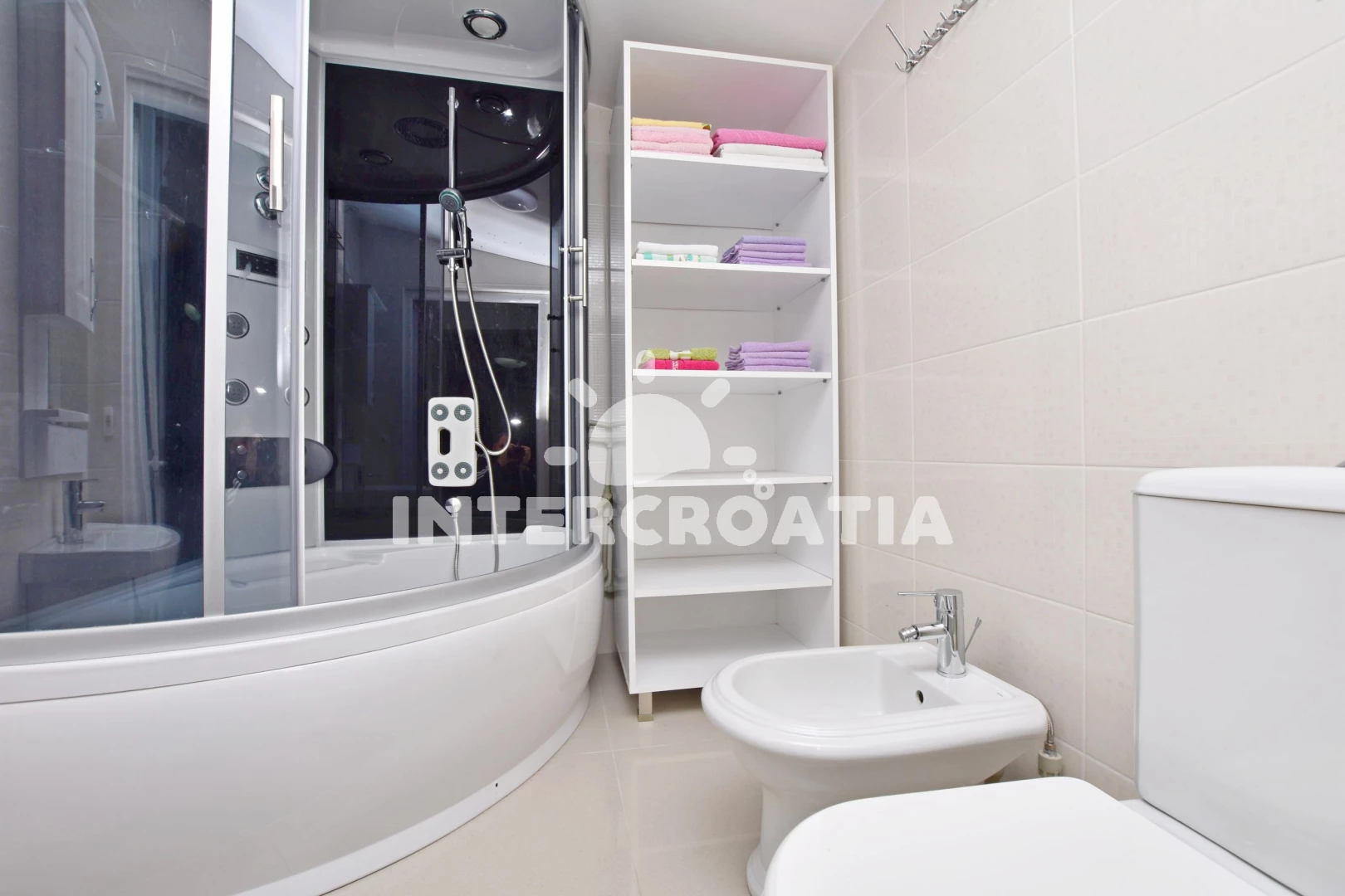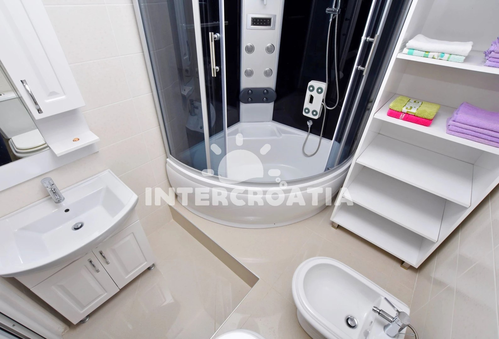 Apartmán se nachází 300 m od moře a pláže. Pláž je písčitá, oblázková a větší kamení. Apartmán disponuje bazénem s lehátky pro ubytované hosty. U objektu je k dispozici společná zahrada s posezením a grilem. Parkování je před domem.