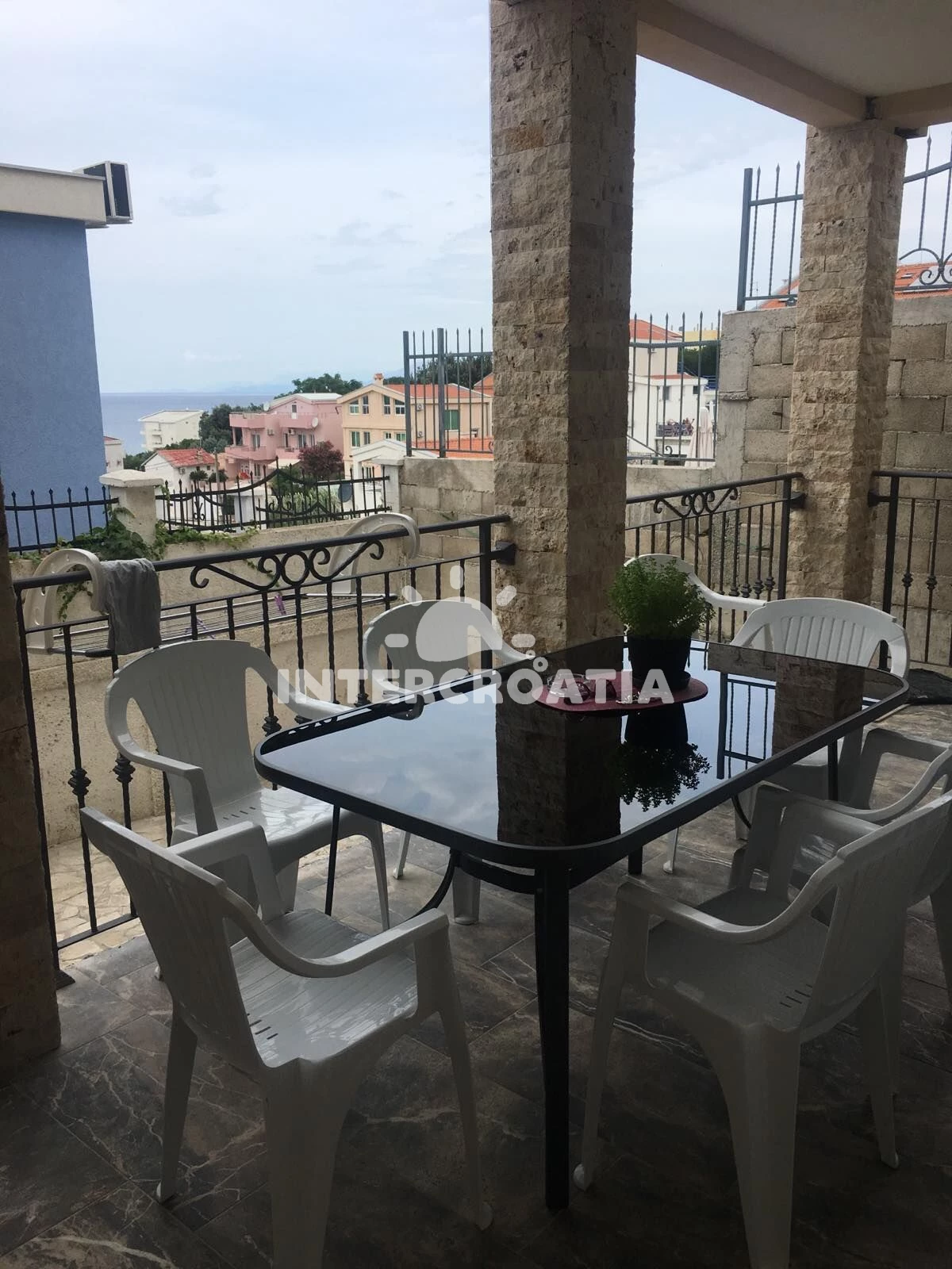 Apartmán (80 m2) s terasou, a výhledem na moře. Nachází se v přízemí objektu. Apartmán má 2 ložnice a je vhodný pro až 7 osob. Kuchyňská linka je vybavena varnou deskou, troubou, myčkou na nádobí, nádobím, lednicí. V obývací místnosti je rozložitelná pohovka (extra lůžko pro 2 osoby). K dispozici televize. První ložnice s dvoulůžkem. Druhá ložnice s palandou, jednolůžkem. Koupelna se sprchovým koutem, umyvadlem, fénem a WC. Hostům je k dispozici parkování u objektu zdarma.