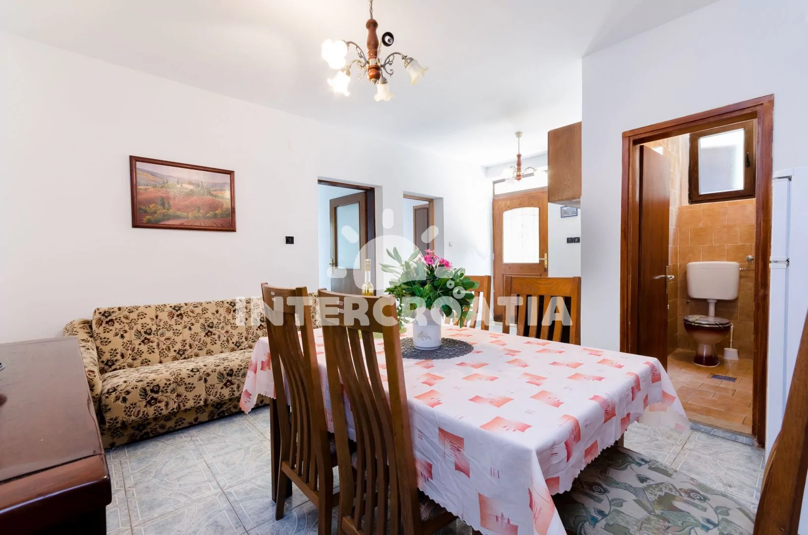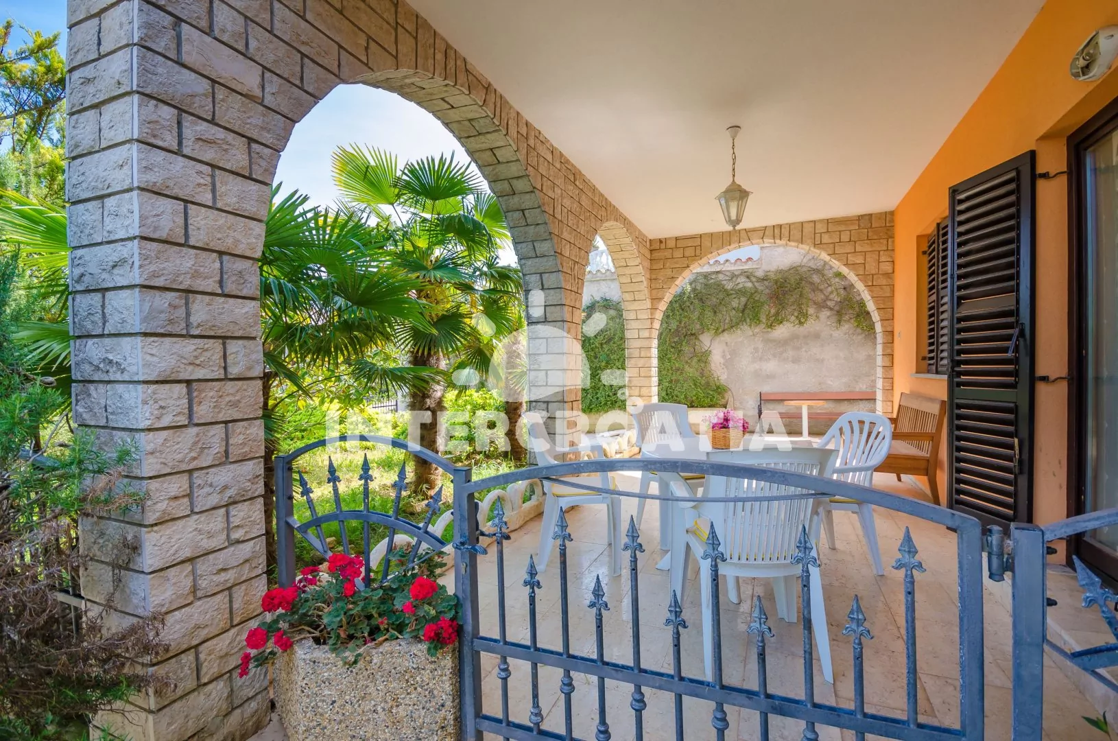 Dvoupatrový domek v zahradě s terasou a dobrou dostupností jak na pláž, tak do centra obce.