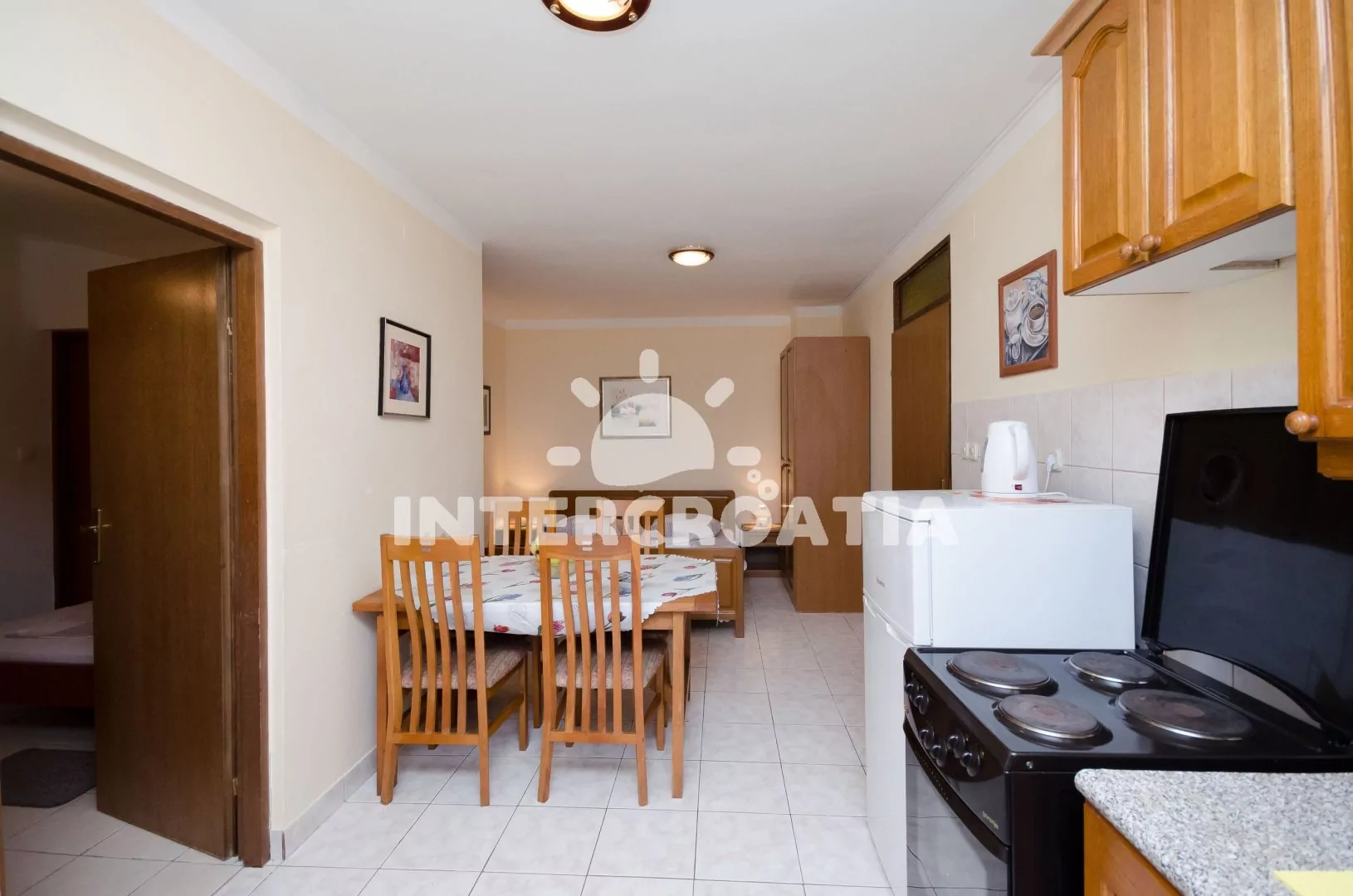 Dvoupokojový apartmán s terasou s posezením, nacházející se v 2. patře domu. Vstup, obývací místnost spojená s kuchyňským koutem. Kuchyňská linka se sporákem, lednicí s mrazákem, kávovarem a nádobím.…