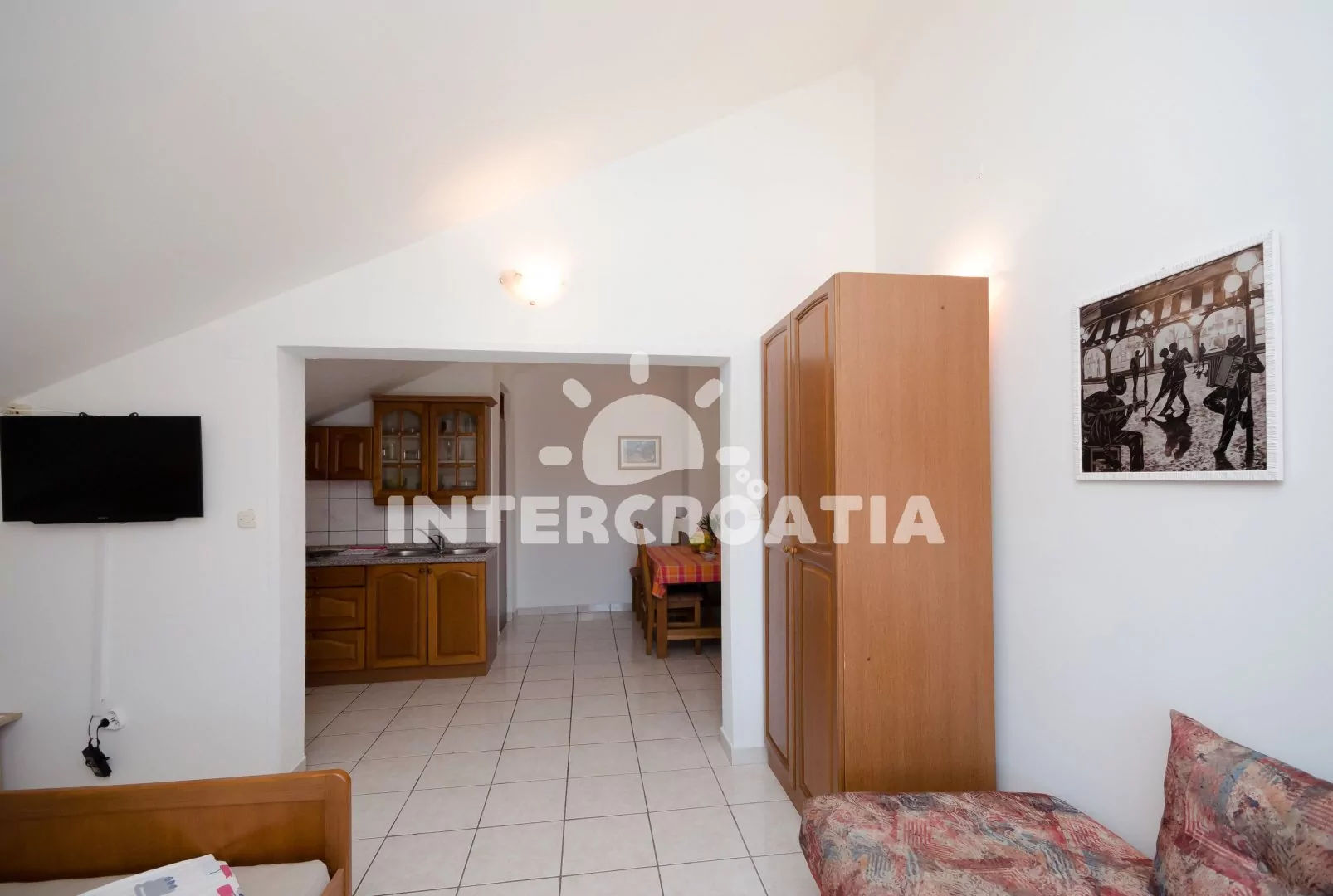 Apartmán typu studio, nacházející se v podkroví. Vstup, obývací místnost spojená s kuchyňským koutem. Kuchyňská linka s dvouplotýnkovým vařičem, lednicí, kávovarem a nádobím. V obývací místnosti…