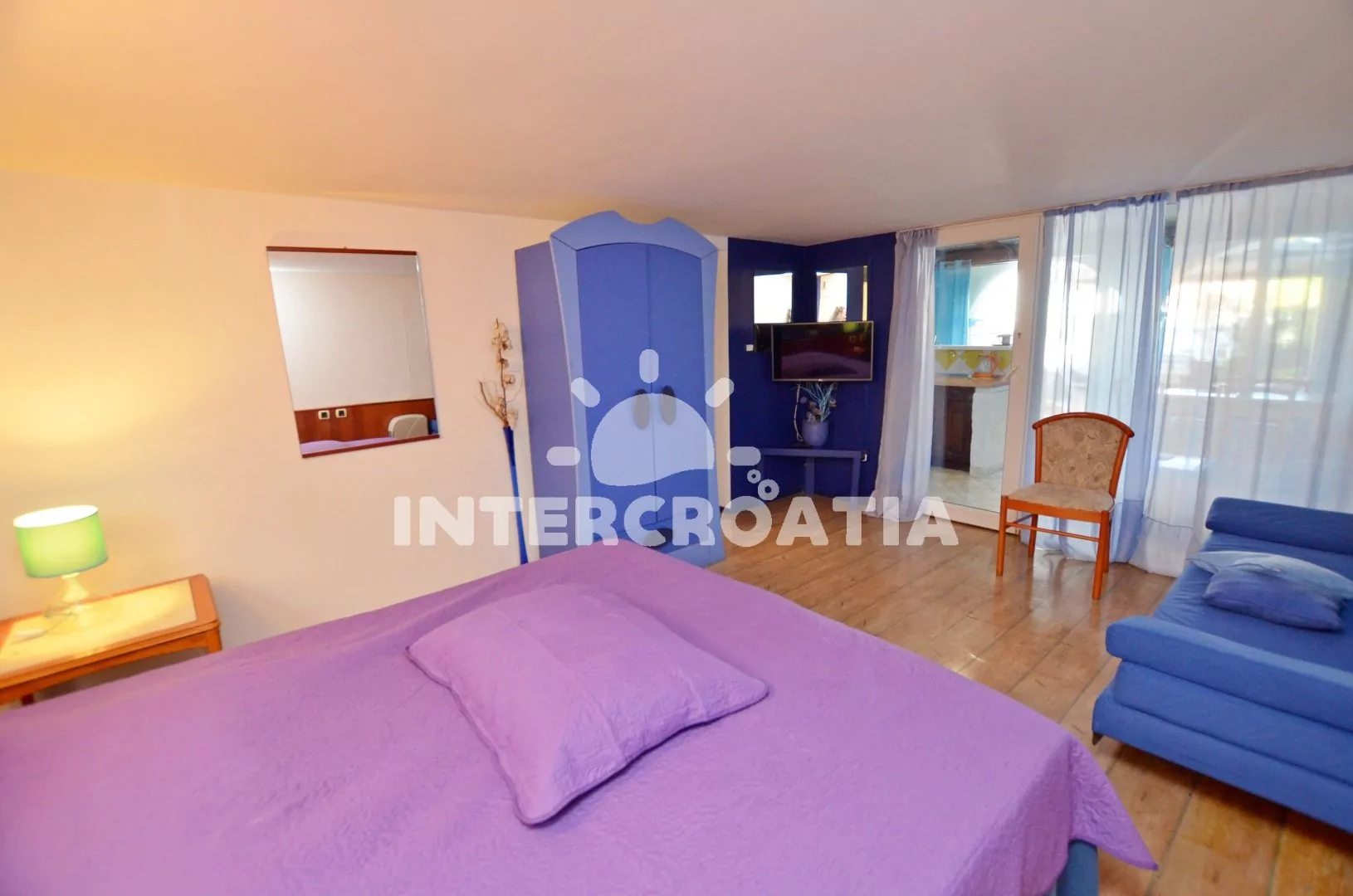 Apartmán (46 m2) s vlastní terasou se nachází v přízemí a je vhodný pro 4 až 6 osob. Obývací pokoj je spojený s kuchyní. Kuchyňská linka je vybavena varnou deskou, troubou, digestoří, rychlovarnou konvicí, kávovarem, toustovačem, nádobím a lednicí s mrazákem. Obývací pokoj s jídelním stolem pro 6 osob, pohovkou (rozložitelná na extra lůžko pro 2 osoby), klimatizací a vstupem na terasu. První ložnice s dvoulůžkem a televizí se satelitním programem. Druhá ložnice s patrovou postelí (lůžka pro 2 osoby). Koupelna se sprchovým koutem, umyvadlem a wc. Hostům je k dispozici parkování u objektu zdarma.