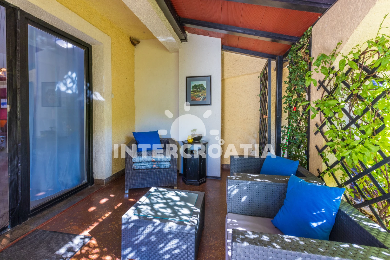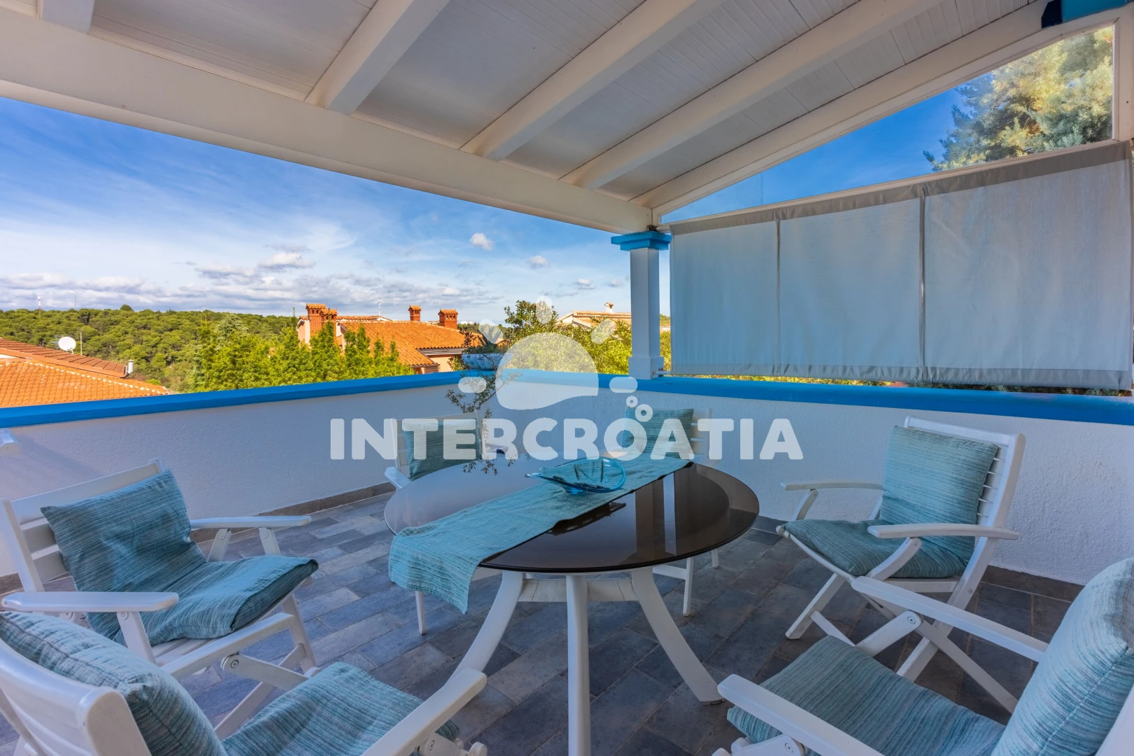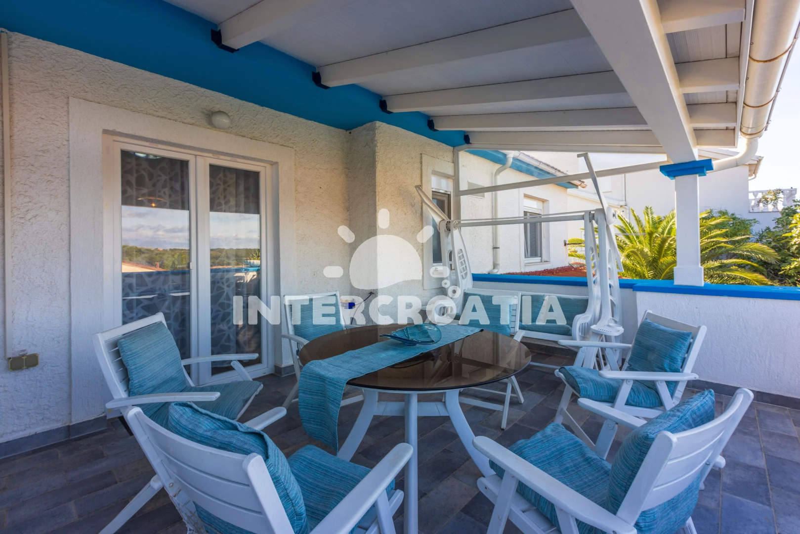 Apartmán (100 m2) s vlastní terasou se nachází ve zvýšeném přízemí a je vhodný pro až 6 osob. Obývací pokoj je spojený s kuchyní. Kuchyňská linka je vybavena varnou deskou, troubou, digestoří, myčkou na nádobí, rychlovarnou konvicí, mikrovlnnou troubou, kávovarem, toustovačem, nádobím a lednicí s mrazákem. Obývací pokoj s jídelním stolem pro 6 osob pohovkou (rozložitelná na extra lůžko pro 2 osoby), televizí se satelitním programem, klimatizací a vstupem a terasu. První ložnice s dvoulůžkem, pohovkou a klimatizací. Druhá ložnice s jedním dvoulůžkem. První koupelna s vanou, umyvadlem, fénem a wc. Druhá koupelna se sprchovým koutem, umyvadlem a wc. Hostům je k dispozici parkování u objektu zdarma.