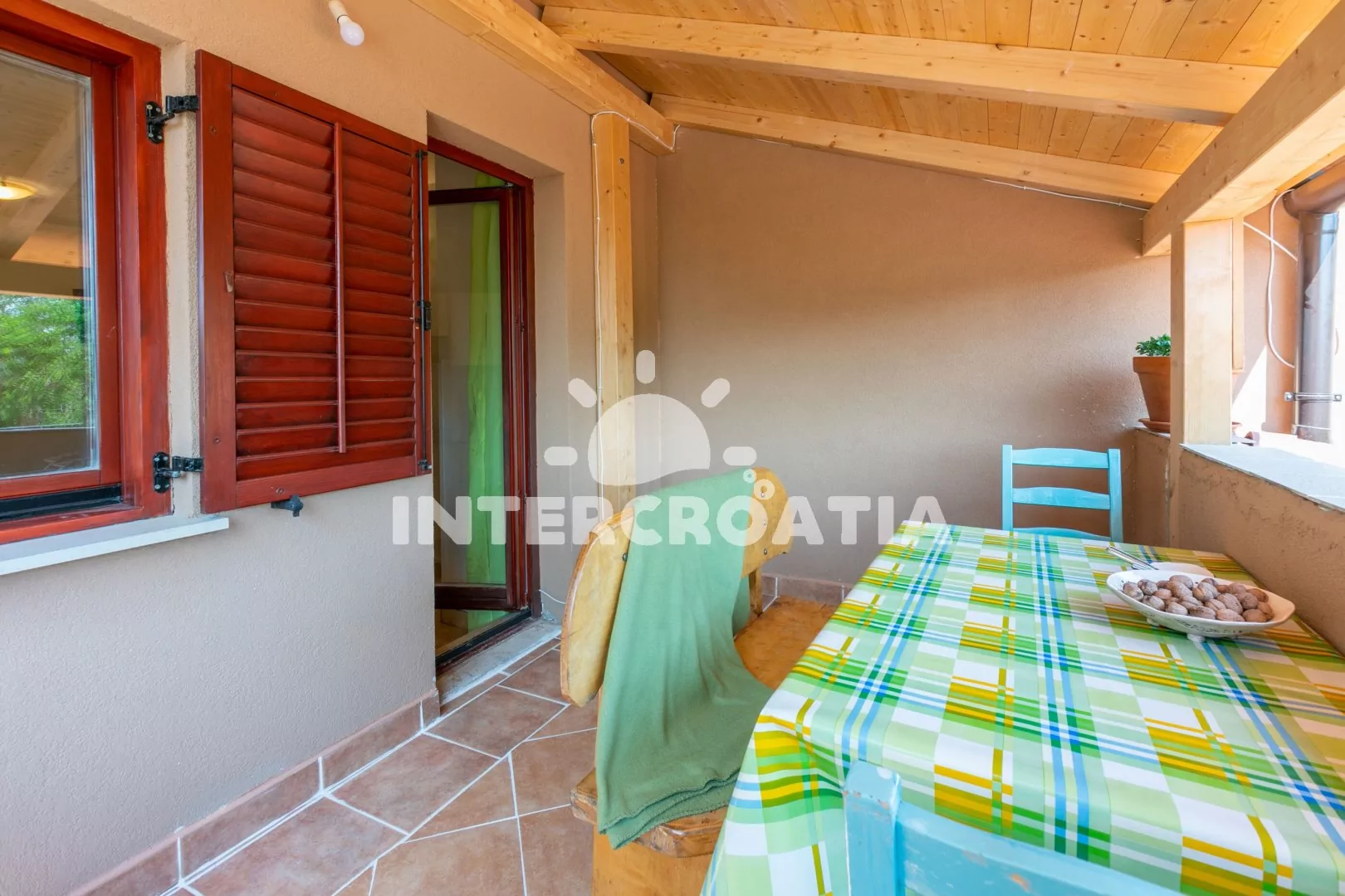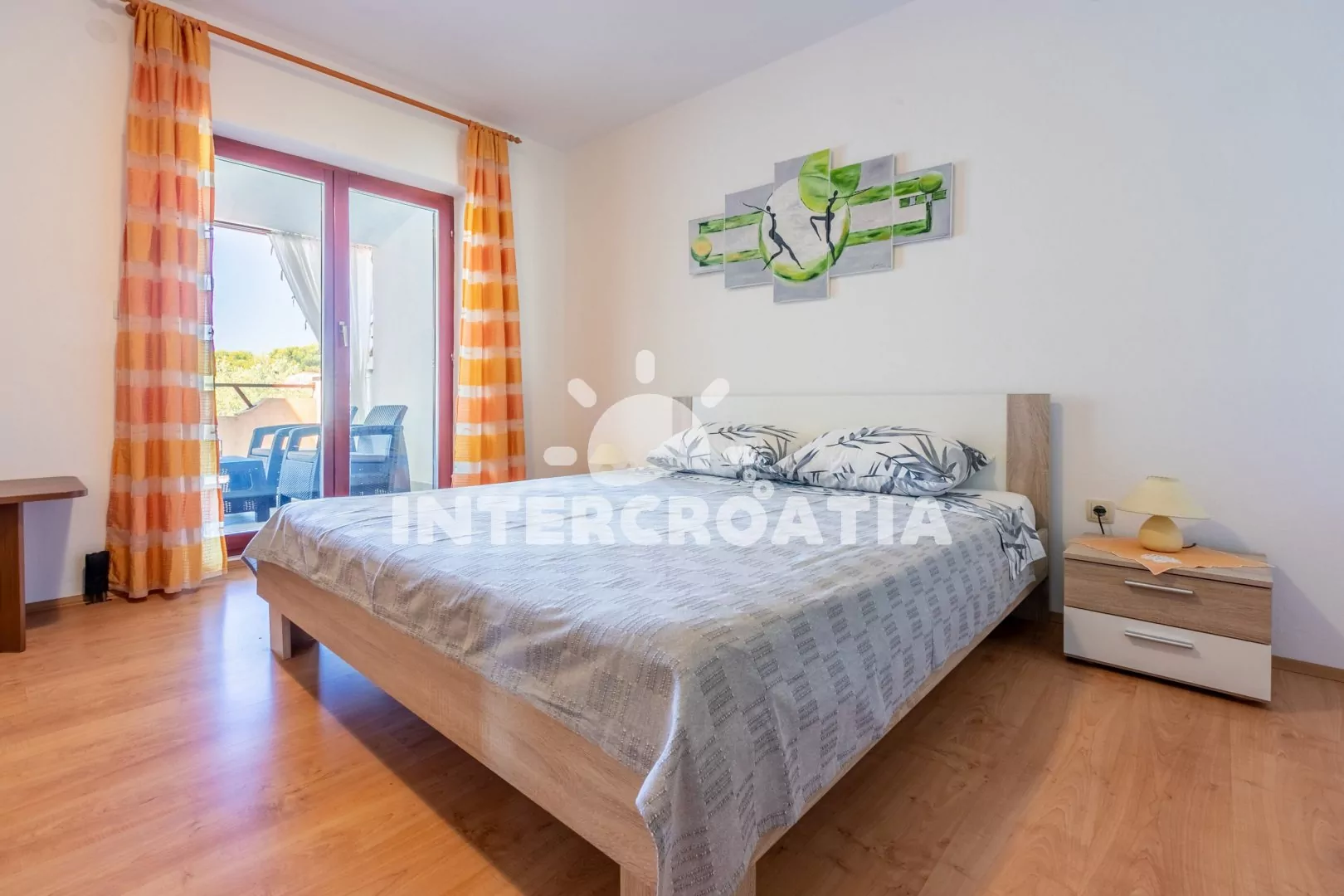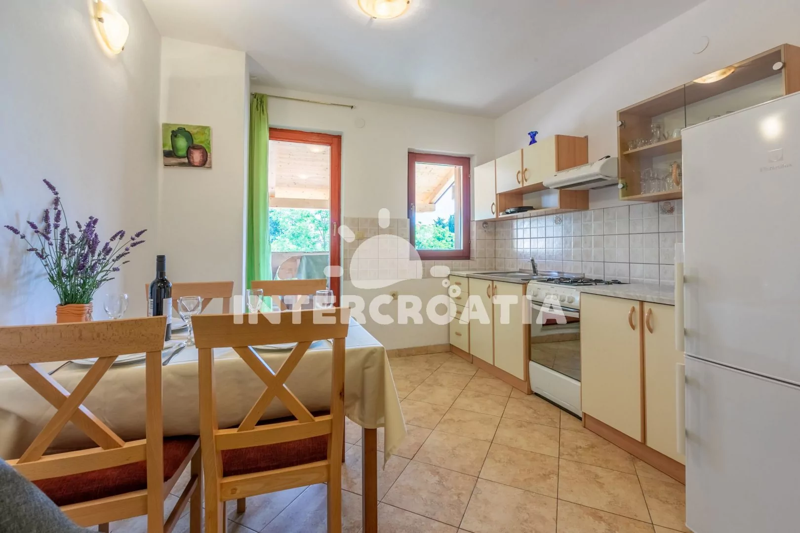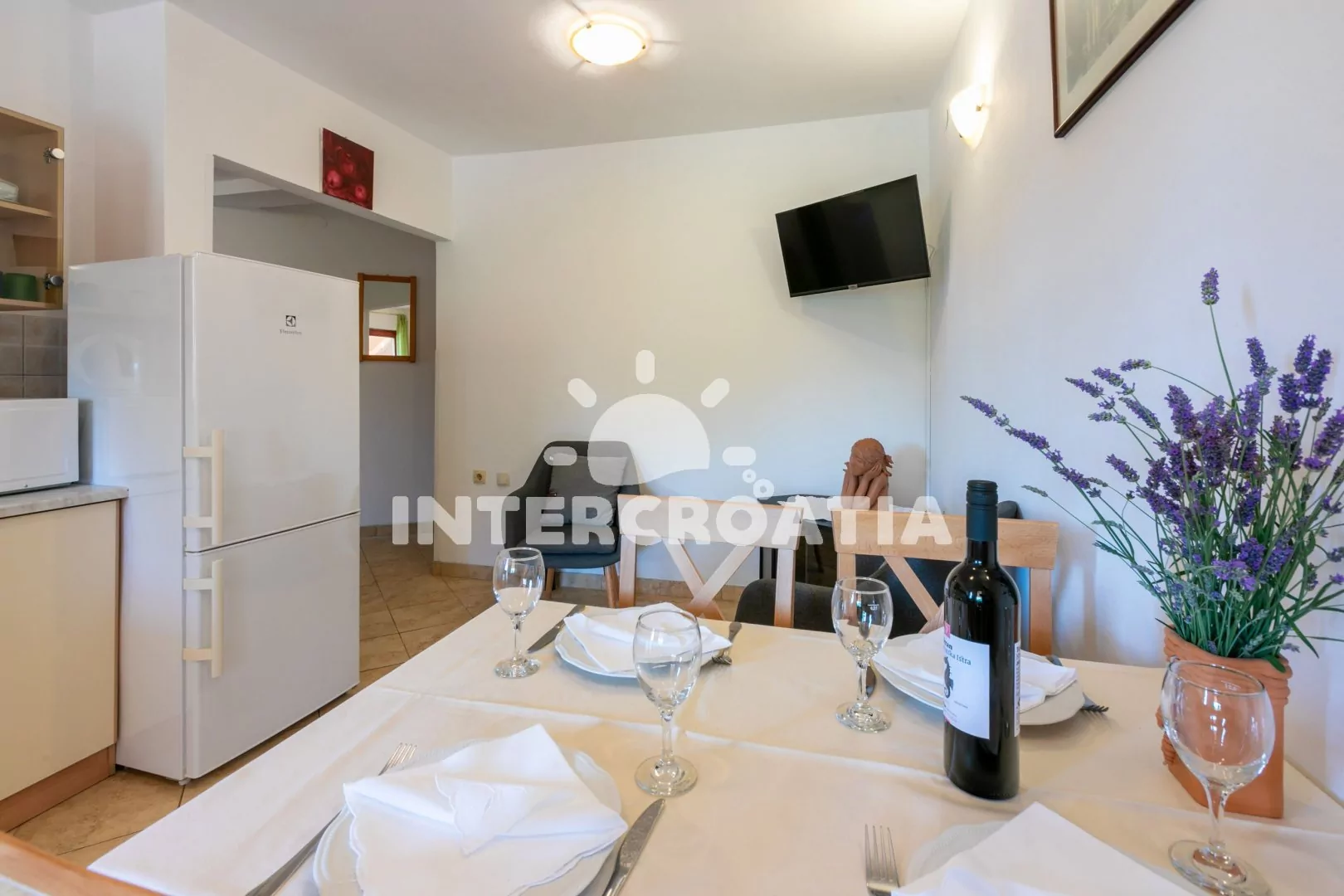 Apartmán (60 m2) v prvním patře domu s terasou, venkovním posezením, výhledem do zahrady a klidné ulice je vhodný pro 3 osoby. Obývací pokoj je spojený s kuchyní. Kuchyňská linka je vybavena sporákem, troubou, digestoří, mikrovlnnou troubou, rychlovarnou konvicí, kávovarem, toustovačem, nádobím a lednicí s mrazákem. Obývací pokoj s jídelním stolem pro 4 osoby, sedací soupravou, televizí se satelitním programem a klimatizací. První ložnice s jedním dvoulůžkem a vstupem na terasu. Druhá ložnice s jednolůžkem. Koupelna se sprchovým koutem, umyvadlem, pračkou, fénem a wc. Hostům je k dispozici parkování u objektu zdarma.