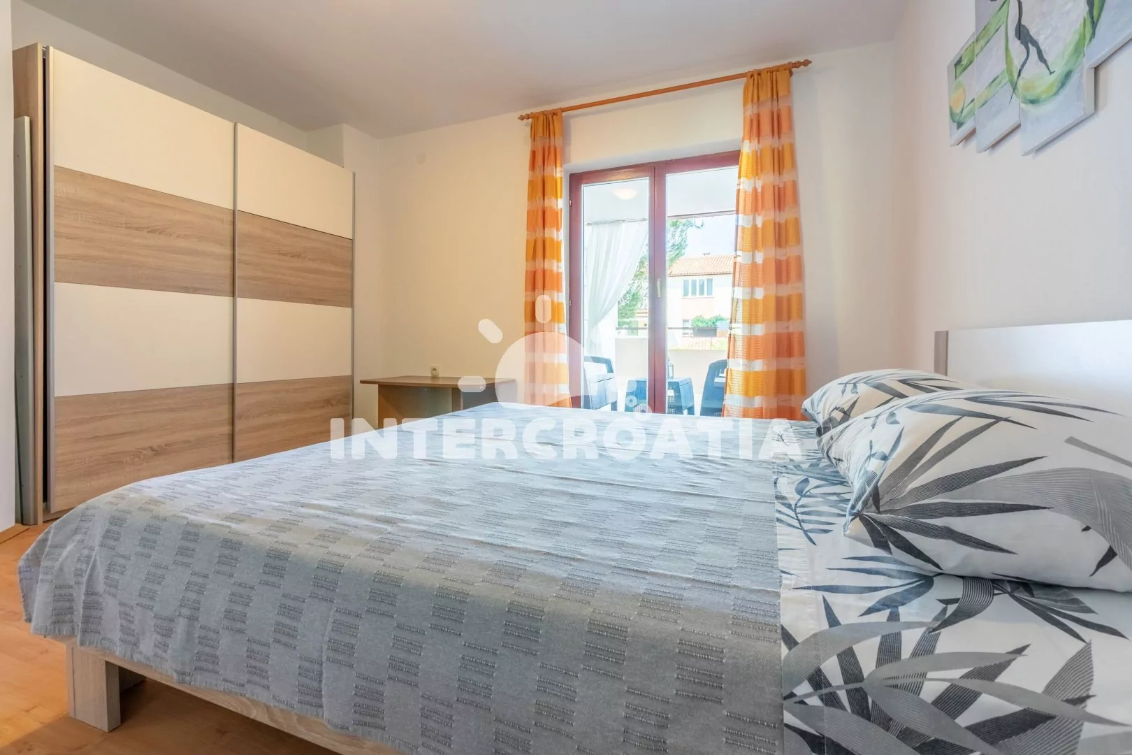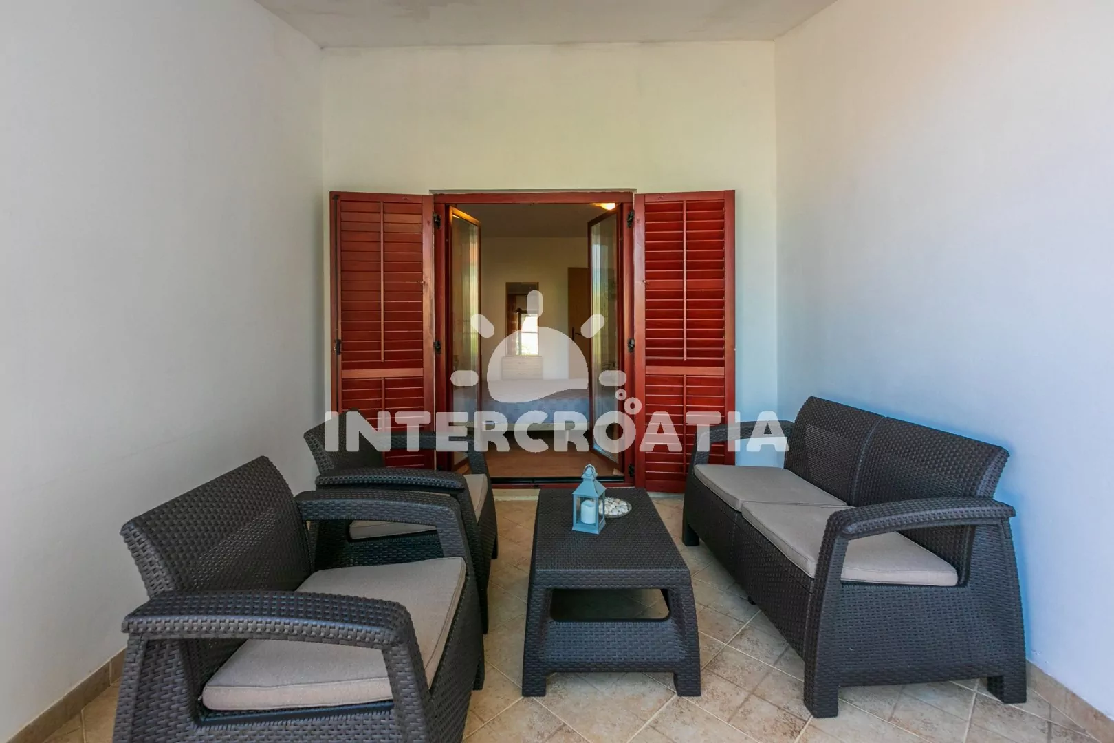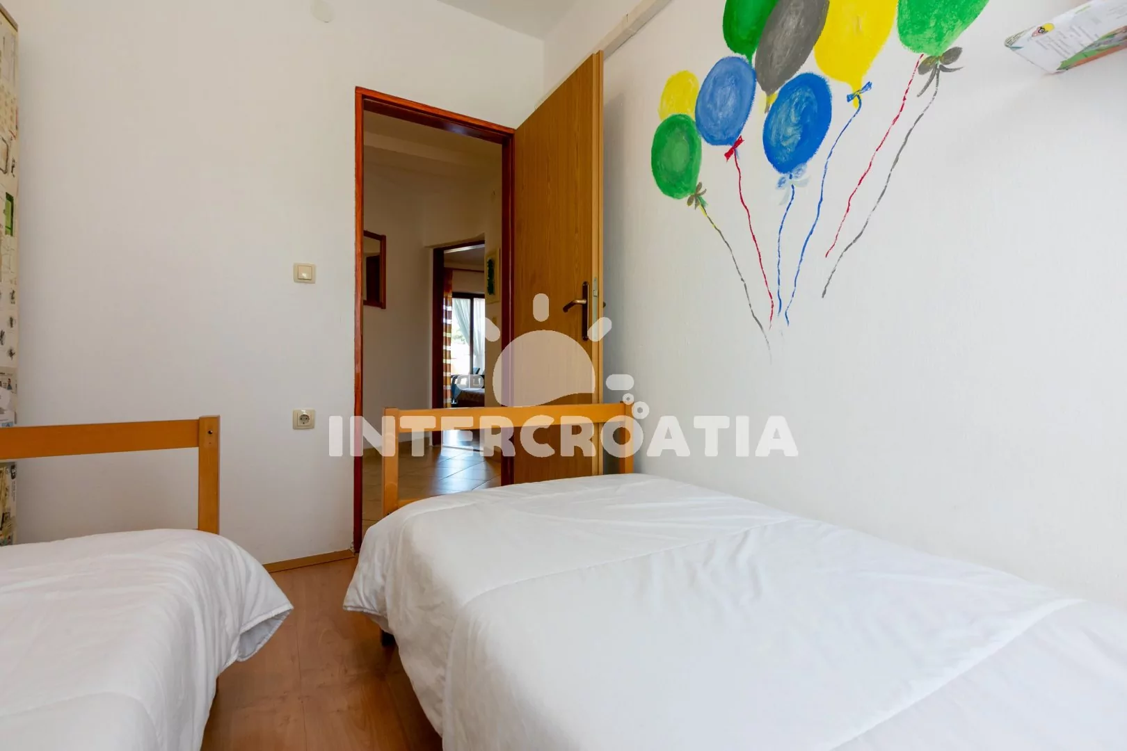 Apartmán (60 m2) v prvním patře domu s terasou, venkovním posezením, výhledem do zahrady a klidné ulice je vhodný pro 3 osoby. Obývací pokoj je spojený s kuchyní. Kuchyňská linka je vybavena sporákem, troubou, digestoří, mikrovlnnou troubou, rychlovarnou konvicí, kávovarem, toustovačem, nádobím a lednicí s mrazákem. Obývací pokoj s jídelním stolem pro 4 osoby, sedací soupravou, televizí se satelitním programem a klimatizací. První ložnice s jedním dvoulůžkem a vstupem na terasu. Druhá ložnice s jednolůžkem. Koupelna se sprchovým koutem, umyvadlem, pračkou, fénem a wc. Hostům je k dispozici parkování u objektu zdarma.