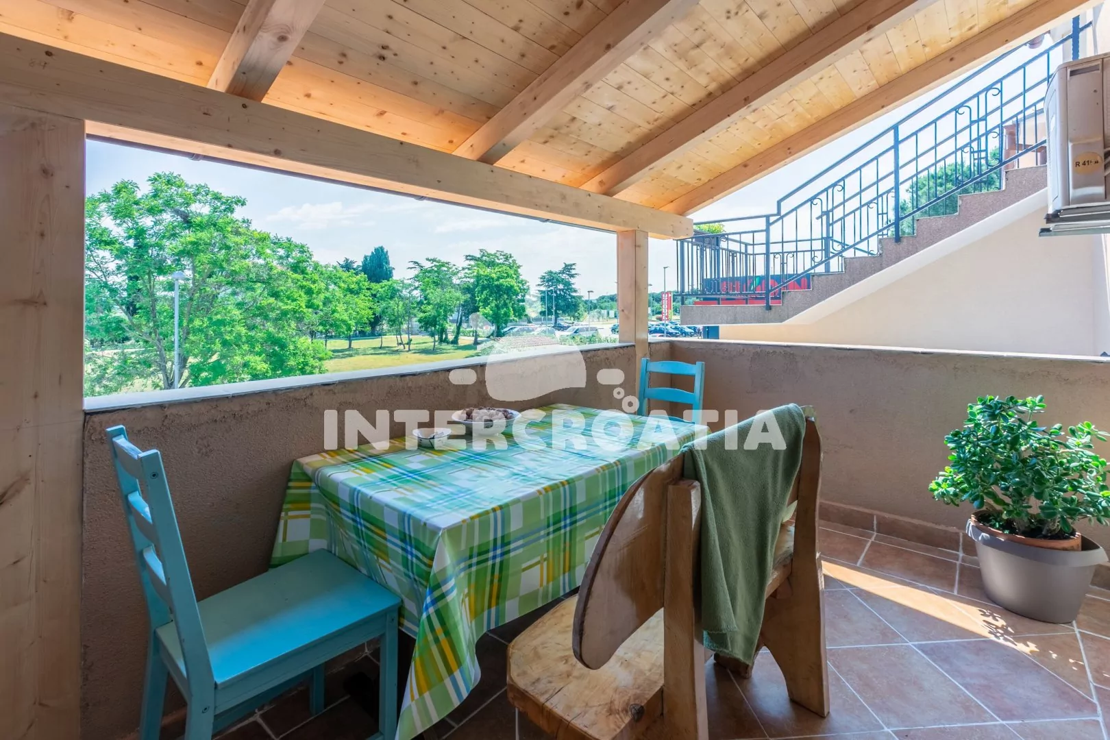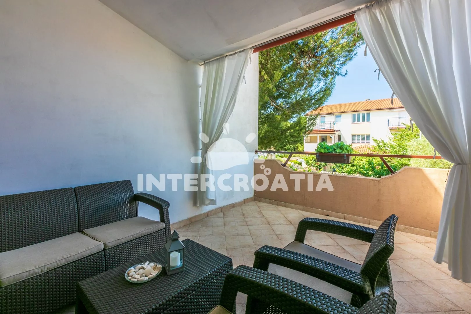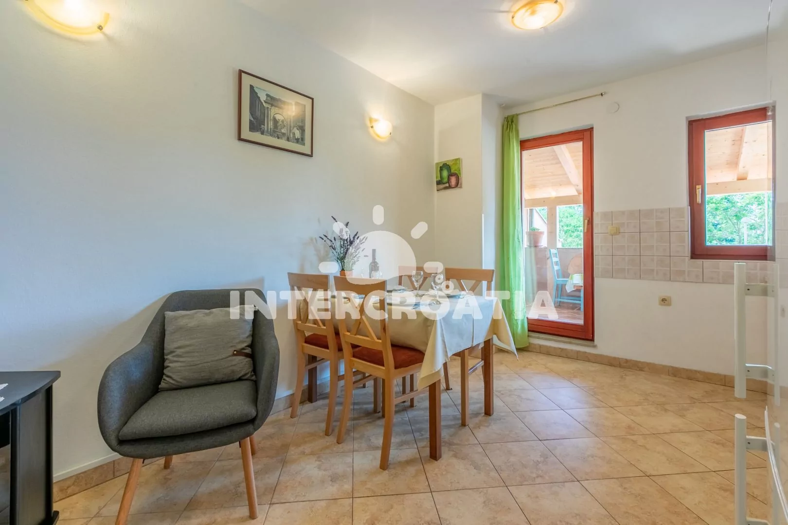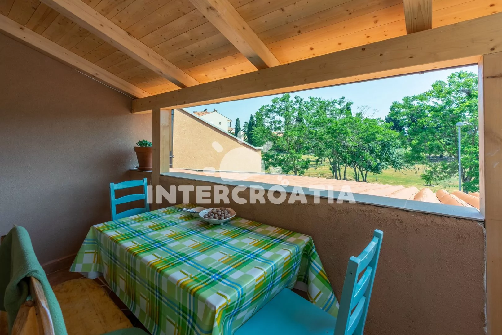 Apartmán (60 m2) v prvním patře domu s terasou, venkovním posezením, výhledem do zahrady a klidné ulice je vhodný pro 3 osoby. Obývací pokoj je spojený s kuchyní. Kuchyňská linka je vybavena sporákem, troubou, digestoří, mikrovlnnou troubou, rychlovarnou konvicí, kávovarem, toustovačem, nádobím a lednicí s mrazákem. Obývací pokoj s jídelním stolem pro 4 osoby, sedací soupravou, televizí se satelitním programem a klimatizací. První ložnice s jedním dvoulůžkem a vstupem na terasu. Druhá ložnice s jednolůžkem. Koupelna se sprchovým koutem, umyvadlem, pračkou, fénem a wc. Hostům je k dispozici parkování u objektu zdarma.