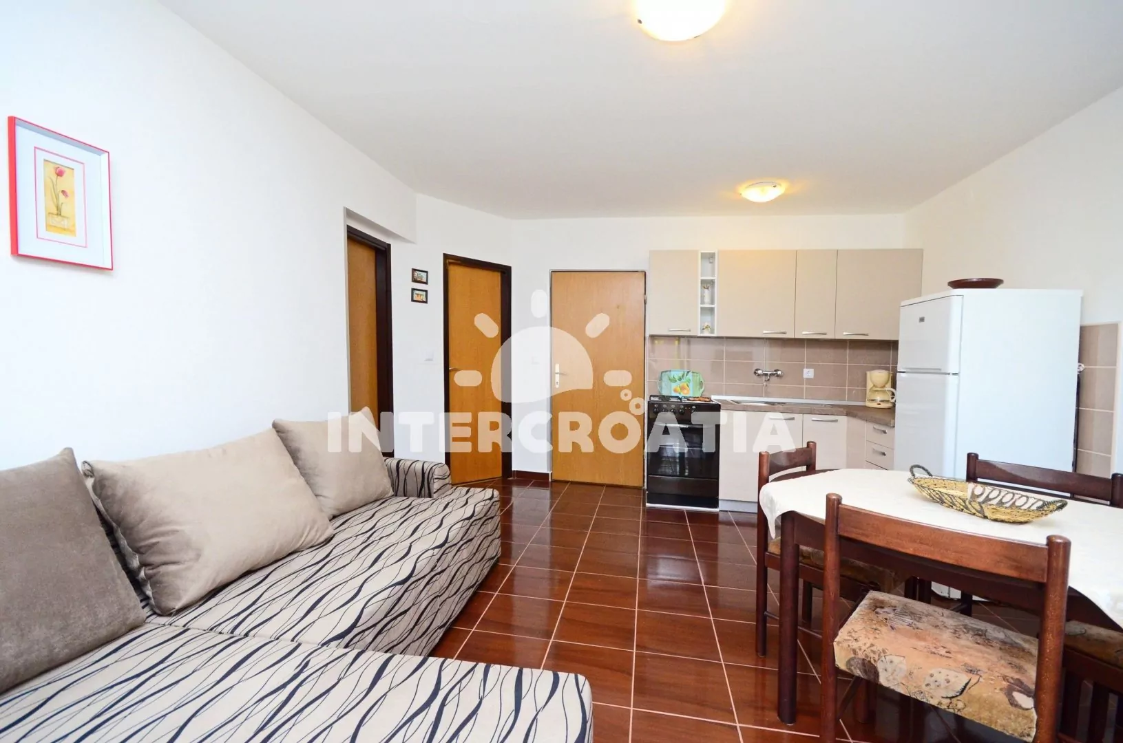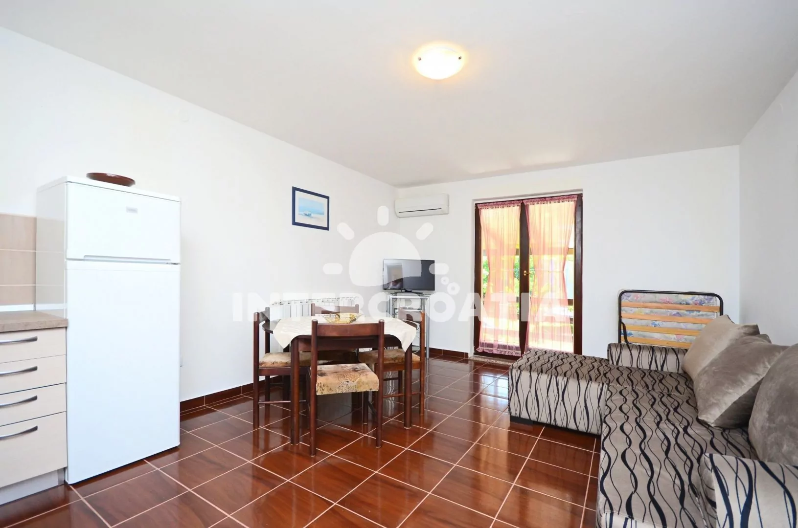 Apartmán (49 m2) s terasou a posezením se nachází v přízemí domu a je vhodný pro 2 až 4 osoby. Obývací pokoj je spojený s kuchyní. Kuchyňská linka je vybavena sporákem s troubou, kávovarem, nádobím a lednicí s mrazákem. Obývací pokoj s jídelním stolem pro 4 osoby, pohovkou (rozložitelná na extra lůžko pro 2 osoby), televizí se satelitním programem, klimatizací a vstupem na terasu. Ložnice s dvoulůžkem. Koupelna se sprchovým koutem, umyvadlem a wc. Hostům je k dispozici parkování u objektu zdarma.