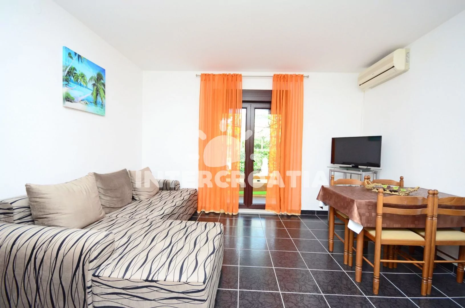 Apartmán (49 m2) s terasou a posezením se nachází v přízemí domu a je vhodný pro 2 až 4 osoby. Obývací pokoj je spojený s kuchyní. Kuchyňská linka je vybavena sporákem s troubou, kávovarem, nádobím a lednicí s mrazákem. Obývací pokoj s jídelním stolem pro 4 osoby, pohovkou (rozložitelná na extra lůžko pro 2 osoby), televizí se satelitním programem, klimatizací a vstupem na terasu. Ložnice s dvoulůžkem. Koupelna se sprchovým koutem, umyvadlem a wc. Hostům je k dispozici parkování u objektu zdarma.