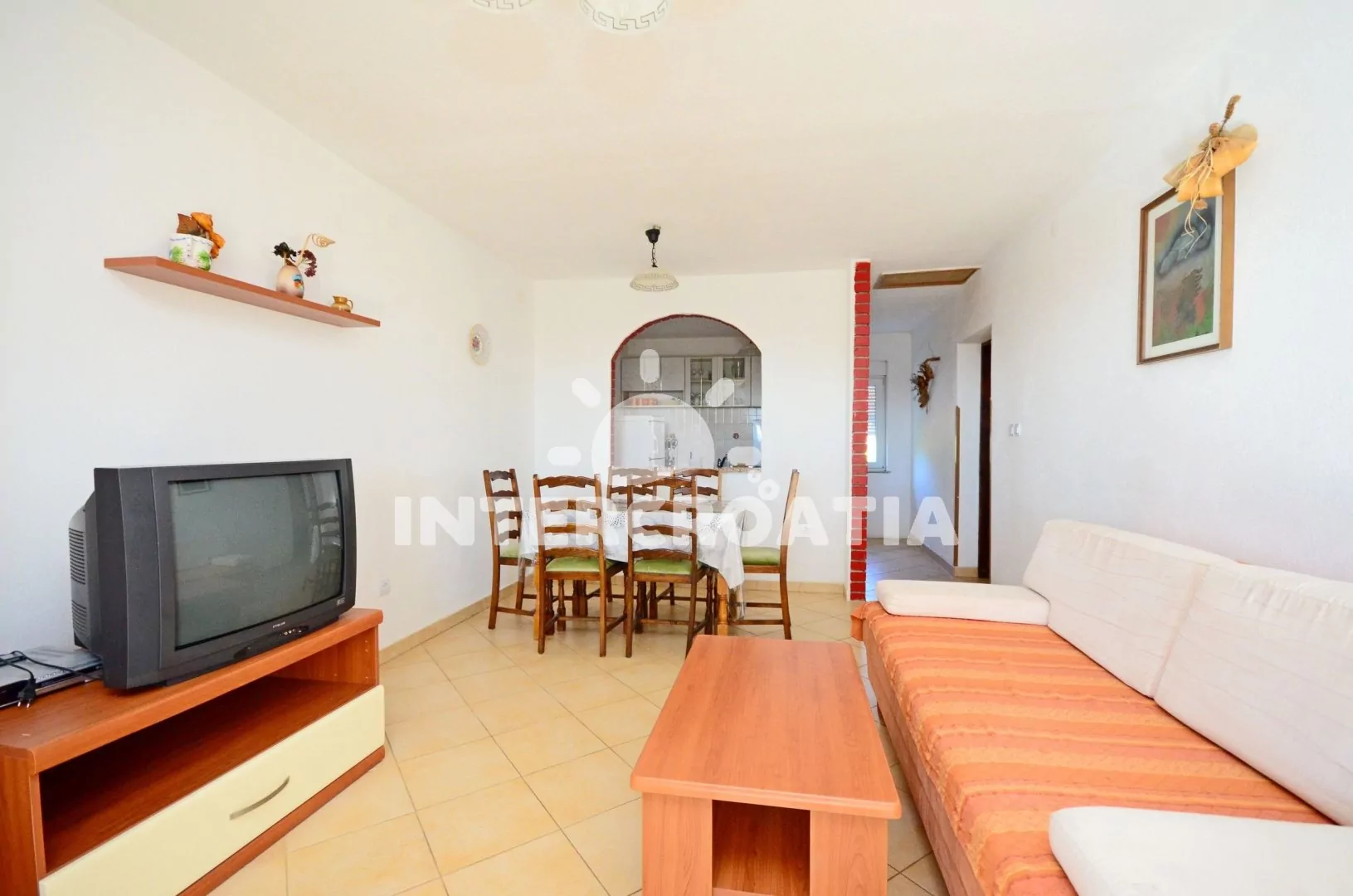 Apartmán (80 m2) s terasou a výhledem na moře se nachází v 1. patře domu a je vhodný pro 5 až 7 osob. Obývací pokoj je spojený s kuchyní. Kuchyňská linka je vybavena sporákem s troubou, kávovarem,…