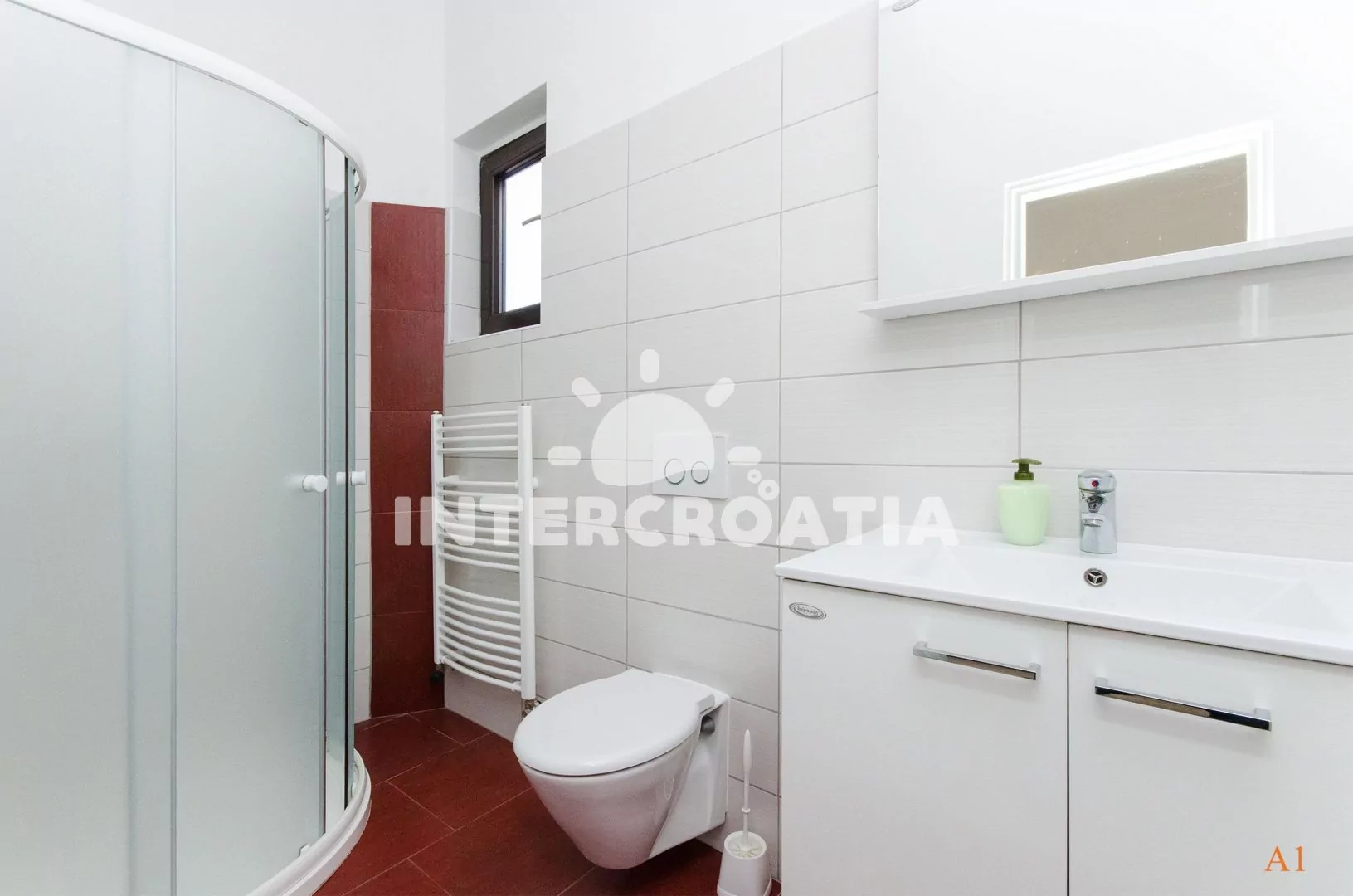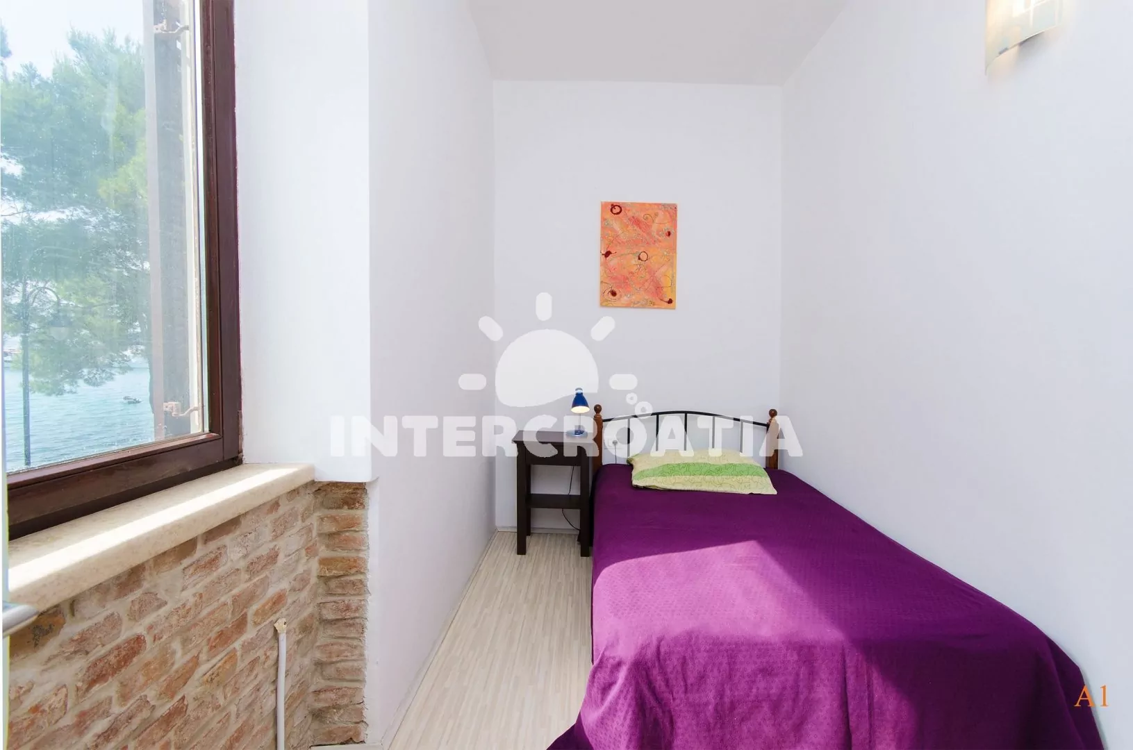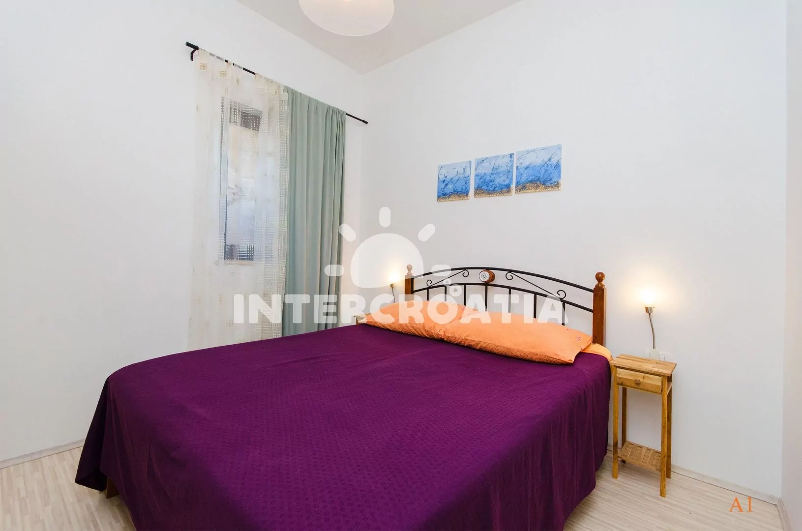 Apartmán (60 m2) s výhledem na moře a do klidné ulice se nachází v 1. patře domu a je vhodný pro 4 až 5 osob. Obývací pokoj je spojený s kuchyní. Kuchyňská linka je vybavena varnou deskou, digestoří, rychlovarnou konvicí, kávovarem, nádobím a lednicí s mrazákem. Obývací pokoj s jídelním stolem pro 4 osoby, rohovou pohovkou (rozložitelná na extra lůžko pro 1 osobu), televizí se satelitním programem a klimatizací. První ložnice s dvoulůžkem. Druhá ložnice s jedním jednolůžkem. Třetí ložnice rovněž s jedním jednolůžkem. Koupelna se sprchovým koutem, umyvadlem, pračkou a wc.