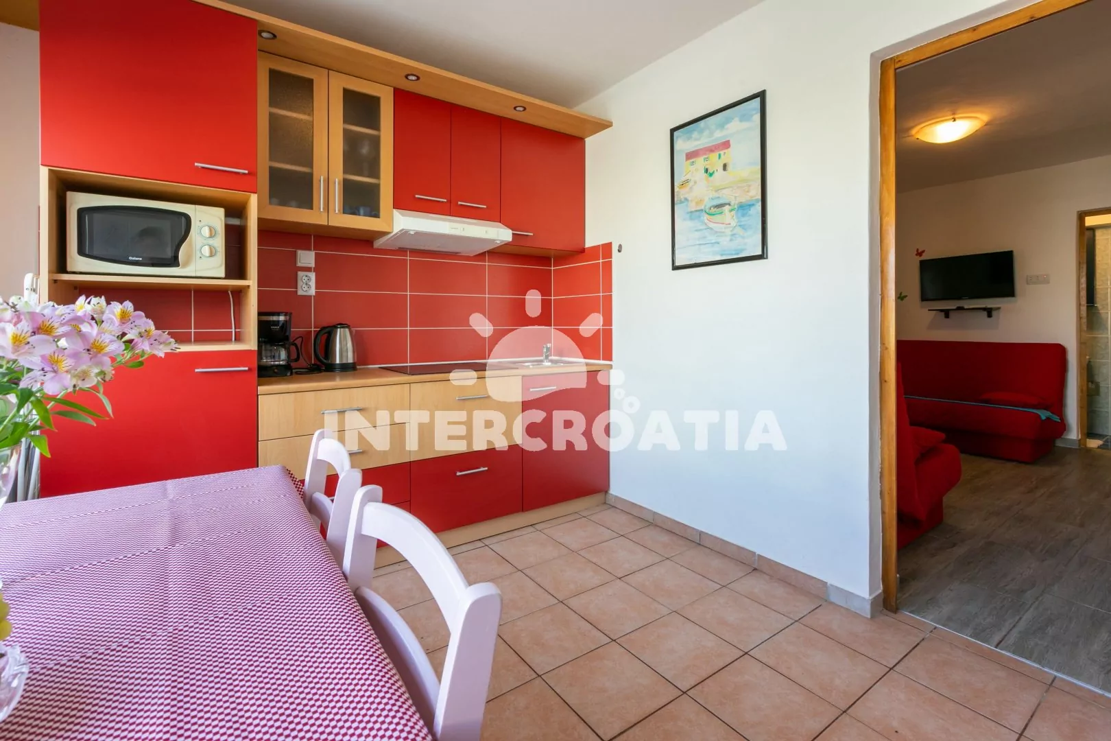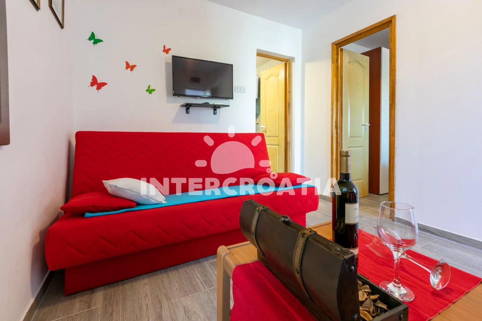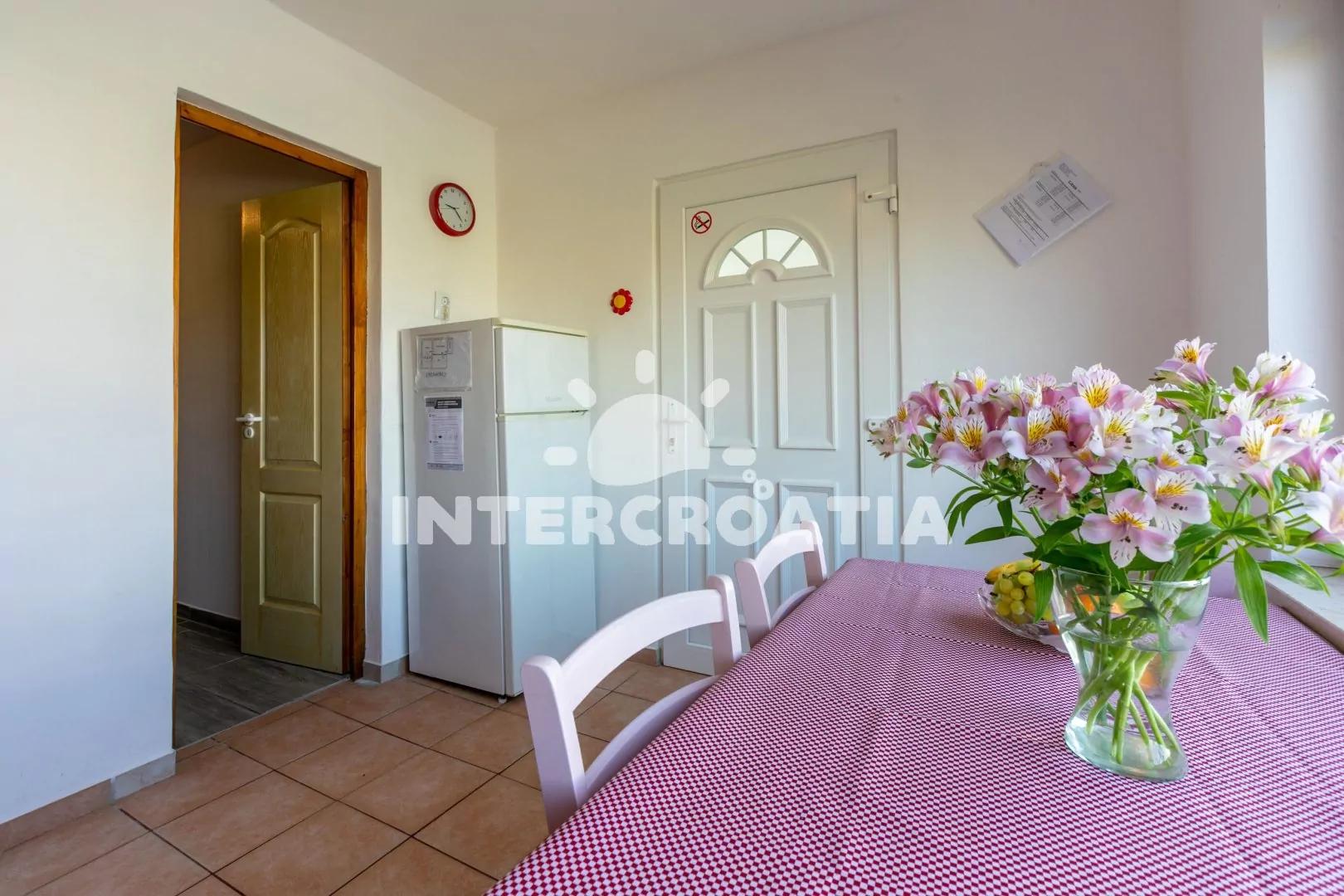 Apartmán (40 m2) s terasou a výhledem do zahrady se nachází v přízemí vily. Apartmán má 1 ložnice a je vhodný pro 2 až 4 osoby. Vstup: Kuchyň s jídelním stolem pro 4 osoby a kuchyňskou linkou. Kuchyňská linka je vybavena sklokeramickou varnou deskou, digestoří, mikrovlnnou troubou, rychlovarnou konvicí, kávovarem, toustovačem, nádobím a lednicí s mrazákem. Obývací pokoj s dvěma pohovkami (rozložitelná na extra lůžko pro 2 osoby), televizí se satelitním programem a klimatizací. Ložnice s jedním dvoulůžkem. Koupelna se sprchovým koutem, umyvadlem, fénem a wc. Hostům je k dispozici parkování u objektu zdarma.