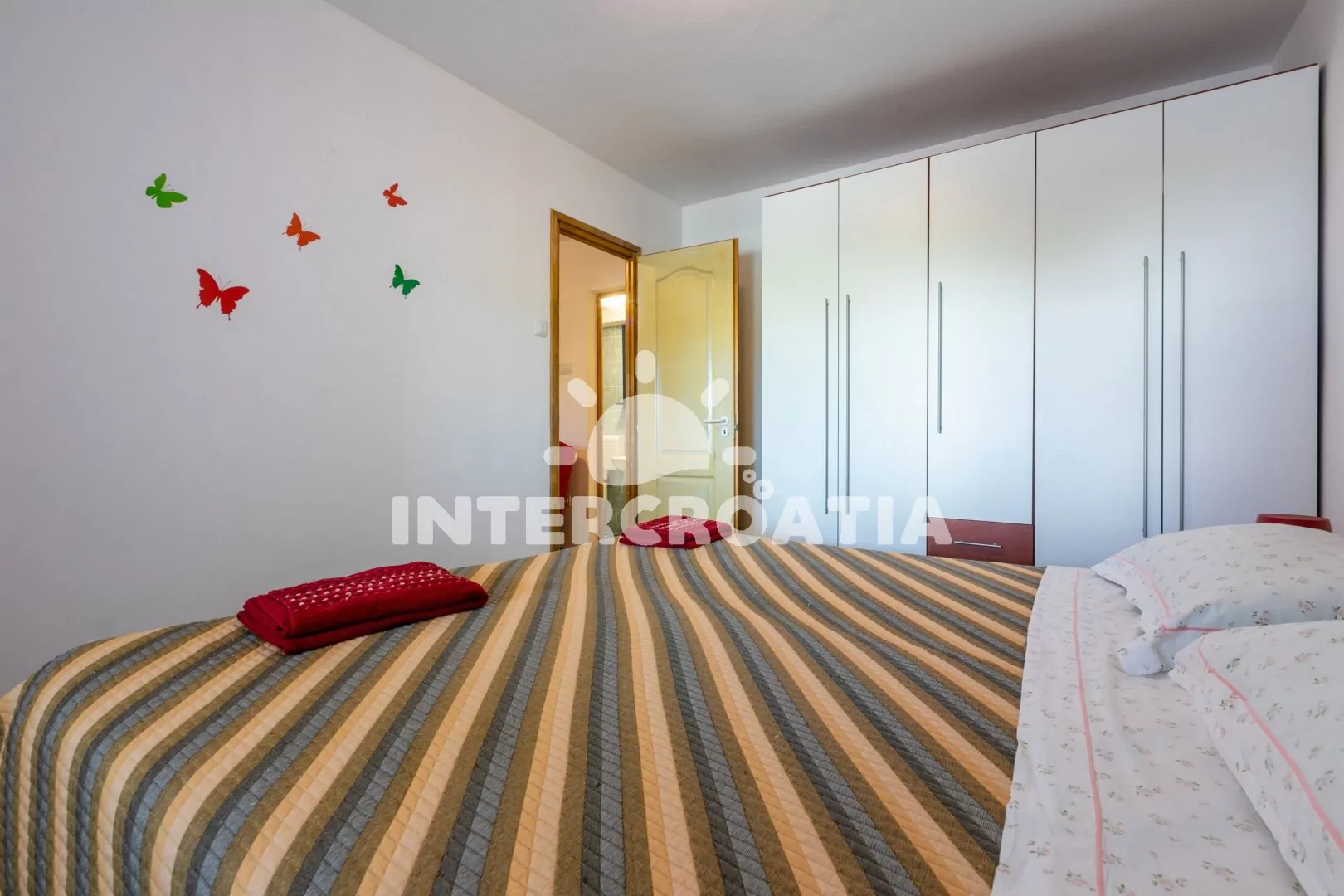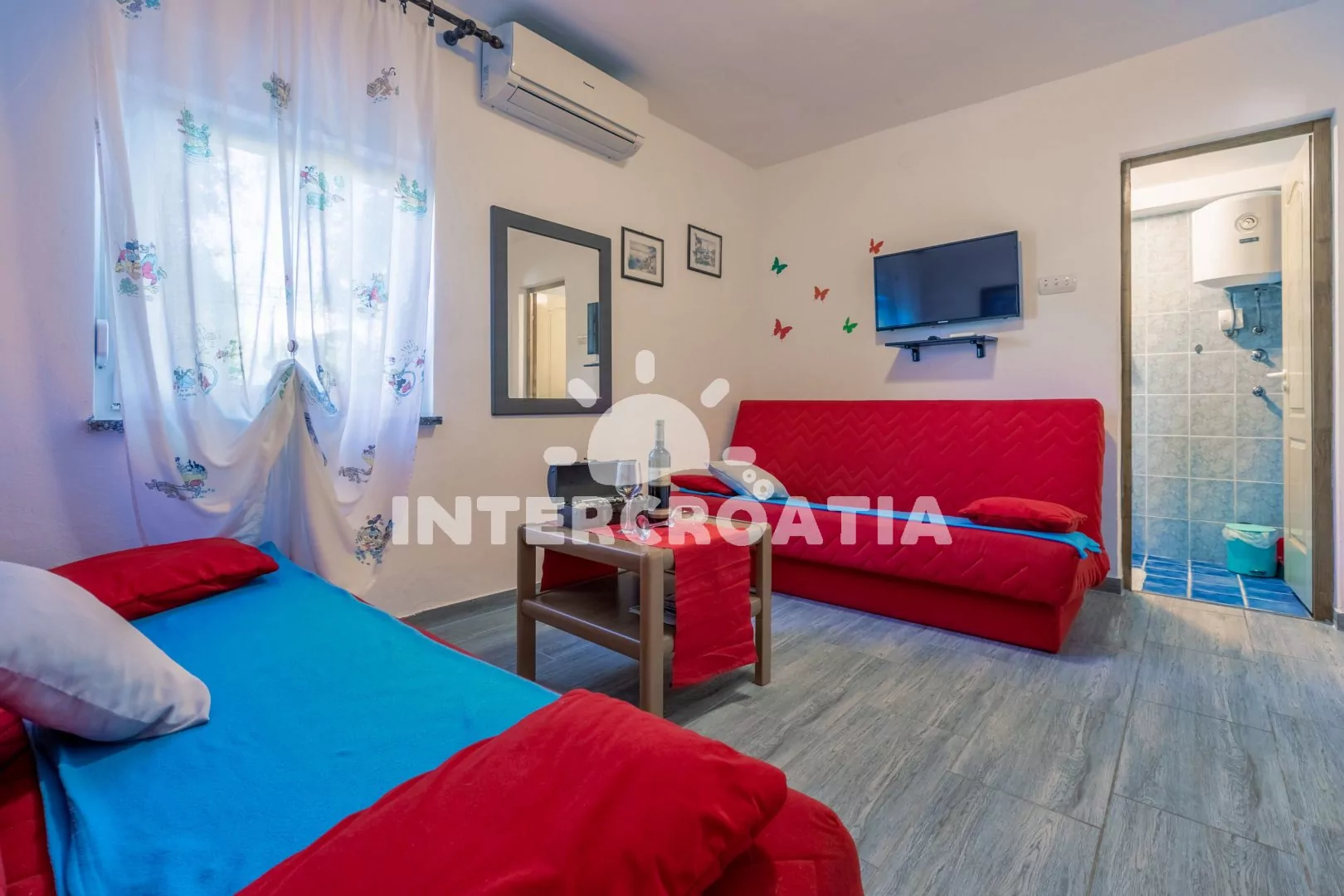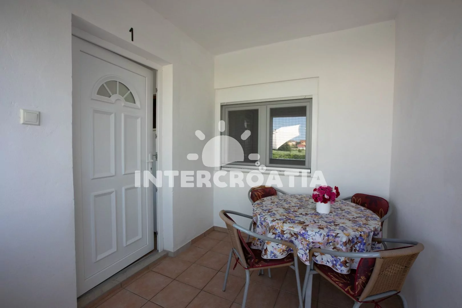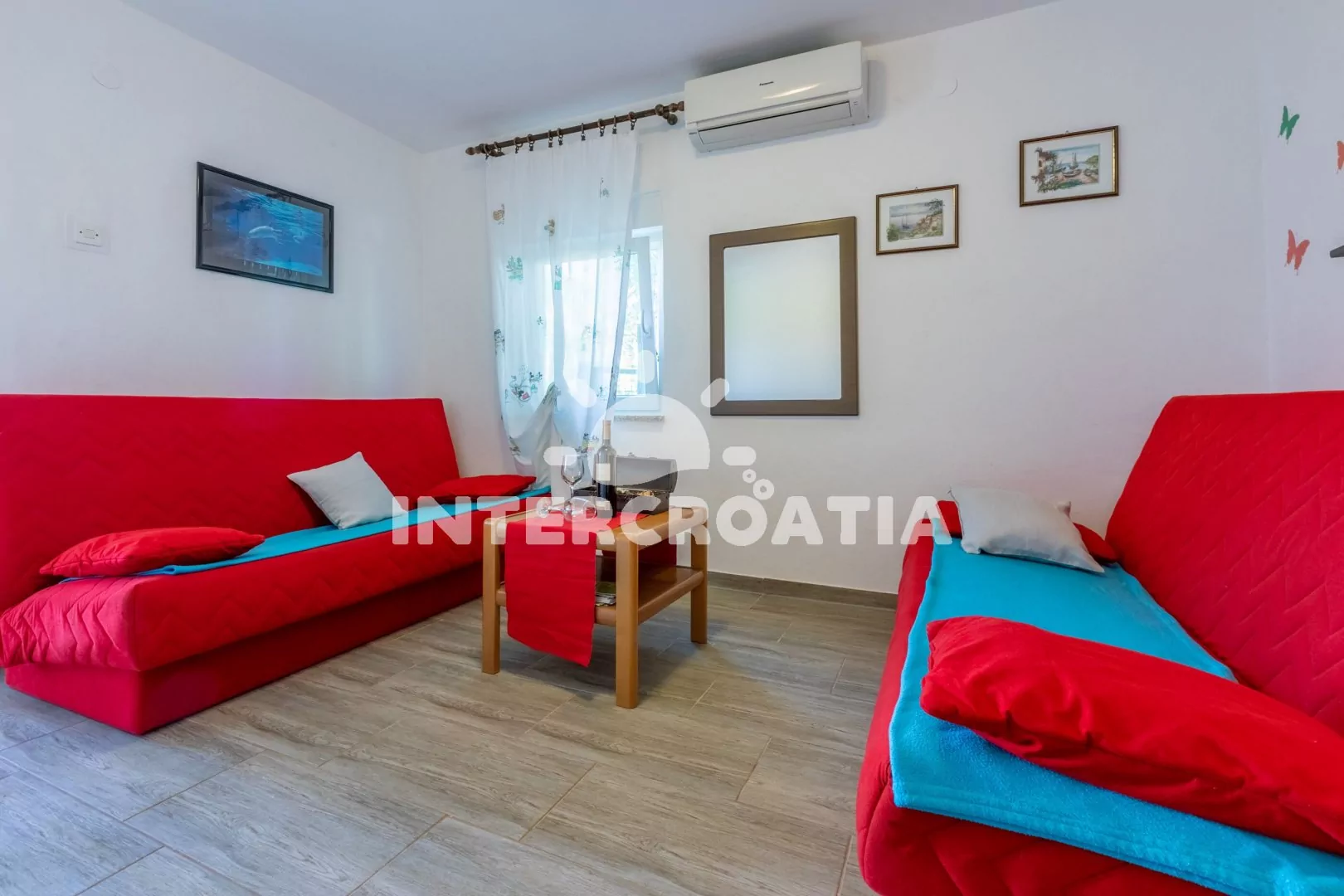 Apartmán (40 m2) s terasou a výhledem do zahrady se nachází v přízemí vily. Apartmán má 1 ložnice a je vhodný pro 2 až 4 osoby. Vstup: Kuchyň s jídelním stolem pro 4 osoby a kuchyňskou linkou. Kuchyňská linka je vybavena sklokeramickou varnou deskou, digestoří, mikrovlnnou troubou, rychlovarnou konvicí, kávovarem, toustovačem, nádobím a lednicí s mrazákem. Obývací pokoj s dvěma pohovkami (rozložitelná na extra lůžko pro 2 osoby), televizí se satelitním programem a klimatizací. Ložnice s jedním dvoulůžkem. Koupelna se sprchovým koutem, umyvadlem, fénem a wc. Hostům je k dispozici parkování u objektu zdarma.