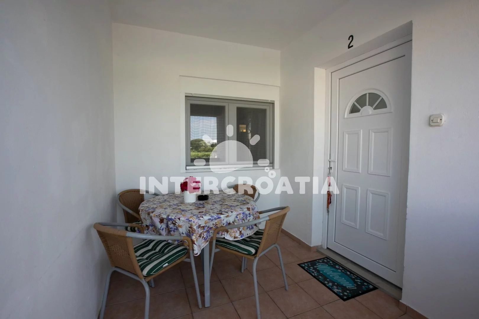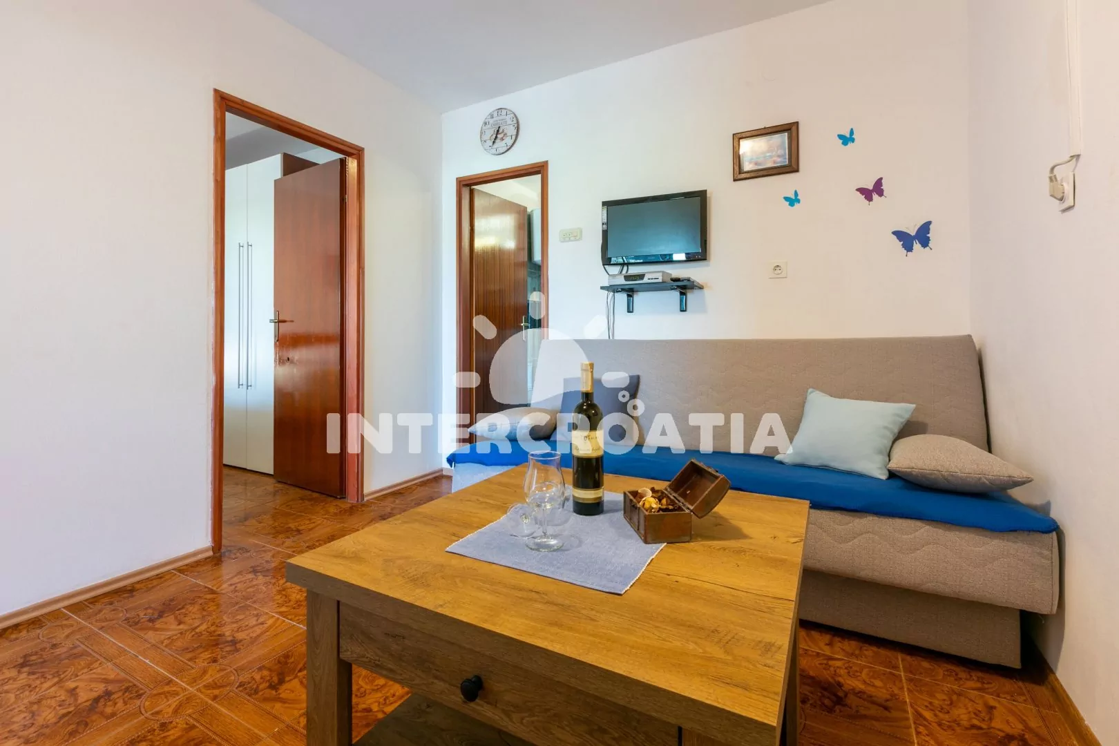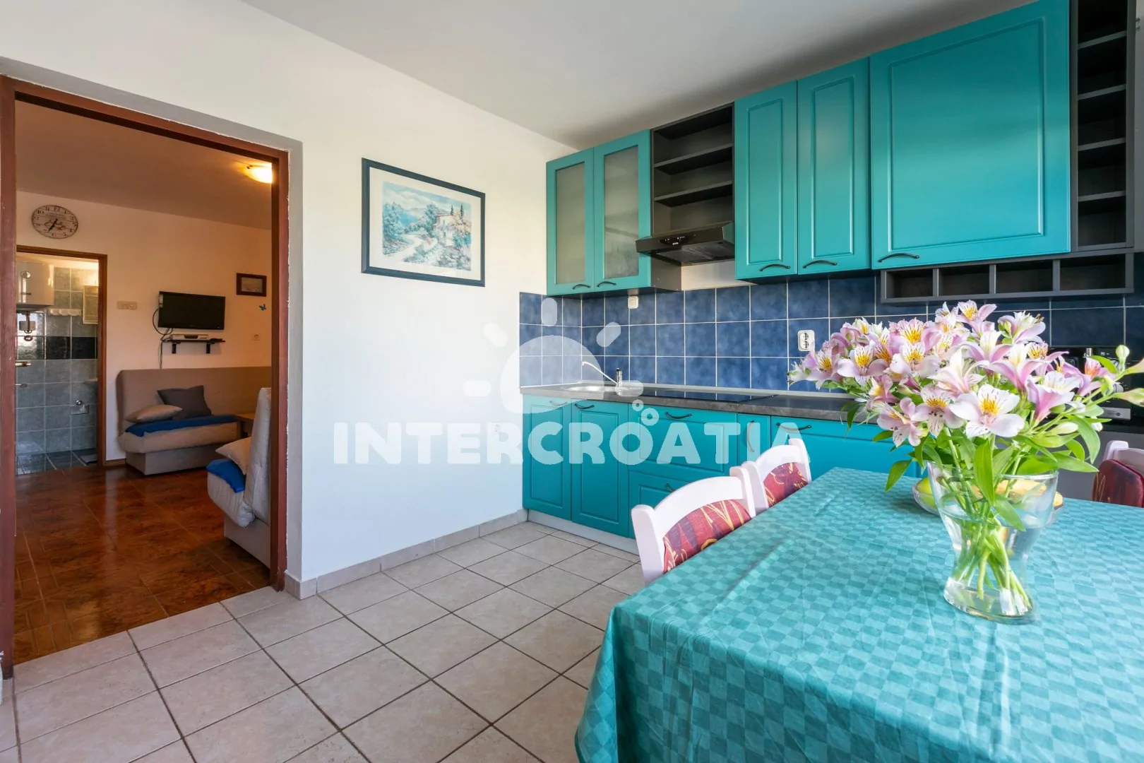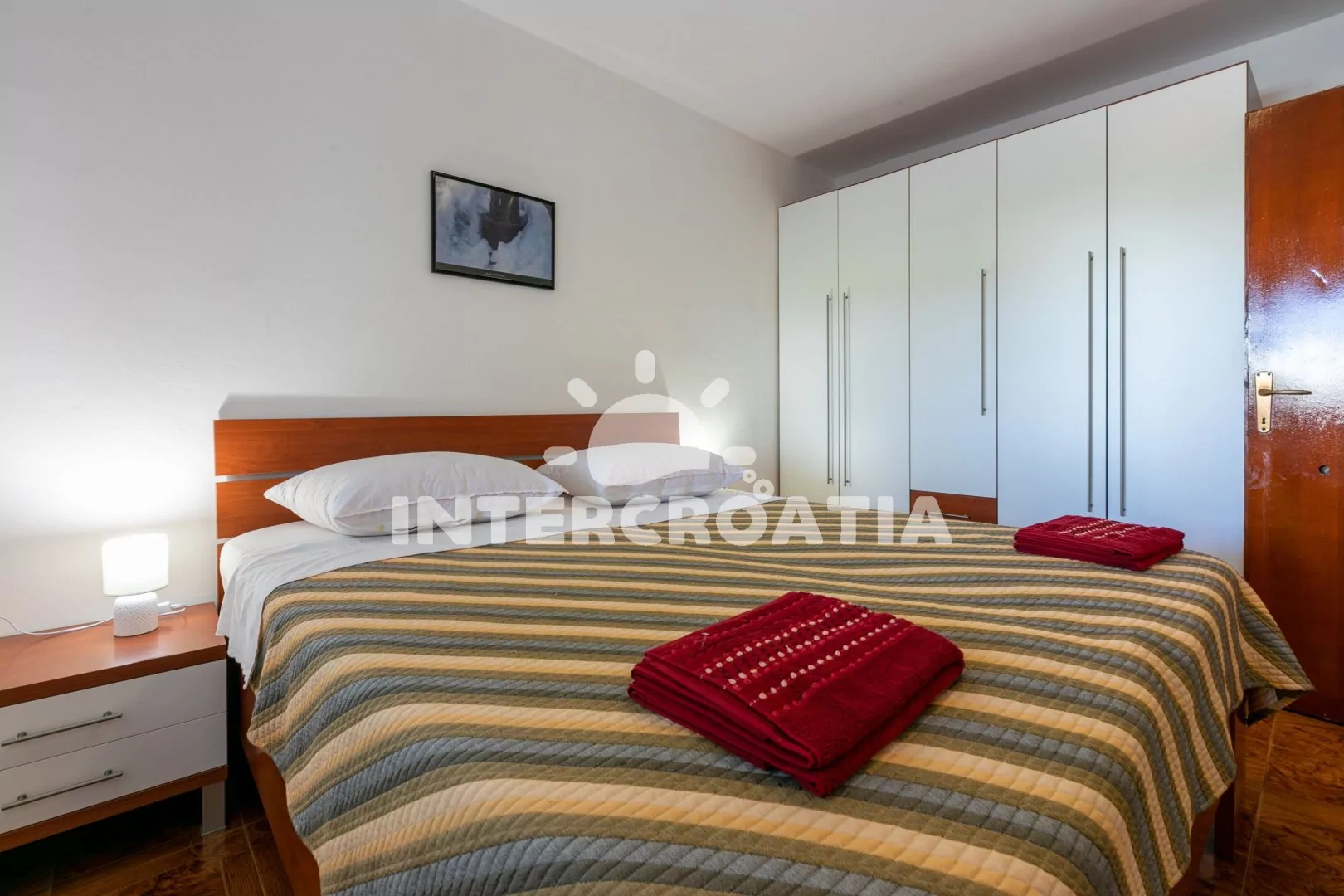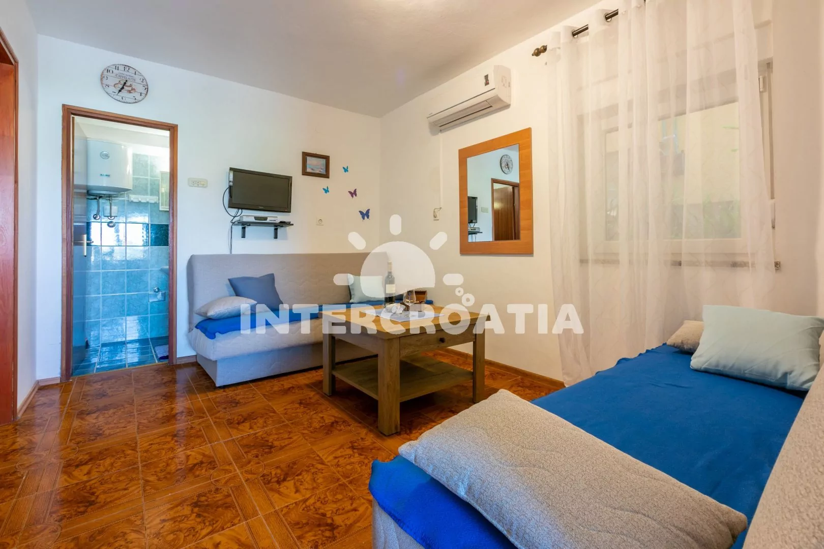 Apartmán (37 m2) s terasou a výhledem do zahrady se nachází v přízemí vily. Apartmán má 1 ložnice a je vhodný pro 2 až 4 osoby. Vstup: Kuchyň s jídelním stolem pro 4 osoby a kuchyňskou linkou. Kuchyňská linka je vybavena sklokeramickou varnou deskou, digestoří, mikrovlnnou troubou, rychlovarnou konvicí, kávovarem, toustovačem, nádobím a lednicí s mrazákem. Obývací pokoj s dvěma pohovkami (rozložitelná na extra lůžko pro 2 osoby), televizí se satelitním programem a klimatizací. Ložnice s jedním dvoulůžkem. Koupelna se sprchovým koutem, umyvadlem, fénem a wc. Hostům je k dispozici parkování u objektu zdarma.