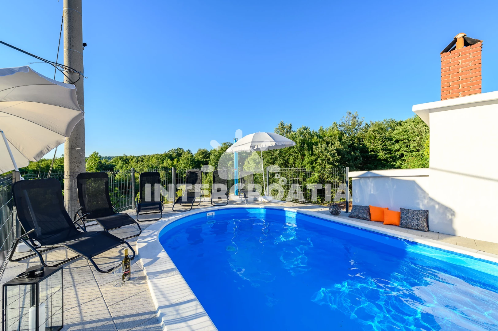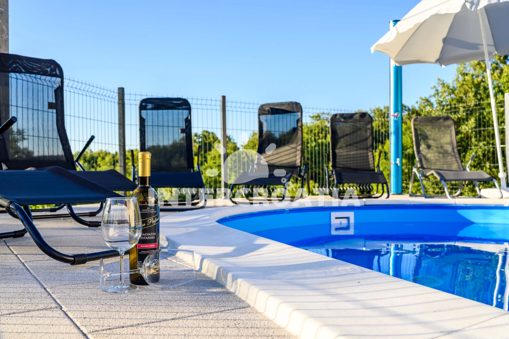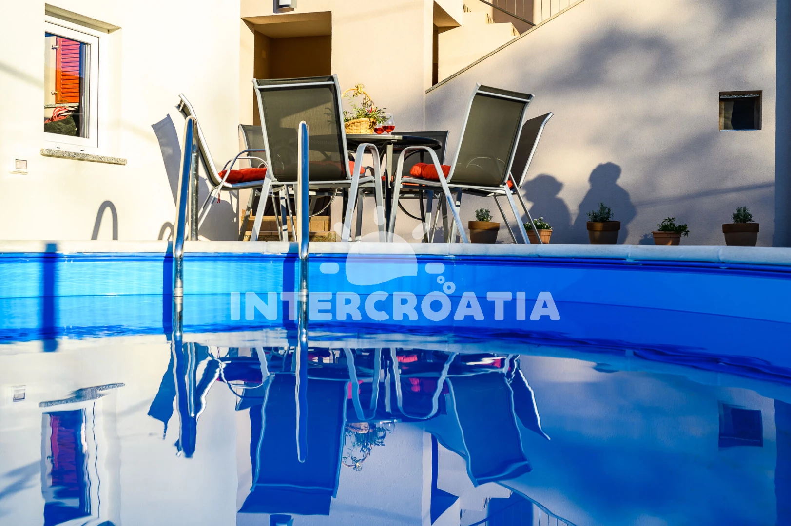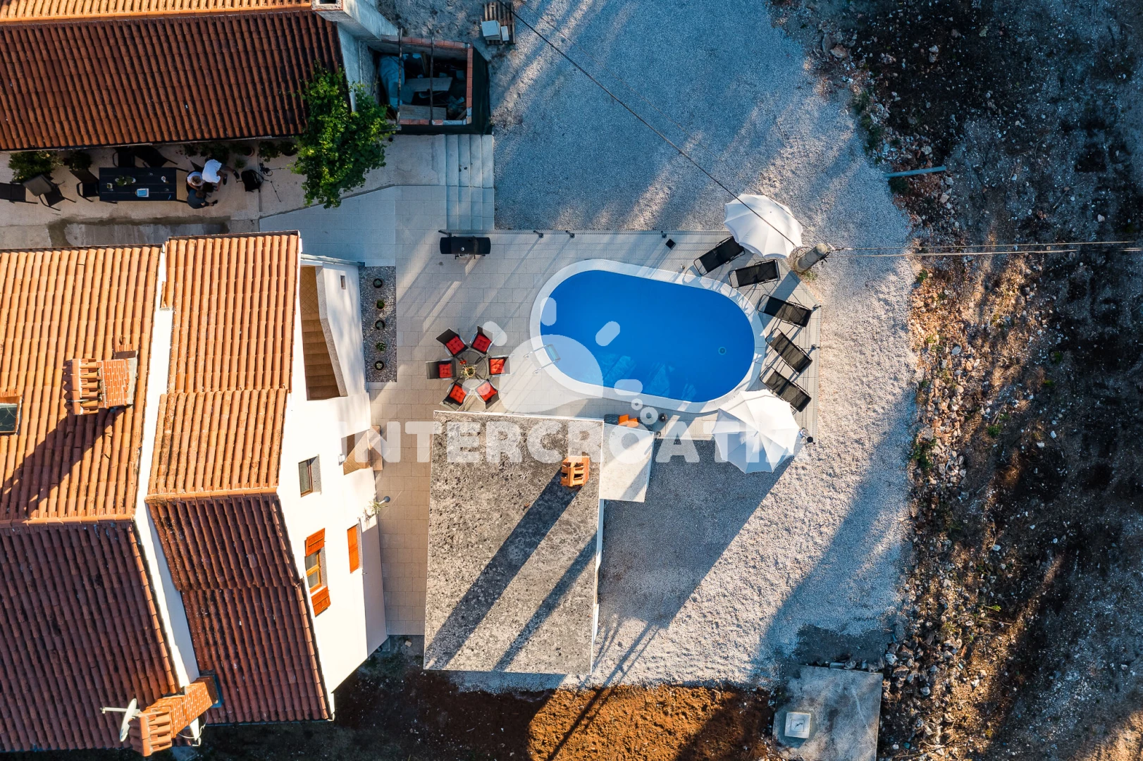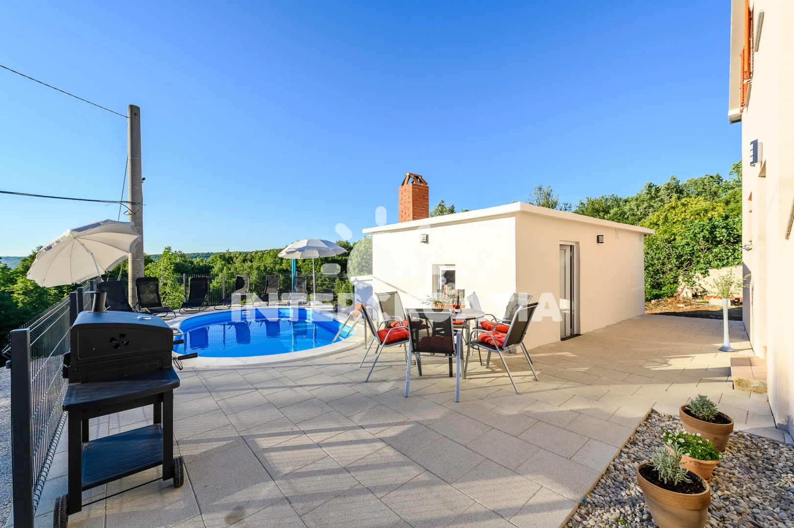 Apartmán se nachází 13200 m od moře a pláže. Pláž je skalnatá, oblázková, větší kamení a betonové desky. Apartmán disponuje bazénem s lehátky pro ubytované hosty. U objektu je k dispozici společná zahrada s posezením a grilem. Parkování je před domem.