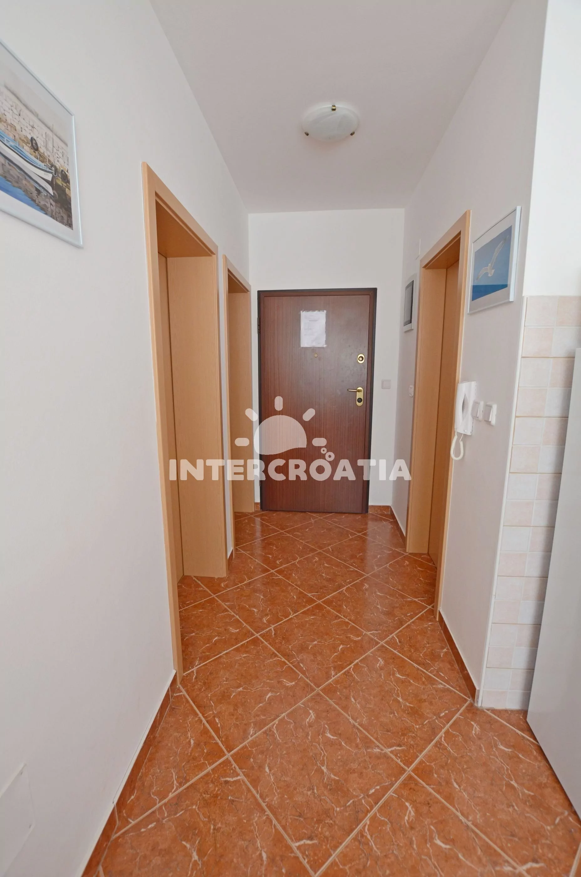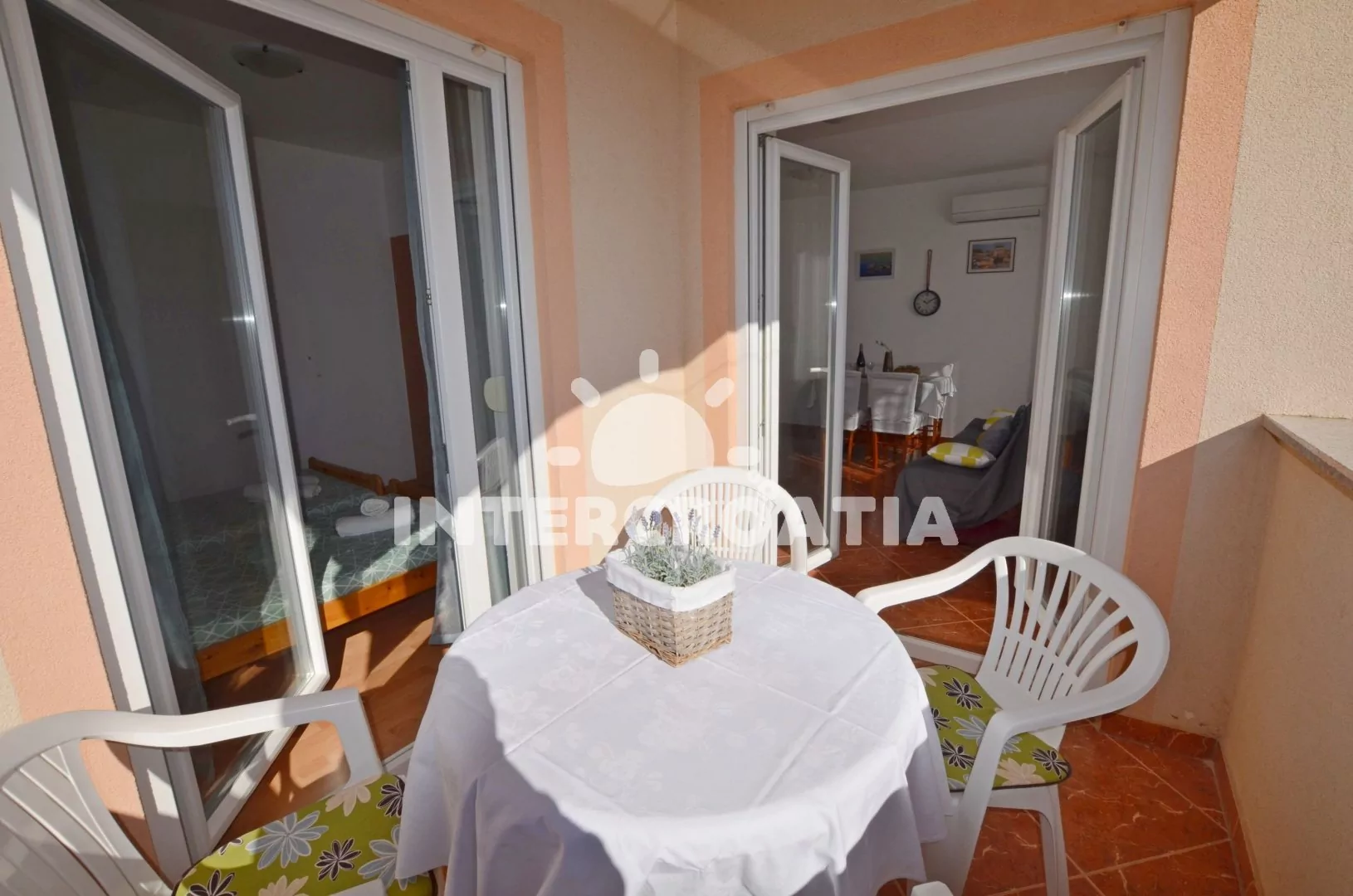 Apartmán pro až 4 osoby se nachází v prvním patře domu. Obývací pokoj je spojený s kuchyní. Kuchyňská linka s elektrickým dvouplotýnkovým sporákem, digestoří, mikrovlnnou troubou, rychlovarnou konvicí, toustovačem, kávovarem, nádobím a lednicí s mrazákem. Obývací pokoj s jídelním stolem pro 4 osoby, pohovkou, televizí, klimatizací a vstupem na balkon. První ložnice je vybavena dvěma lůžky. Druhá ložnice s dvěma lůžky a vstupem na balkon. Koupelna je vybavena sprchovým koutem, umyvadlem, pračkou, bidetem a wc. Hostům je k dispozici parkování u objektu zdarma.