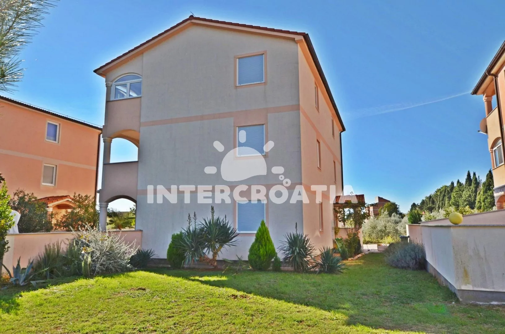 Dům s vlastním pozemkem, balkonem a venkovním posezením se nachází na okraji města Medulin.