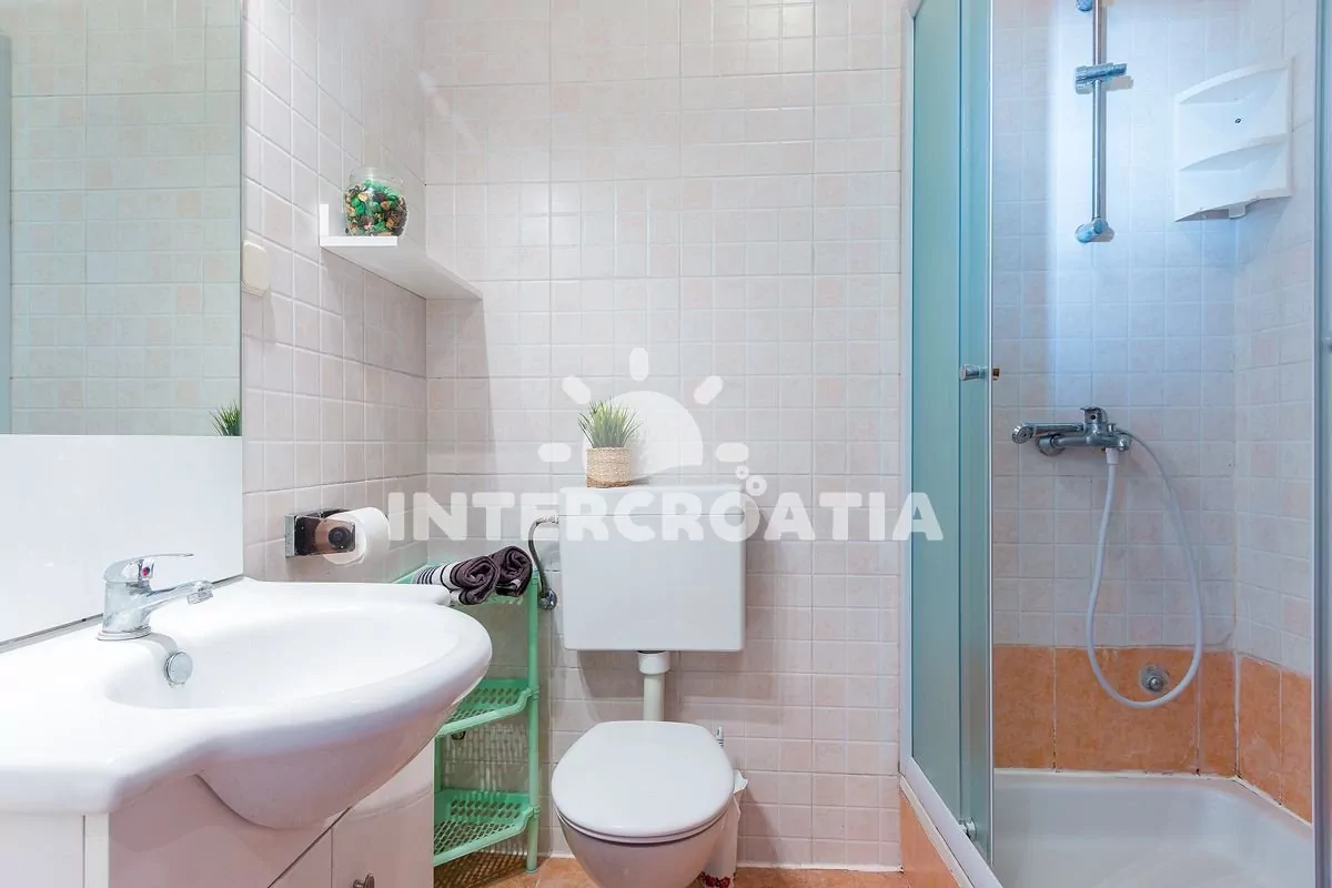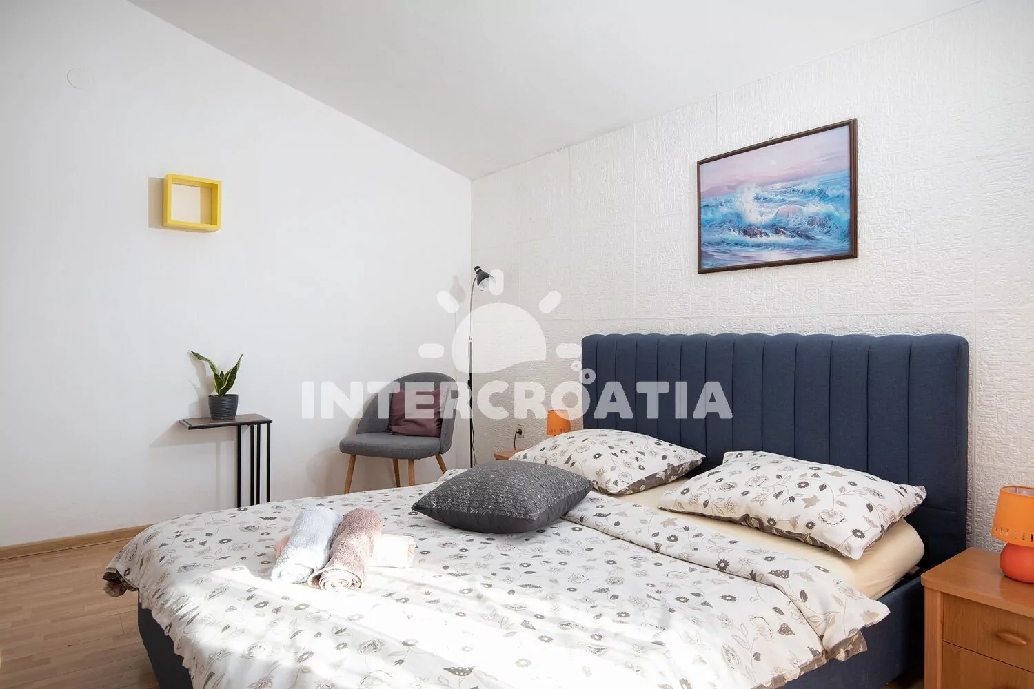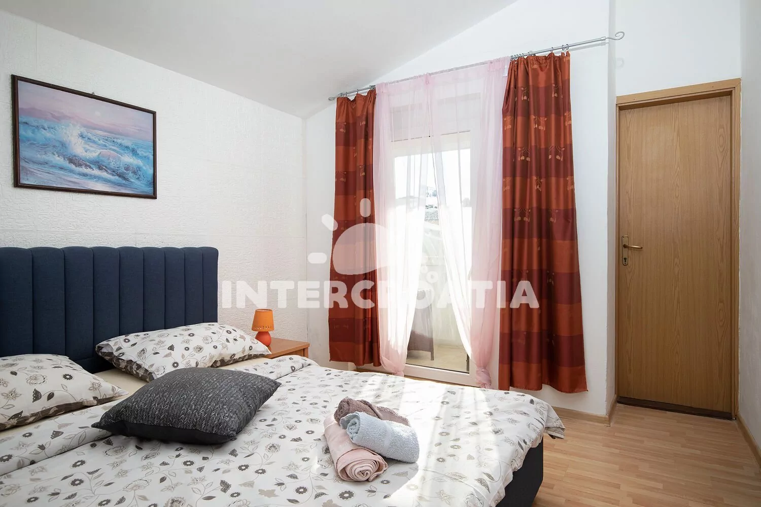 Moderně zařízený apartmán s lodžií a výhledem na moře, nachází se v druhém patře domu a je vhodný pro 4 až 5 osob. Obývací pokoj je spojený s kuchyní. Kuchyňská linka je vybavena sporákem, mikrovlnnou troubou, kávovarem, rychlovarnou konvicí, nádobím a lednicí s mrazákem. Obývací pokoj s jídelním stolem pro 4 osoby, pohovkou (rozložitelná na extra lůžko pro 1 osobu), televizí se satelitním programem a klimatizací. První i druhá ložnice je vybavena vždy s jedním dvoulůžkem a vstupem na balkon. První i druhá koupelna je vybavena sprchovým koutem, umyvadlem a wc. Hostům je k dispozici parkování u objektu zdarma.