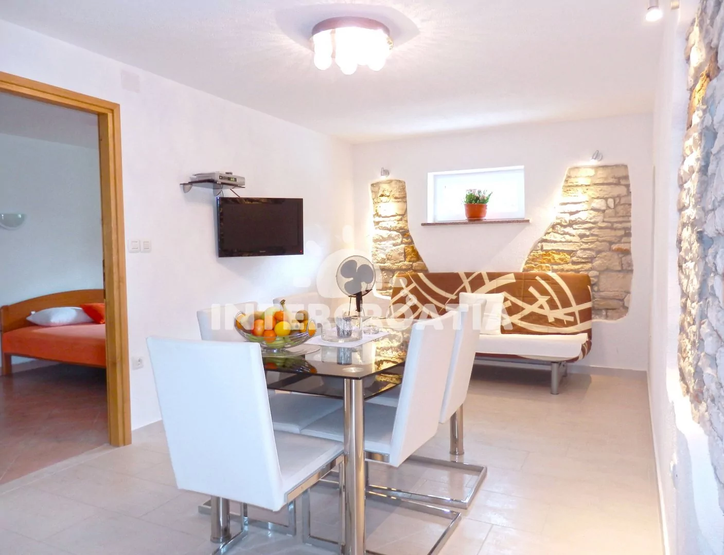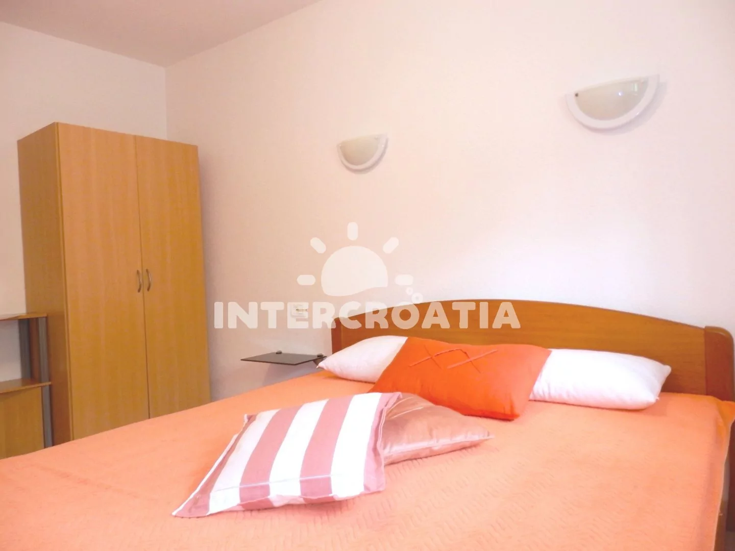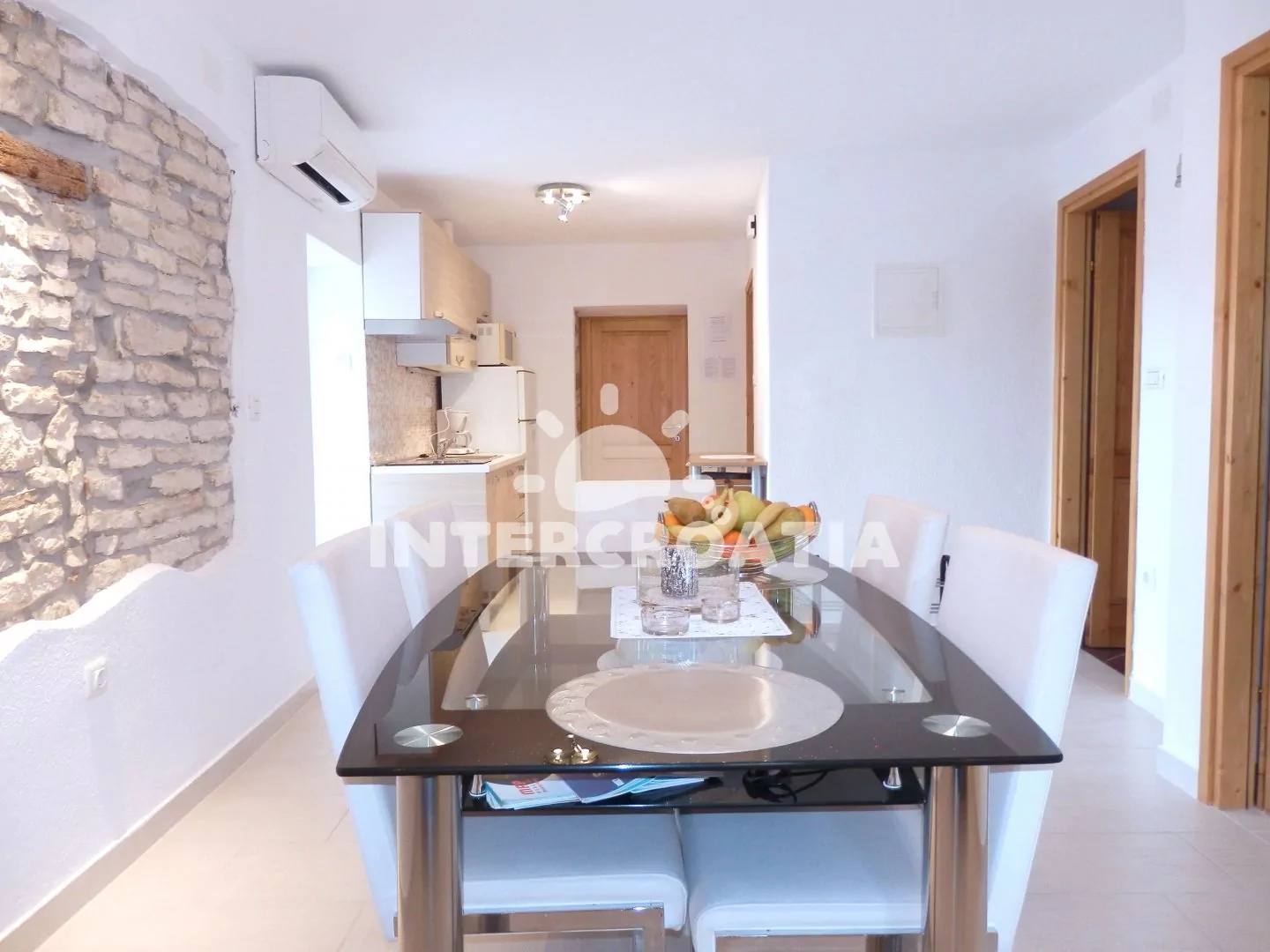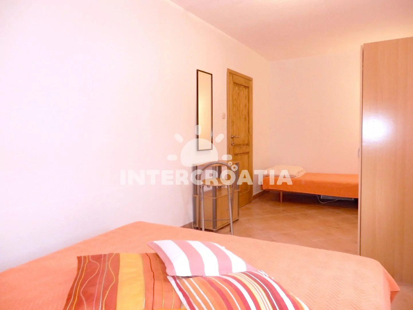 Apartmán (60 m2) s terasou se nachází v prvním patře vily a je vhodný pro 4 až 5 osob. Obývací pokoj je spojený s kuchyní. Kuchyňská linka je vybavena dvouplotýnkovým sporákem, digestoří,…
