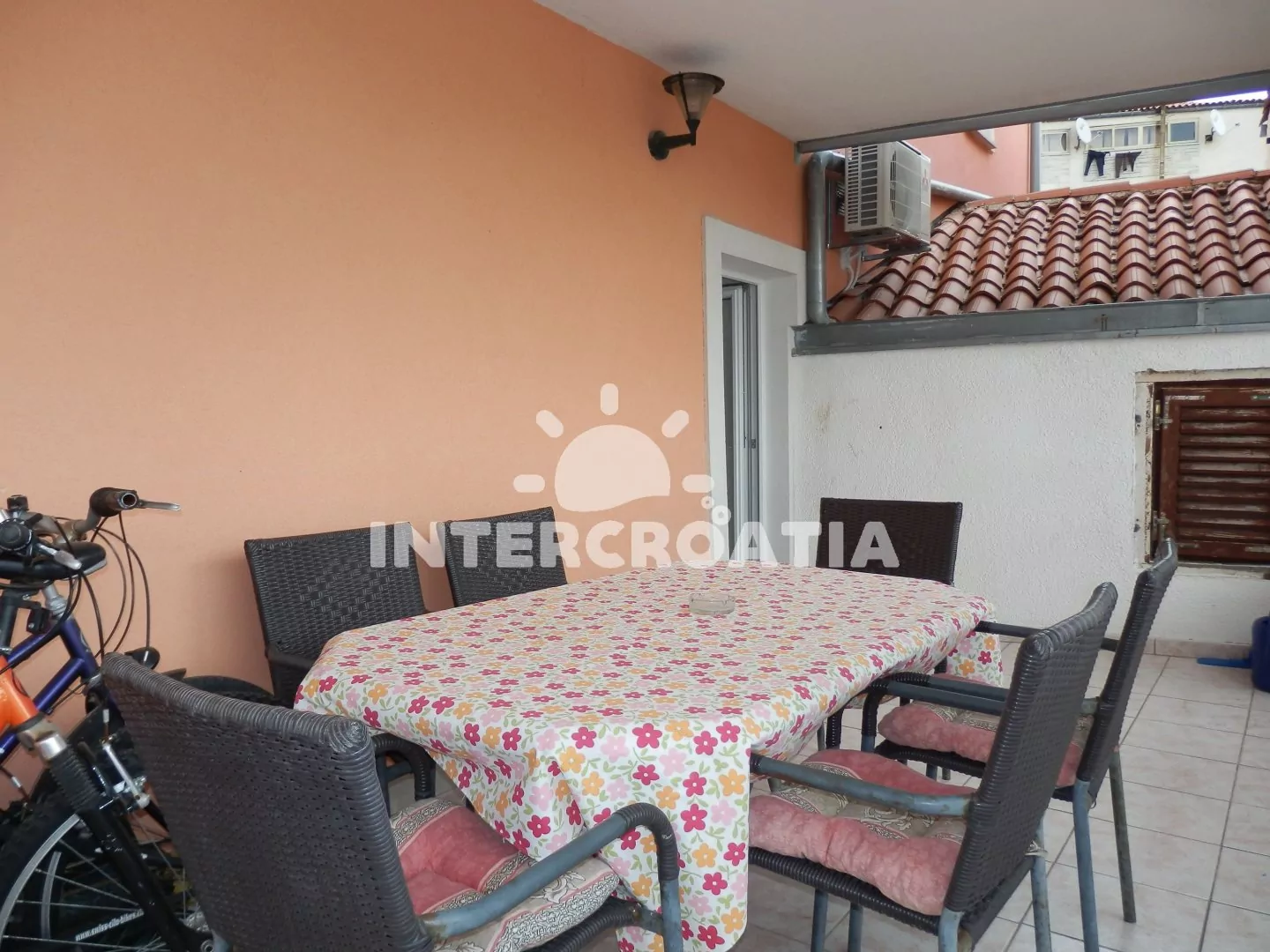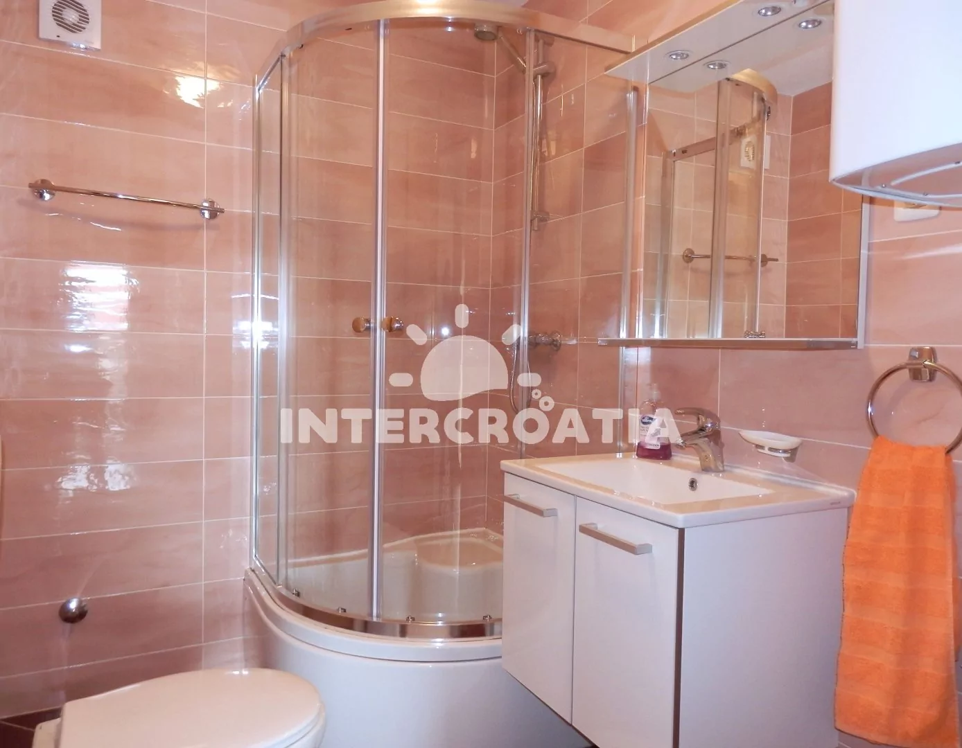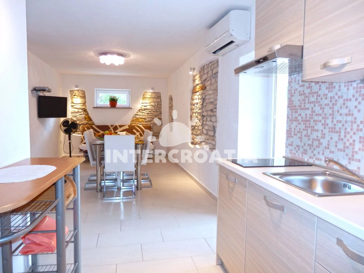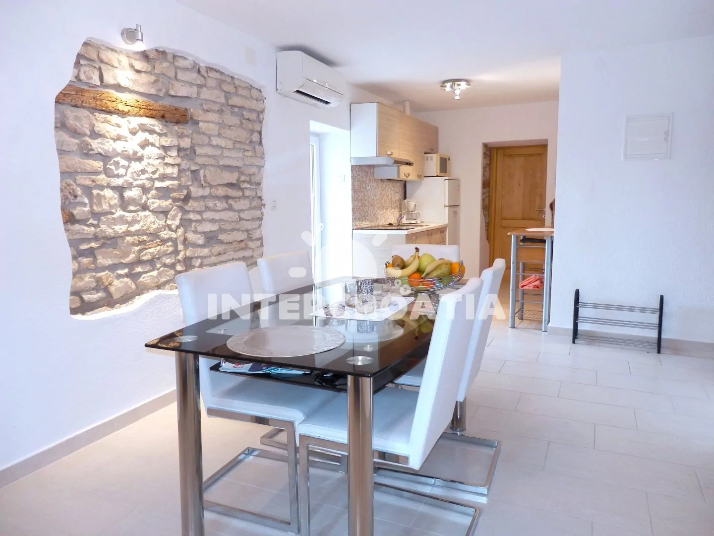 Apartmán (60 m2) s terasou se nachází v prvním patře vily a je vhodný pro 4 až 5 osob. Obývací pokoj je spojený s kuchyní. Kuchyňská linka je vybavena dvouplotýnkovým sporákem, digestoří,…