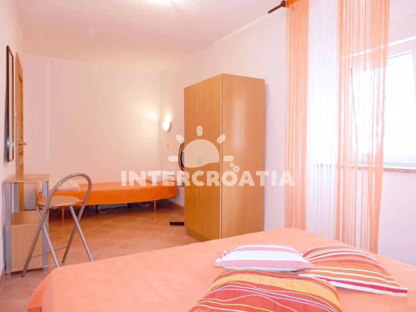 Apartmán (60 m2) s terasou se nachází v prvním patře vily a je vhodný pro 4 až 5 osob. Obývací pokoj je spojený s kuchyní. Kuchyňská linka je vybavena dvouplotýnkovým sporákem, digestoří, rychlovarnou konvicí, kávovarem, nádobím a lednicí s mrazákem. Obývací pokoj s jídelním stolem pro 5 osob, pohovkou, televizí se satelitním programem, klimatizací a vstupem na terasu. První ložnice s jedním dvoulůžkem. Druhá ložnice s dvoulůžkem a jedním jednolůžkem. Koupelna se sprchovým koutem, umyvadlem a wc. U vily je možné zastavit automobilem a parkovat lze 150 až 300 m od objektu.