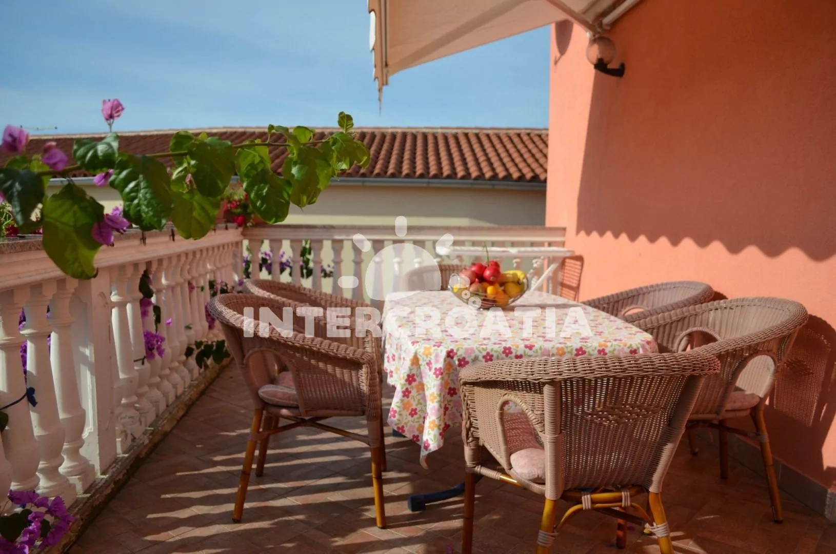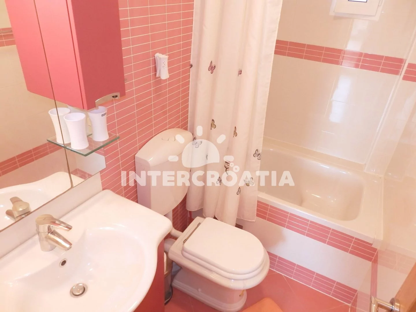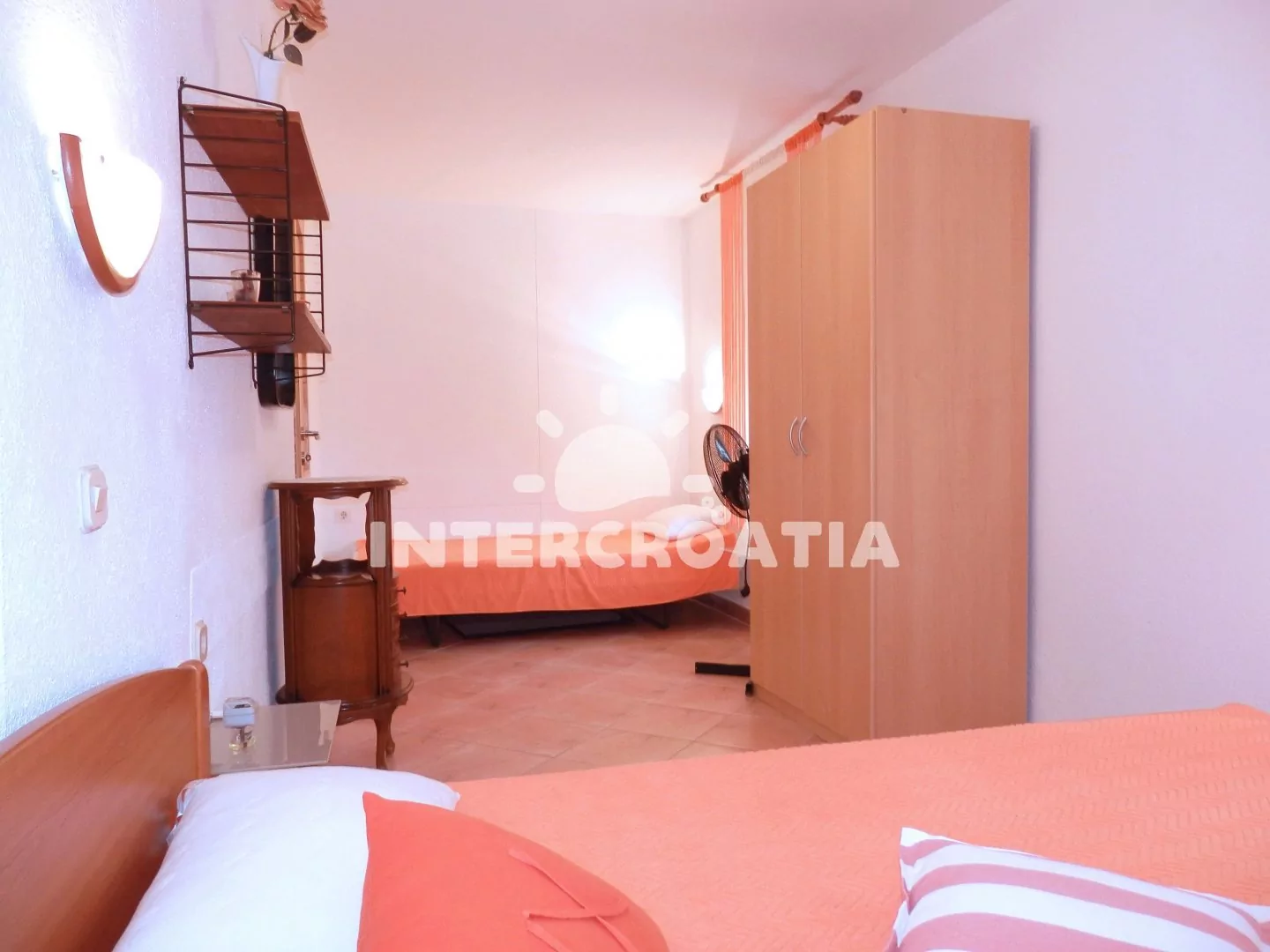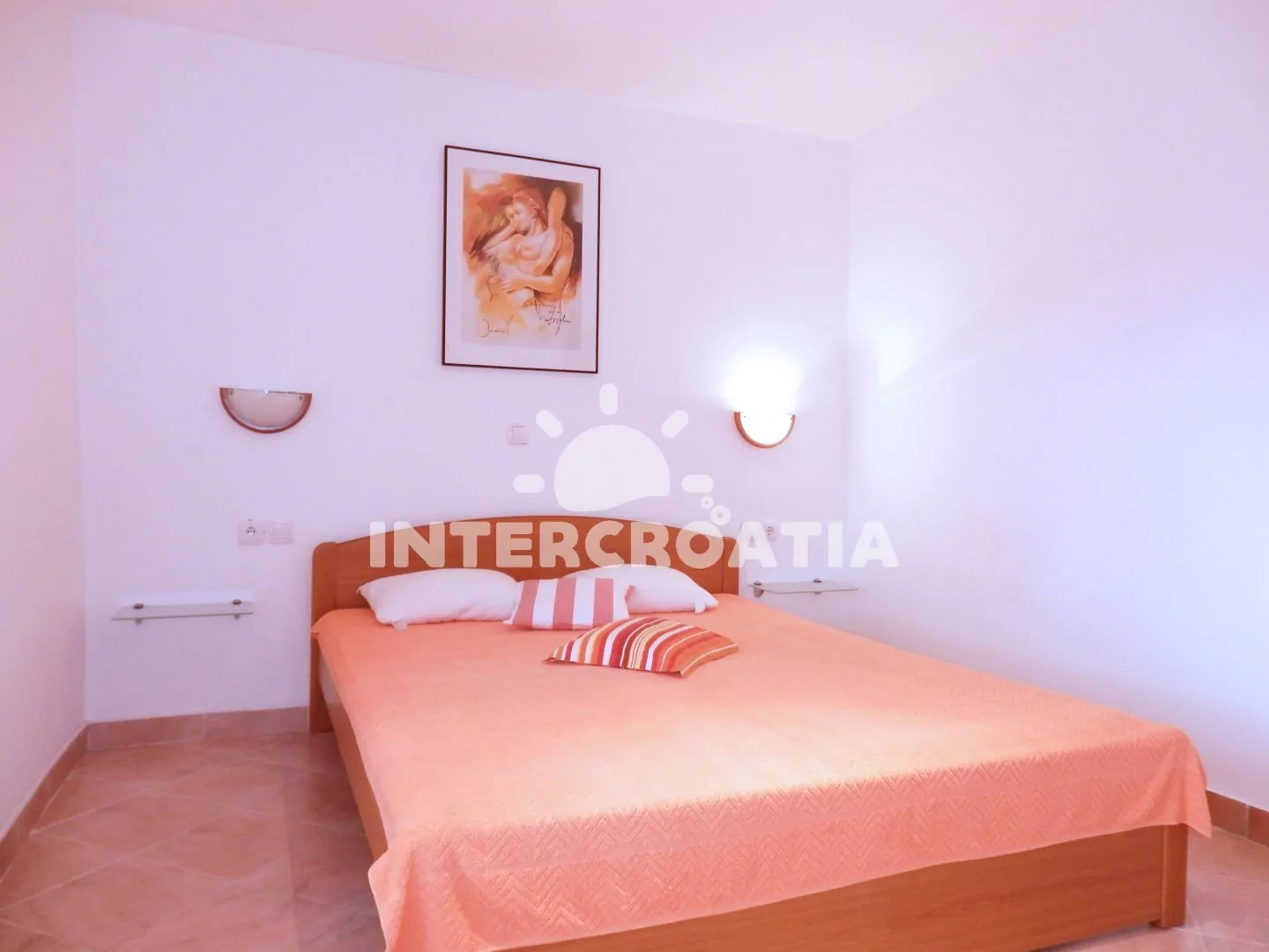 Apartmán (60 m2) s terasou se nachází v druhém patře vily a je vhodný pro 4 až 5 osob. Obývací pokoj je spojený s kuchyní. Kuchyňská linka je vybavena dvouplotýnkovým sporákem, rychlovarnou konvicí, kávovarem, nádobím a lednicí s mrazákem. Obývací pokoj s jídelním stolem pro 5 osob, pohovkou, televizí se satelitním programem, klimatizací a vstupem na terasu. První ložnice s jedním dvoulůžkem. Druhá ložnice s dvoulůžkem a jedním jednolůžkem. Koupelna se sprchovým koutem, umyvadlem a wc. U vily je možné zastavit automobilem a parkovat lze 150 až 300 m od objektu.