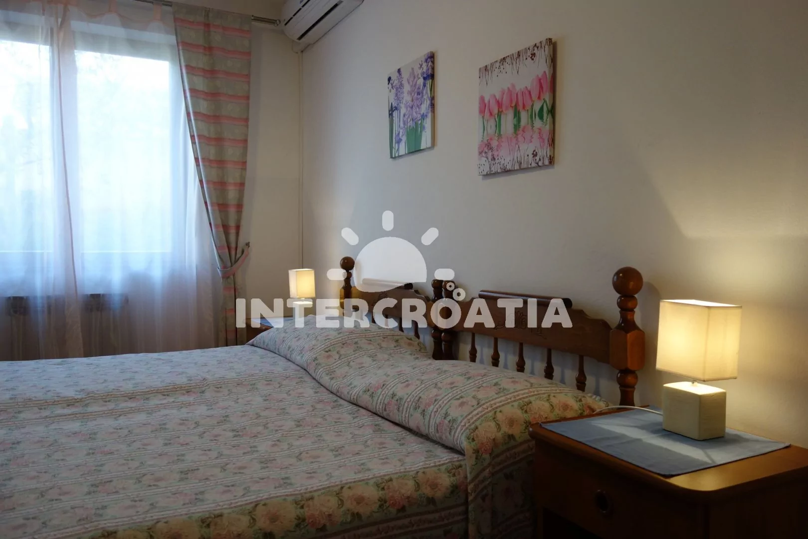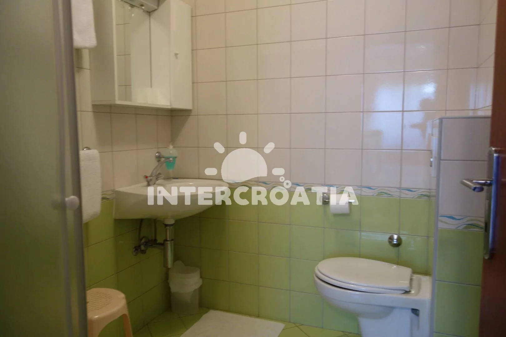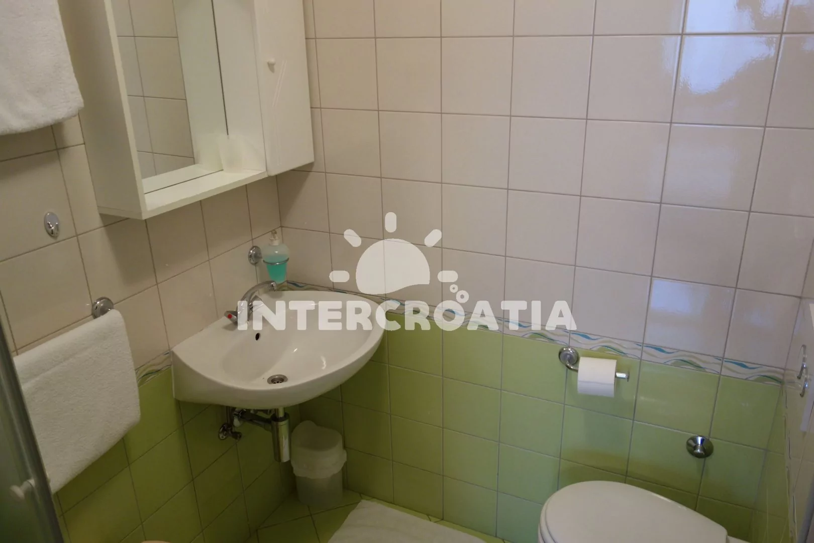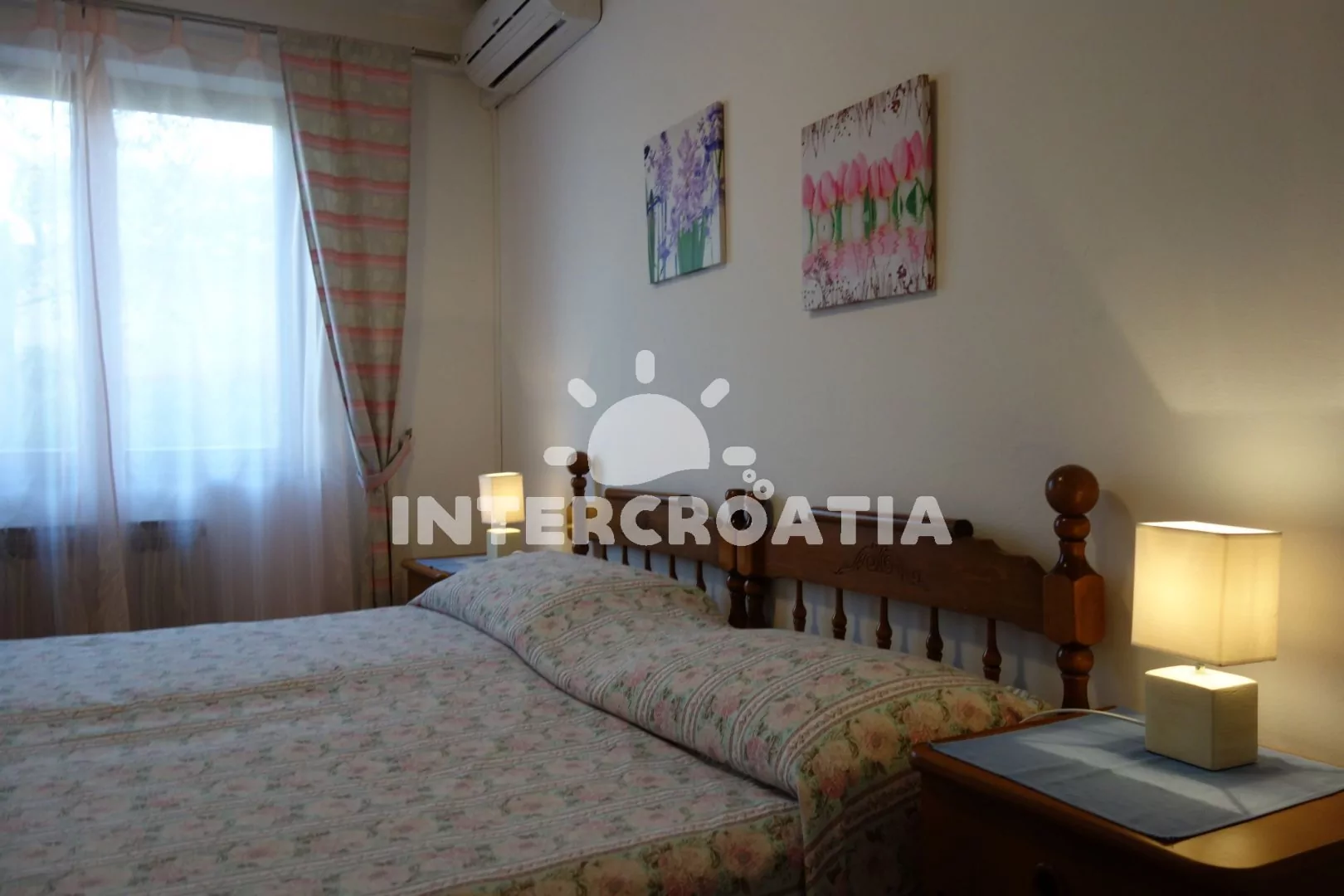 Apartmán (60 m2) v přízemí domu s výhledem do zahrady a klidné ulice je vhodný pro 2 až 4 osoby. Obývací pokoj je spojený s kuchyní. Kuchyňská linka je vybavena dvouplotýnkovým sporákem, digestoří, mikrovlnnou troubou, rychlovarnou konvicí, nádobím a lednicí s mrazákem. Obývací pokoj s jídelním stolem pro 4 osoby, pohovkou (rozložitelná na extra lůžko pro 2 osoby), televizí a vstupem na terasu. Ložnice s jedním dvoulůžkem a klimatizací. Koupelna se sprchovým koutem, umyvadlem, fénem a wc. Hostům je k dispozici parkování u objektu zdarma.