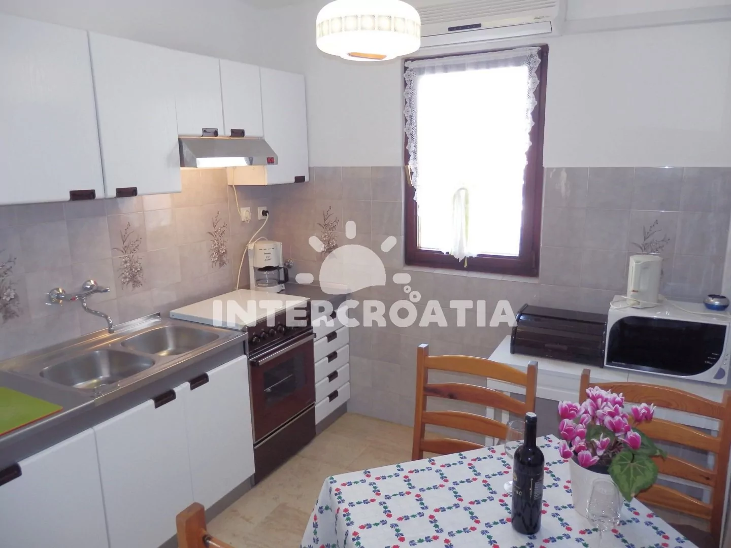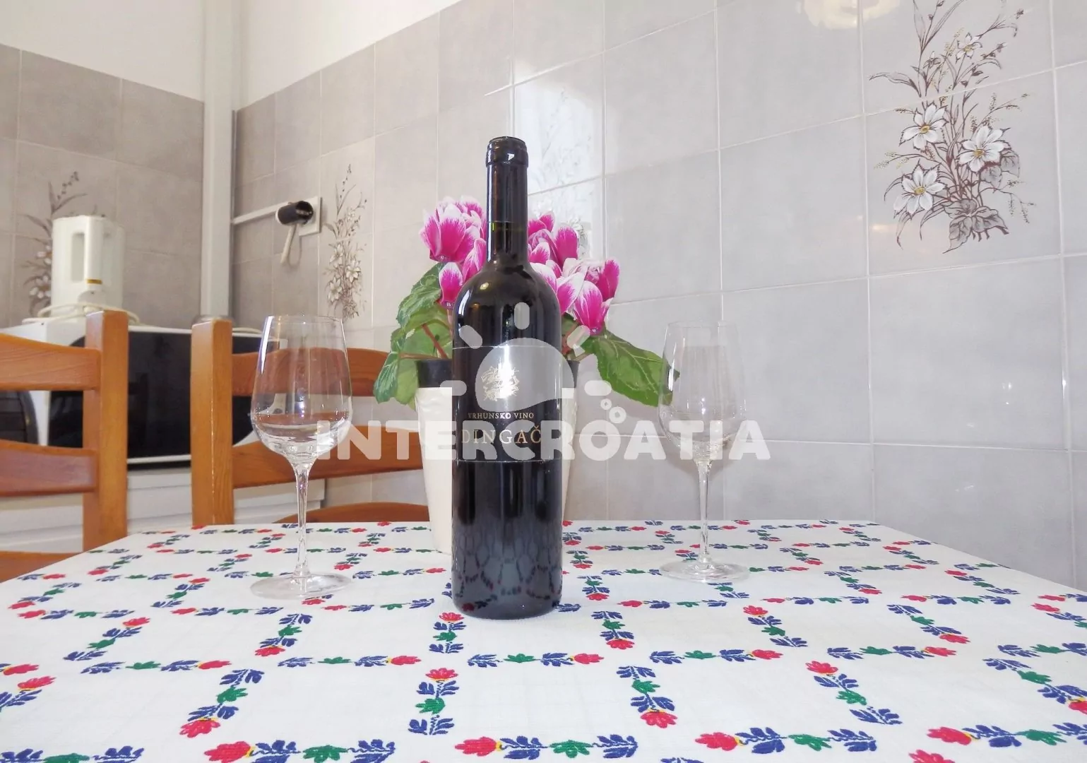 Apartmán s vlastní terasou a výhledem do zahrady se nachází v prvním patře vily a je vhodný pro 4 osoby. Kuchyň je vybavena jídelním stolem pro 4 osoby, televizí se satelitním programem, klimatizací, kuchyňskou linkou se sporákem, digestoří, troubou, rychlovarnou konvicí, mikrovlnnou troubou, kávovarem, nádobím a lednicí s mrazákem. První ložnice s jedním dvoulůžkem. Druhá ložnice s dvěma jednolůžky. Koupelna se sprchovým koutem, umyvadlem a wc. Hostům je k dispozici parkování u objektu zdarma.