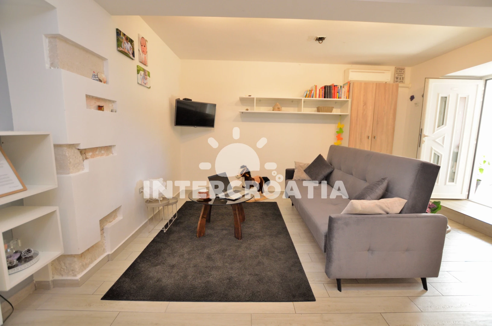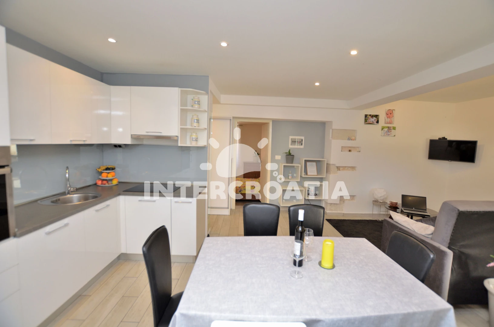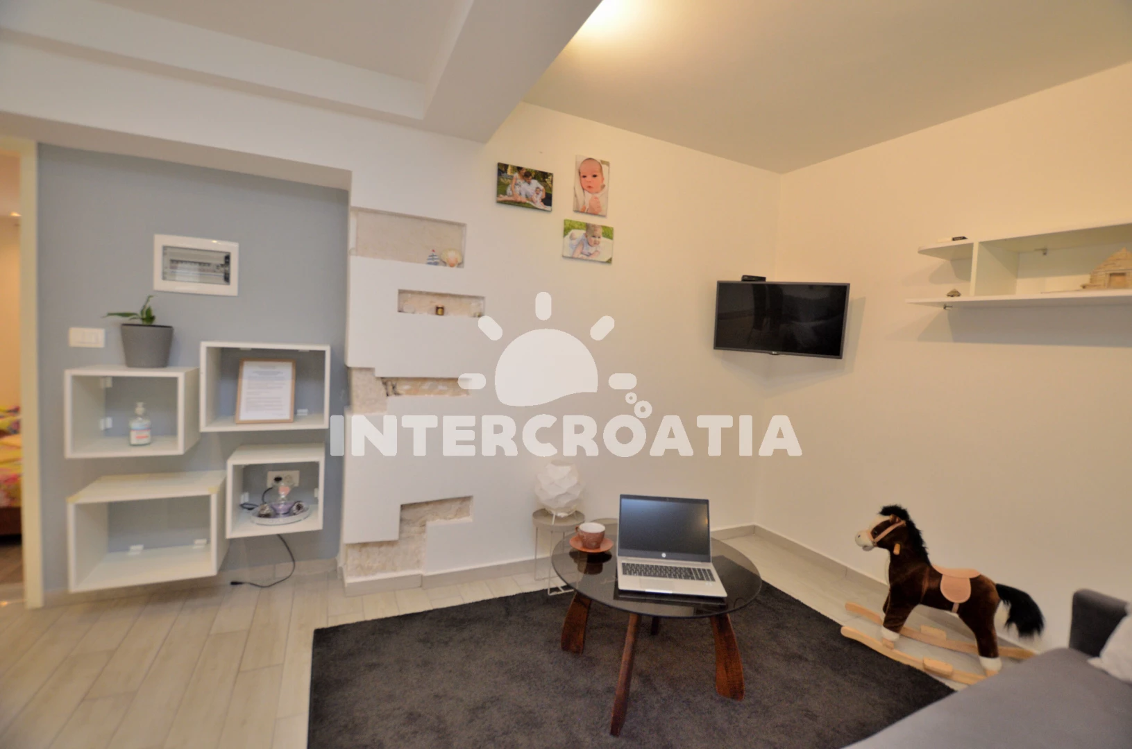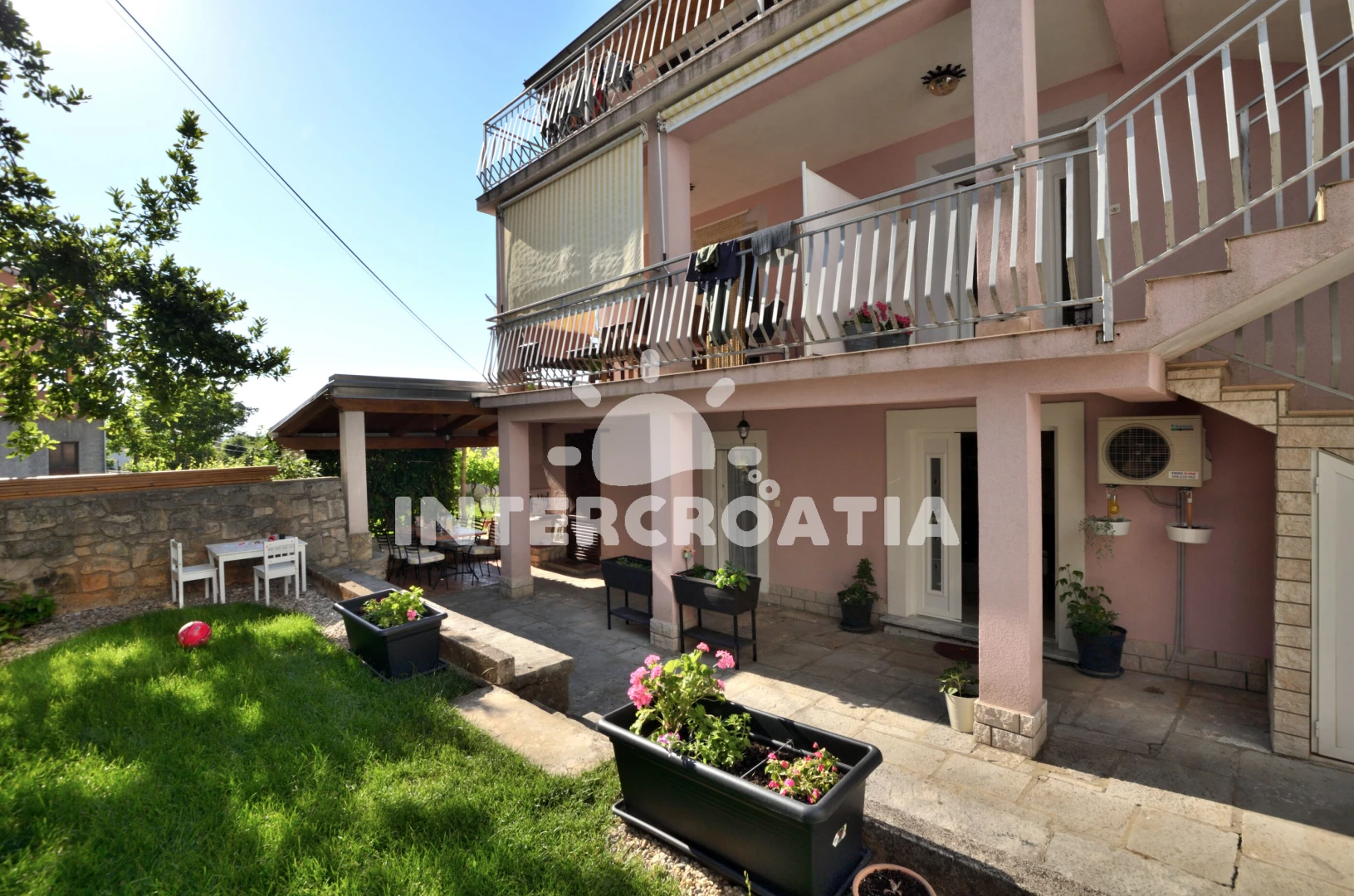 Apartmán se nachází 11000 m od moře a pláže. Pláž je skalnatá, oblázková, větší kamení a betonové desky. U objektu je k dispozici společná zahrada s posezením a grilem. Parkování je před domem.