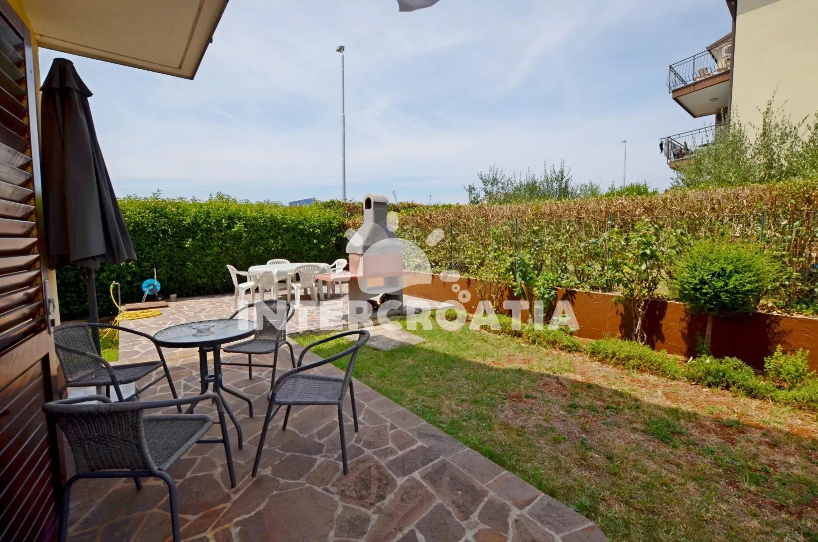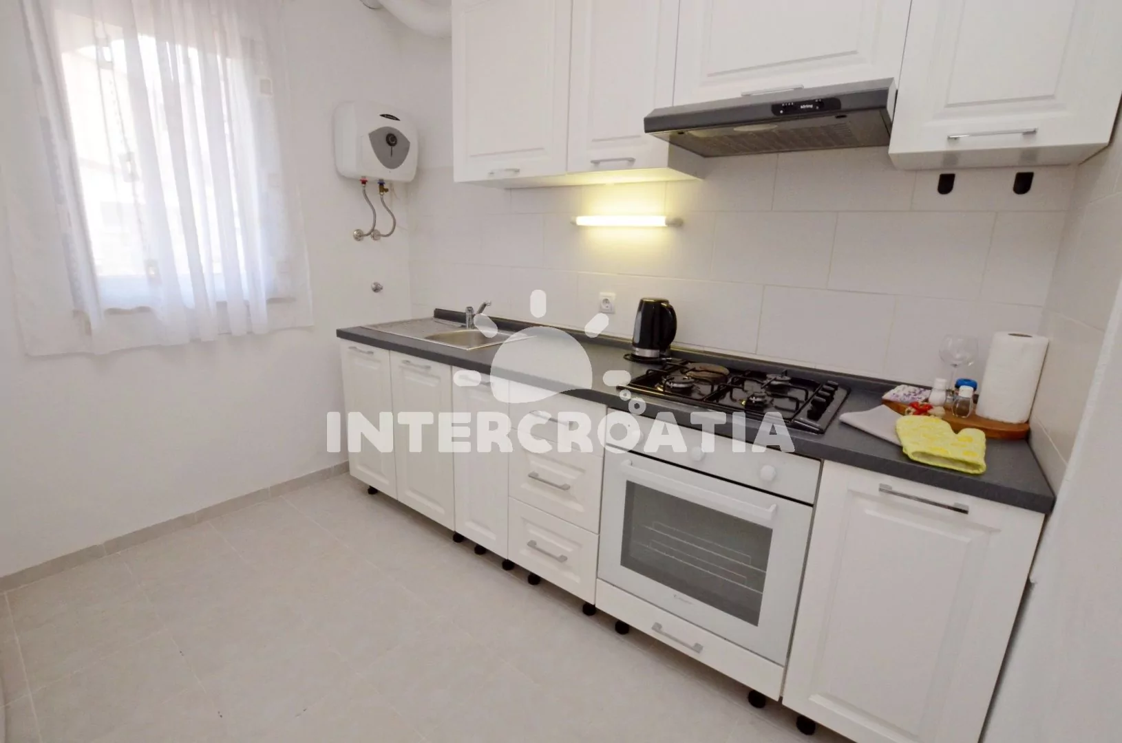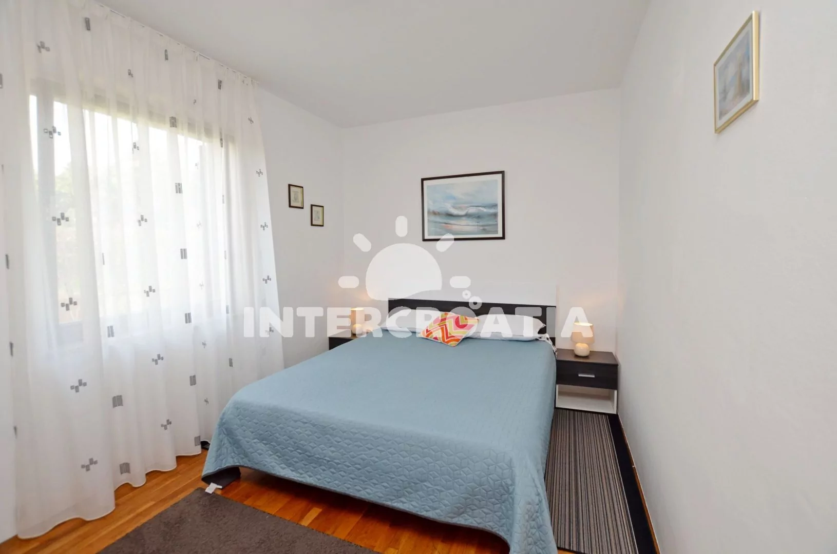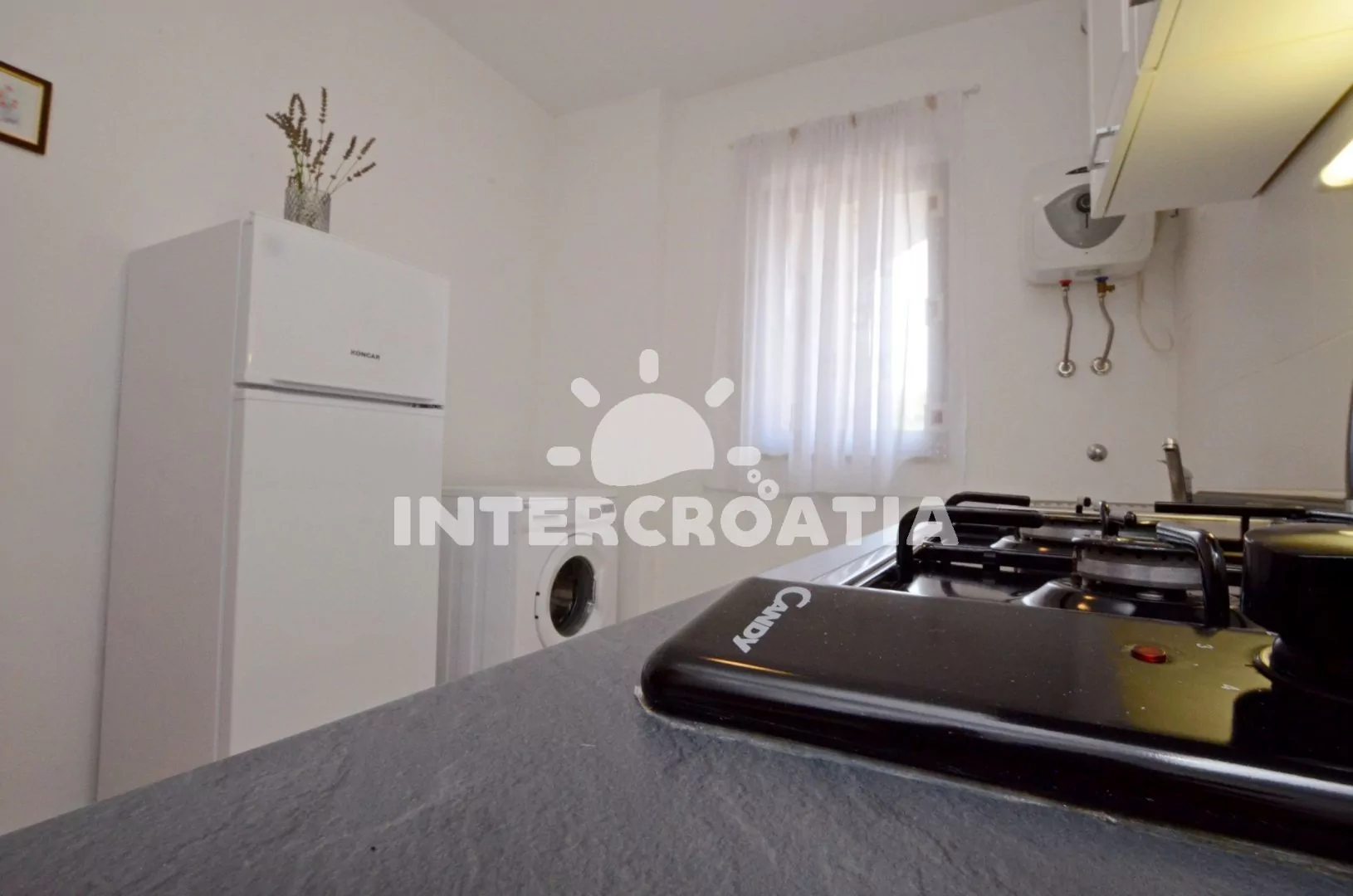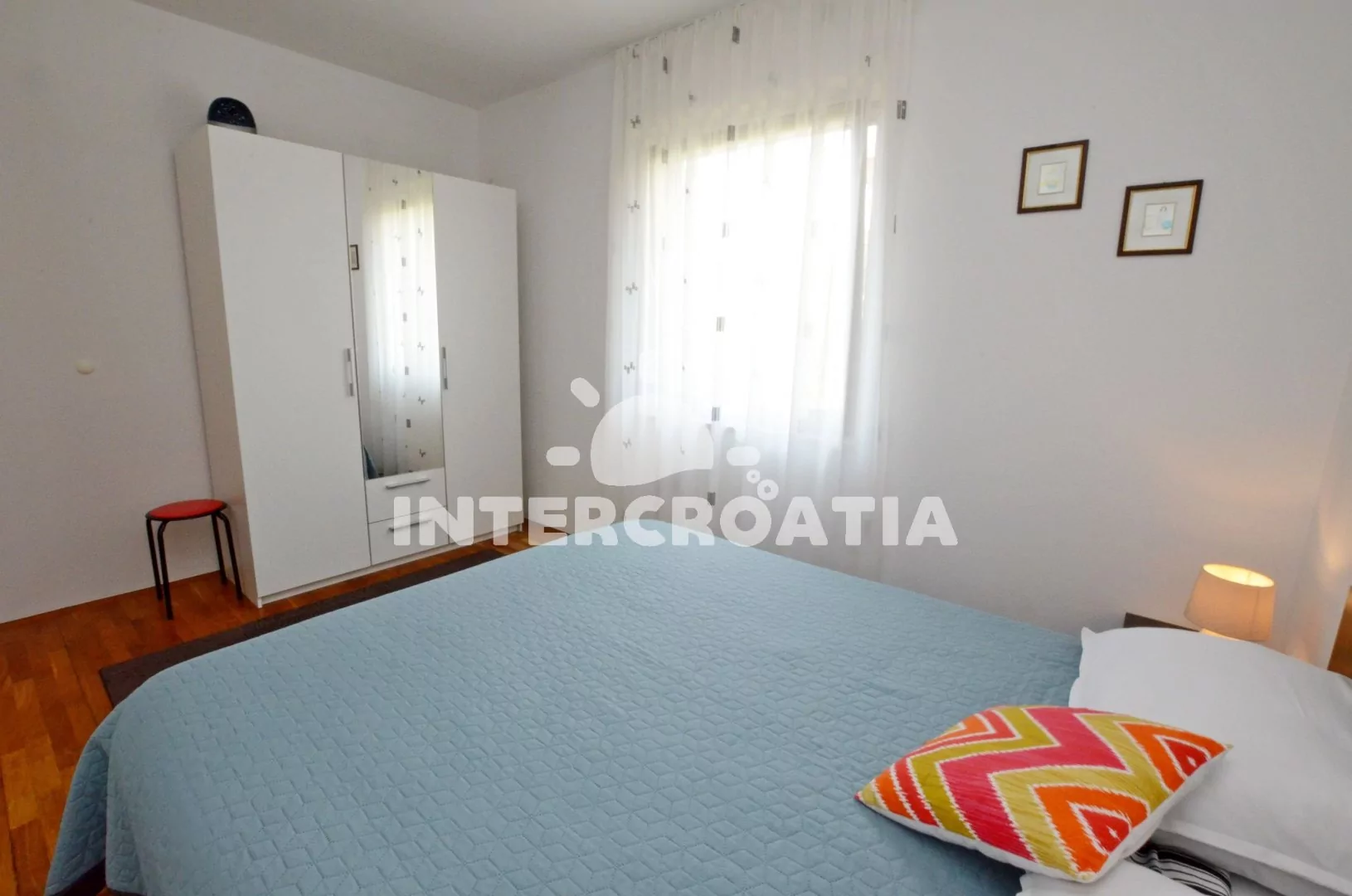Moderně zařízený apartmán v přízemí domu, pro 2 až 4 osoby. Kuchyň je spojena s obývacím pokojem. Kuchyňský kout je vybaven nádobím, varnou deskou, digestoří, vestavěnou horkovzdušnou troubou, rychlovarnou konvicí, kávovarem a lednicí s mrazákem. Obývací část s jídelním stolem, rozkládací pohovkou (extra lůžko pro 2 osoby) a televizí se satelitním programem. Ložnice s jedním manželským dvoulůžkem. Koupelna se sprchovým koutem, umyvadlem, fénem a wc. K dispozici: WiFi, klimatizace, pračka a žehlička.