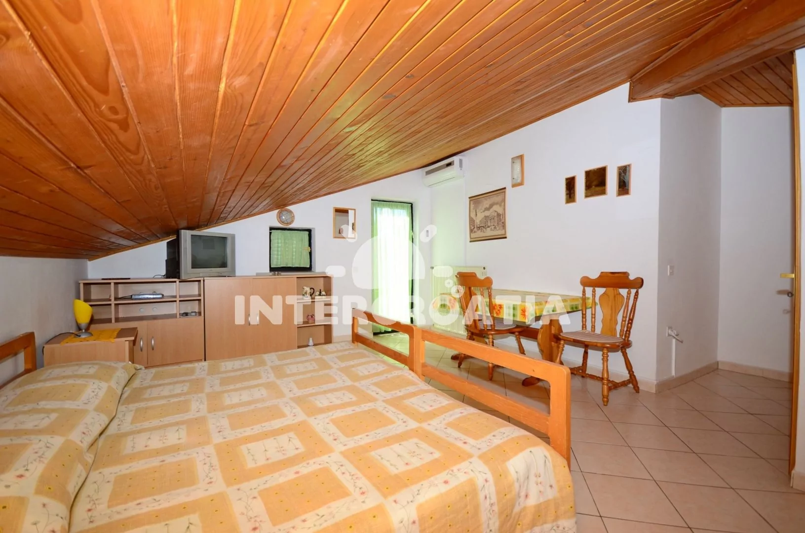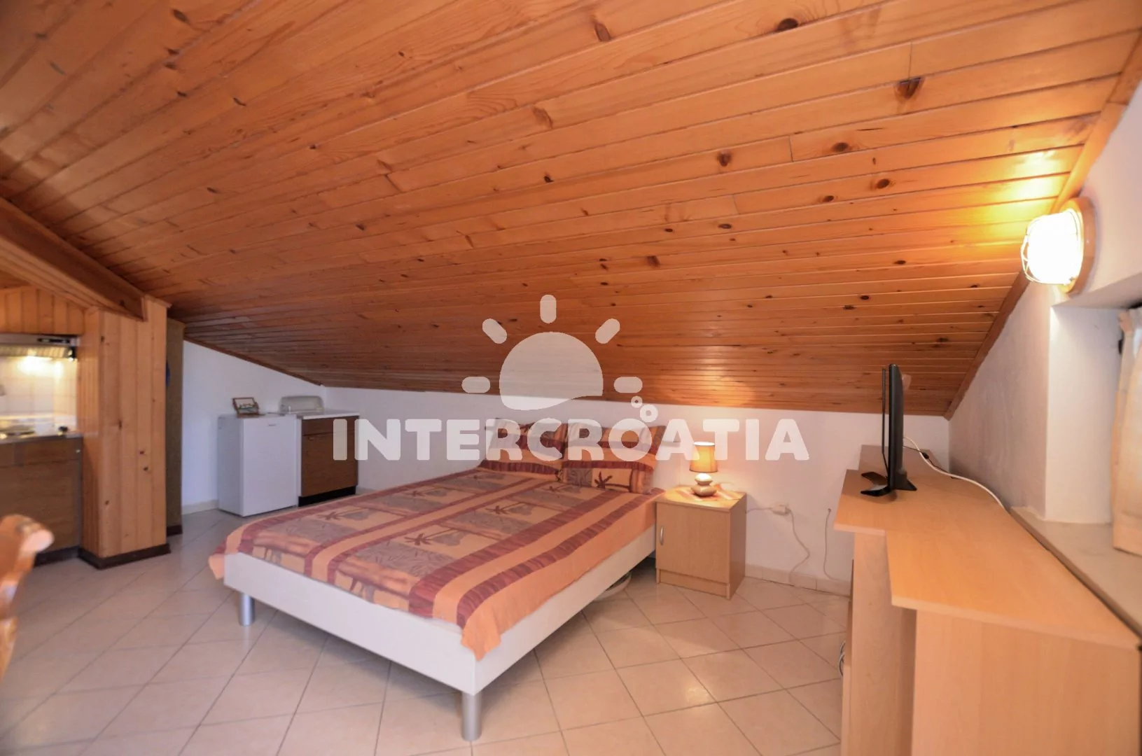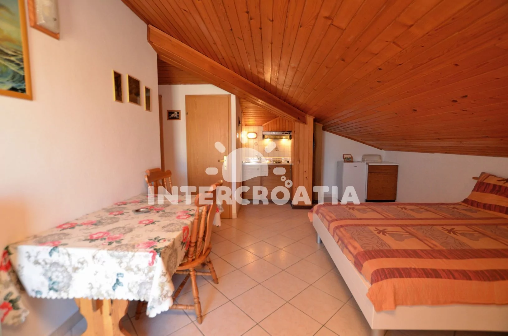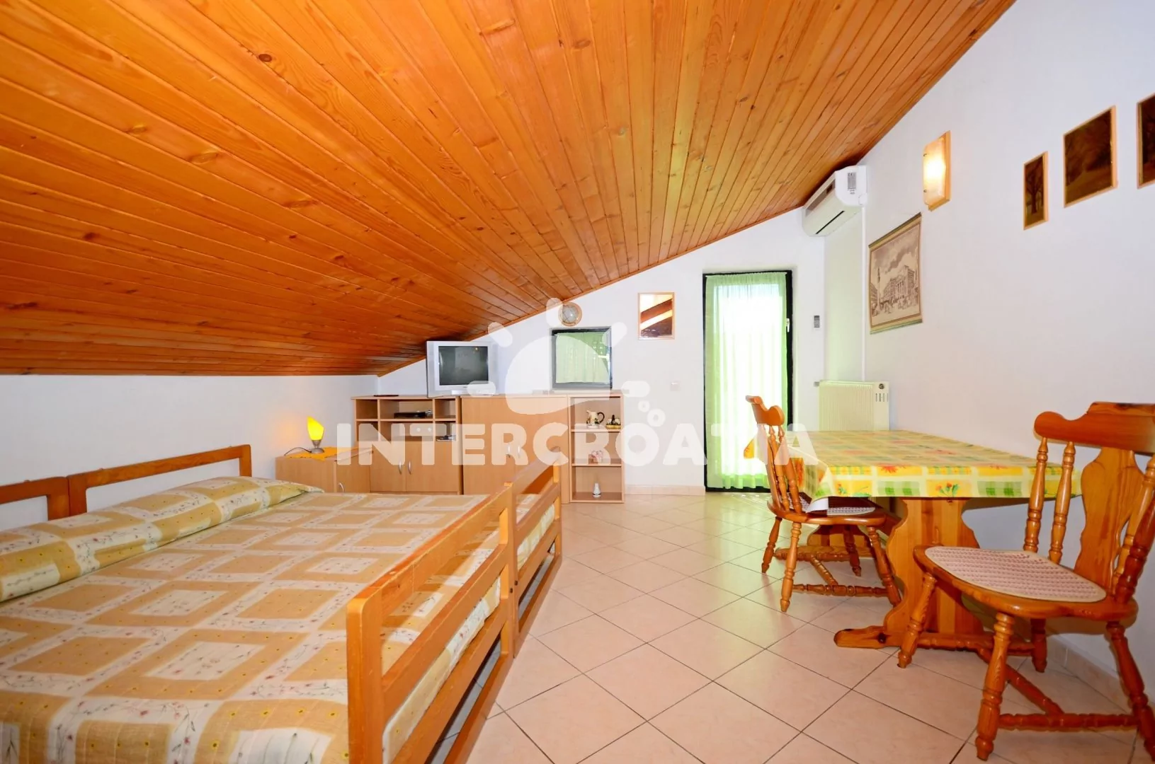 Apartmán (28 m2) typu studio s balkonem se nachází v podkroví domu a je vhodný pro 2 osoby. Obývací pokoj spojený s kuchyňkou. Kuchyňská linka s dvouplotýnkovým sporákem, lednicí s mrazákem, kávovarem a nádobím. V obývacím pokoji jídelní stůl pro 3 osoby, dvoulůžko, televize se satelitním programem, klimatizace a vstup na balkon. Koupelna s vanou, umyvadlem a wc. Parkování u objektu zdarma.