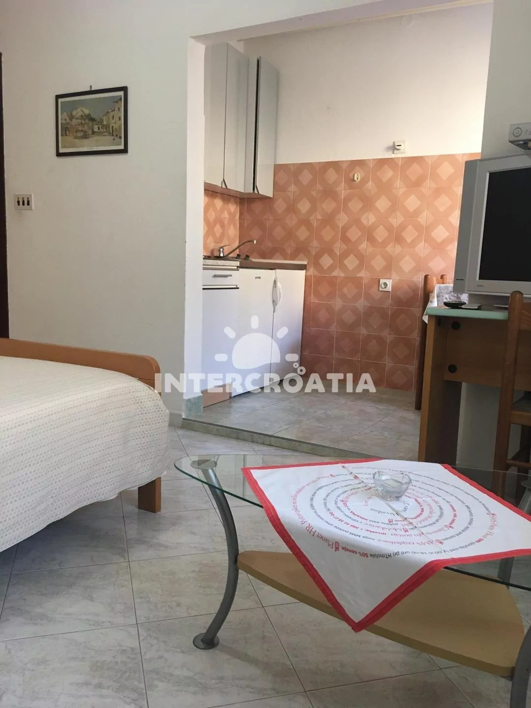 Apartmán (33 m2) typu studio se nachází v přízemí vily. Obývací místnost je spojena s kuchyní. Kuchyňská linka je vybavena dvouplotýnkovým vařičem, rychlovarnou konvicí, kávovarem, nádobím a lednicí…