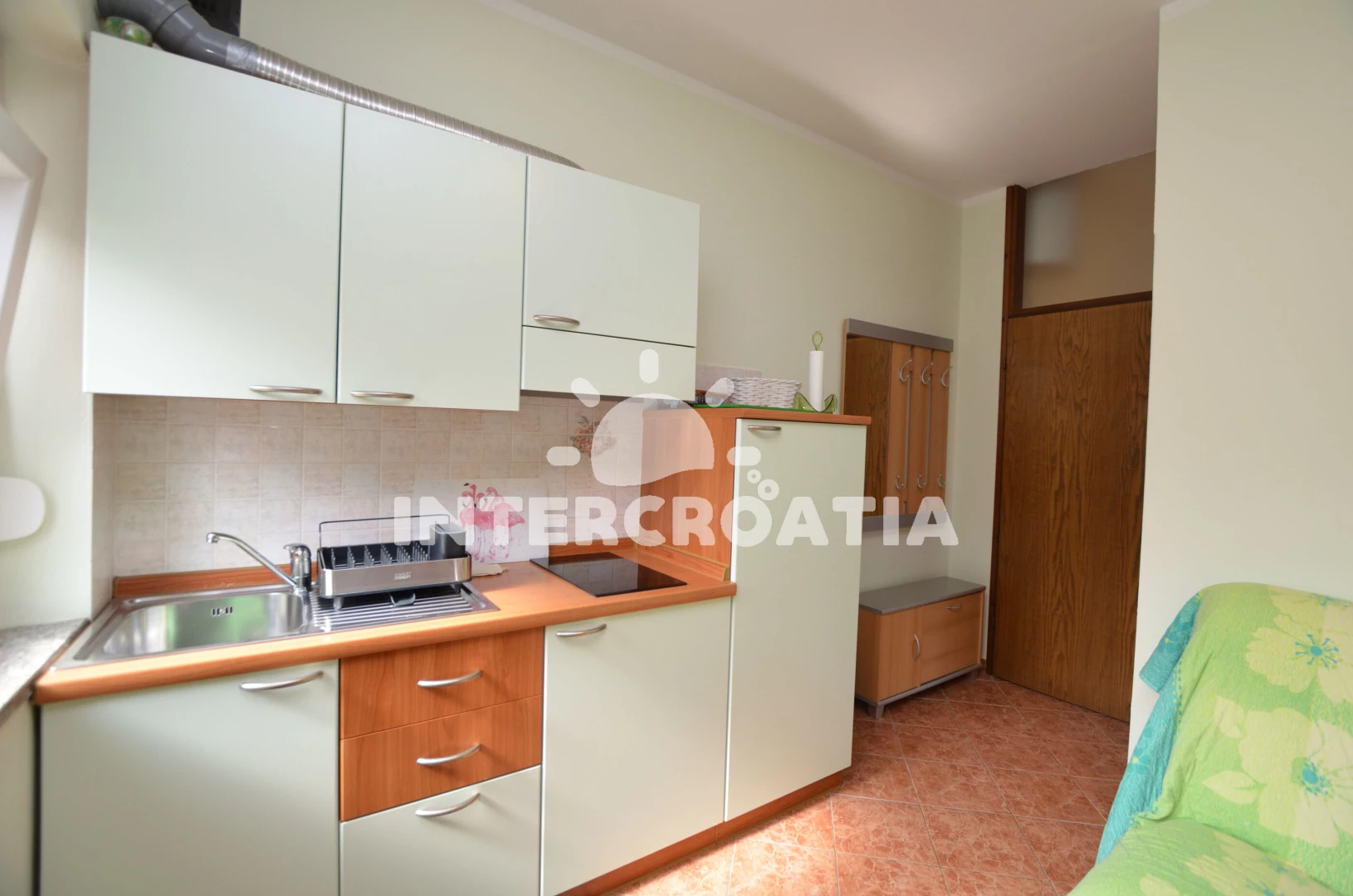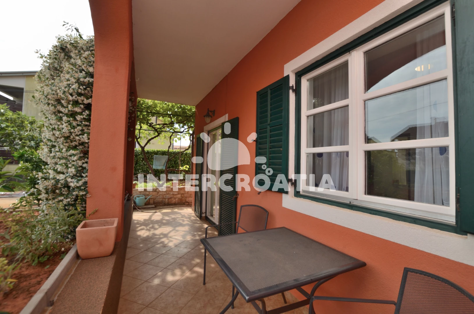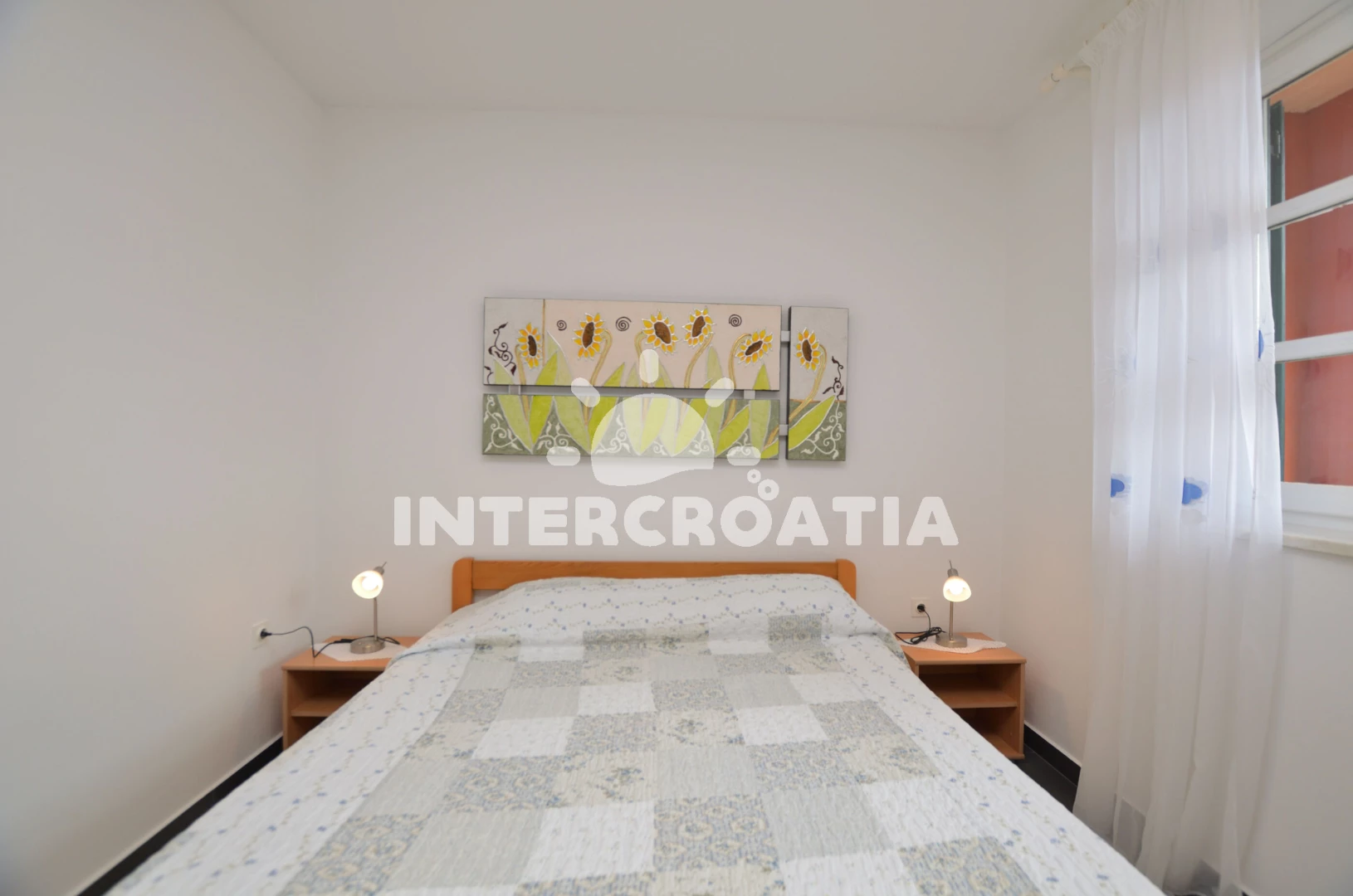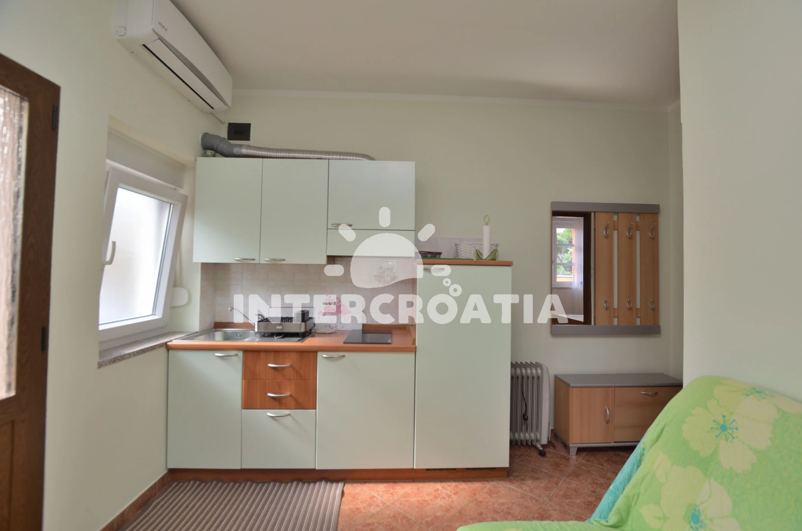 Apartmán (45 m2) s terasou a venkovním posezením se nachází v přízemí domu. Apartmán má 1 ložnici a je vhodný pro 2 osoby. Obývací pokoj je spojený s kuchyní. Kuchyňská linka je vybavena dvouplotýnkovým vařičem, digestoří, nádobím a lednicí s mrazákem. Obývací pokoj s jídelním stolem, pohovkou, televizí se satelitním programem, klimatizací a vstupem na terasu. Ložnice s jedním dvoulůžkem. Koupelna se sprchovým koutem, umyvadlem a wc. Hostům je k dispozici parkování u objektu zdarma.