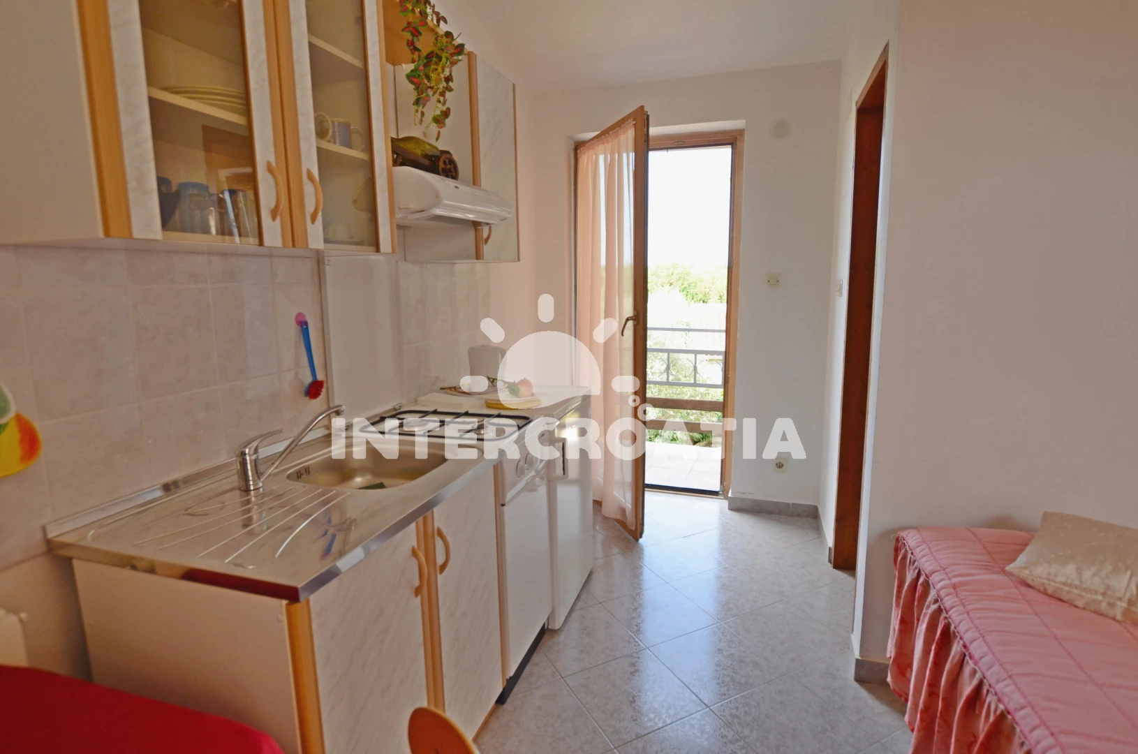 Apartmán (2) s balkonem. Nachází se v objektu. Kuchyňská linka je vybavena varnou deskou, kávovarem, mikrovlnnou troubou, nádobím, lednicí, mrazákem. K dispozici žehlička.