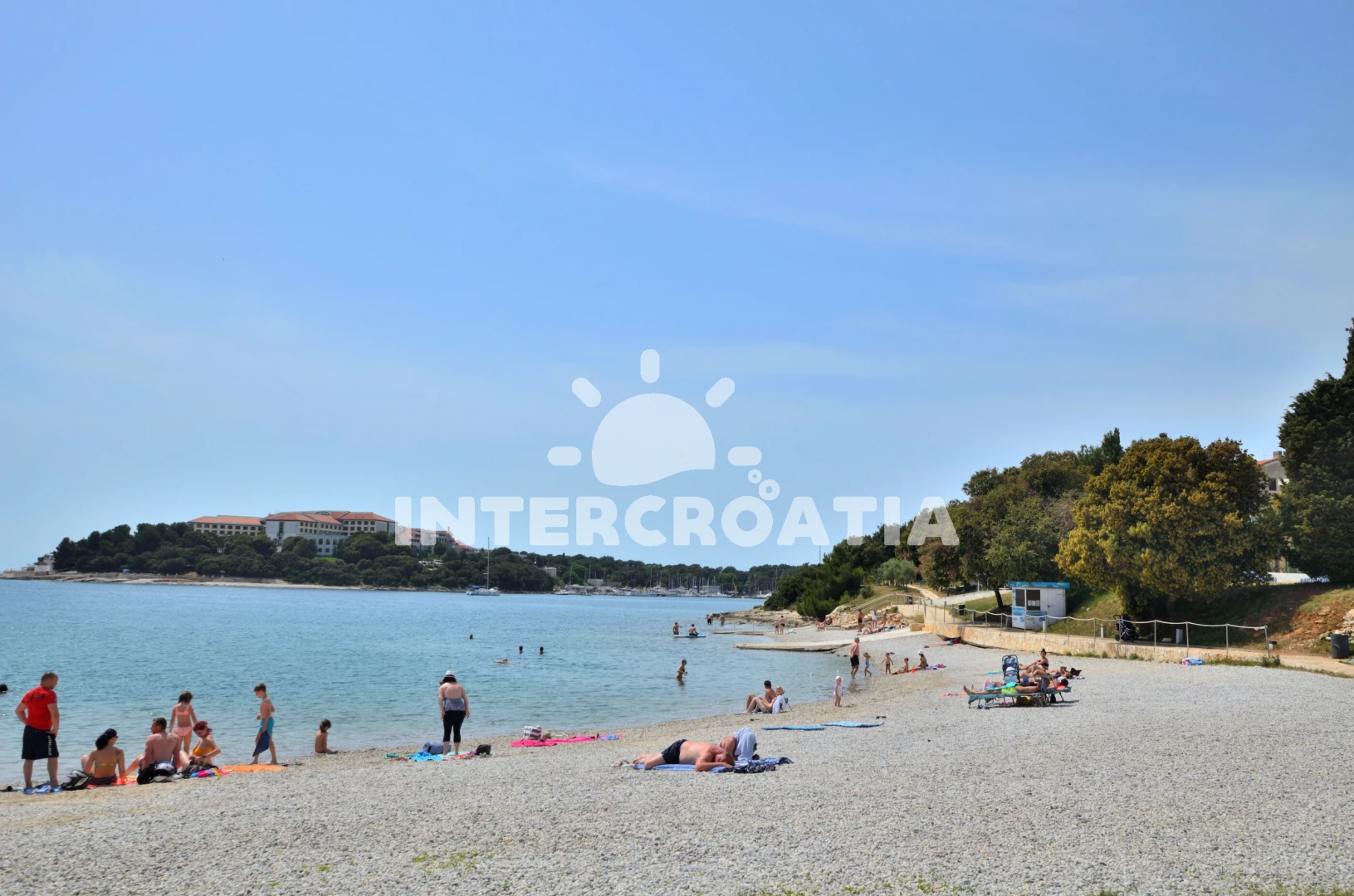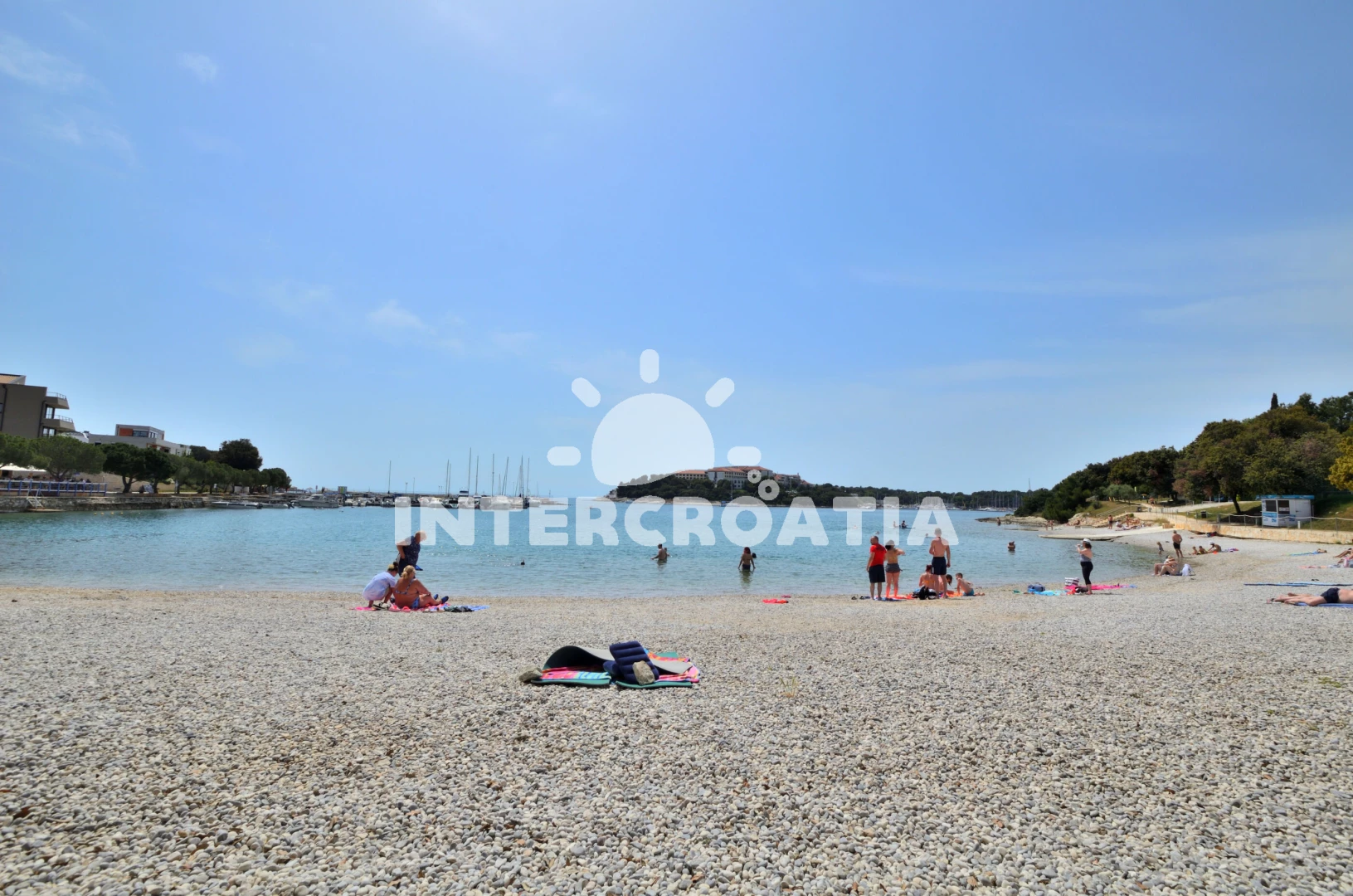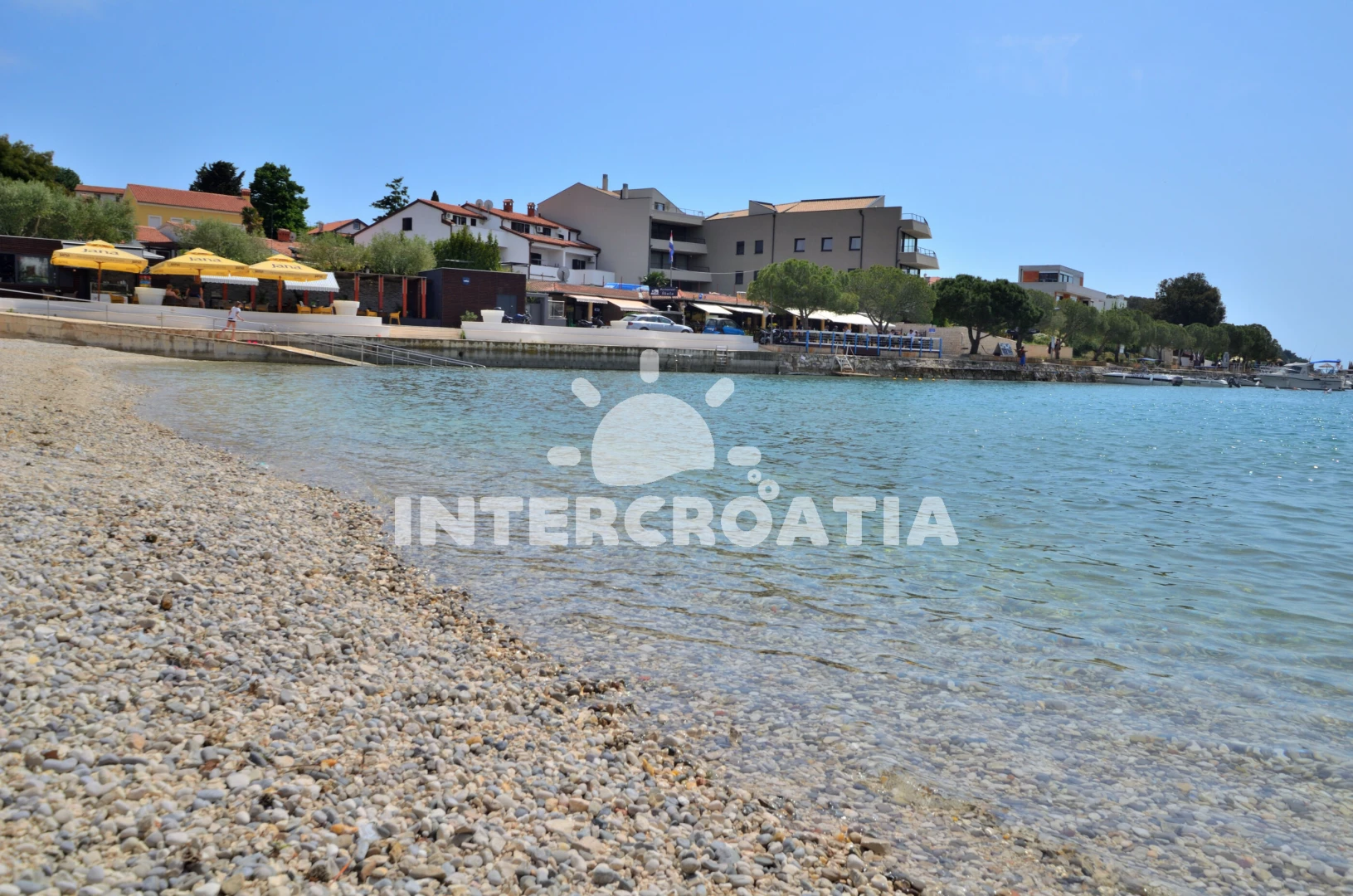 Vzdálenosti: Moře 50 m, pláž 100 m (písčitá a oblázková), centrum 50 m, veřejná doprava 50 m, restaurace 50 m, půjčovna kol 60 m, směnárna 60 m, bar 70 m, supermarket 150 m, půjčovna motorových člunů 150 m, kotviště pro čluny 300 m, potápění 400 m, čerpací stanice 400 m, marina 400 m, mini golf 1 km, tenisové kurty 1 km, pošta 1 km, banka 1 km, lékárna 1,5 km, ambulance 2 km, muzeum 2 km, diskotéka 2 km, trajekt (Pula) 3 km, letiště (Pula) 10 km,