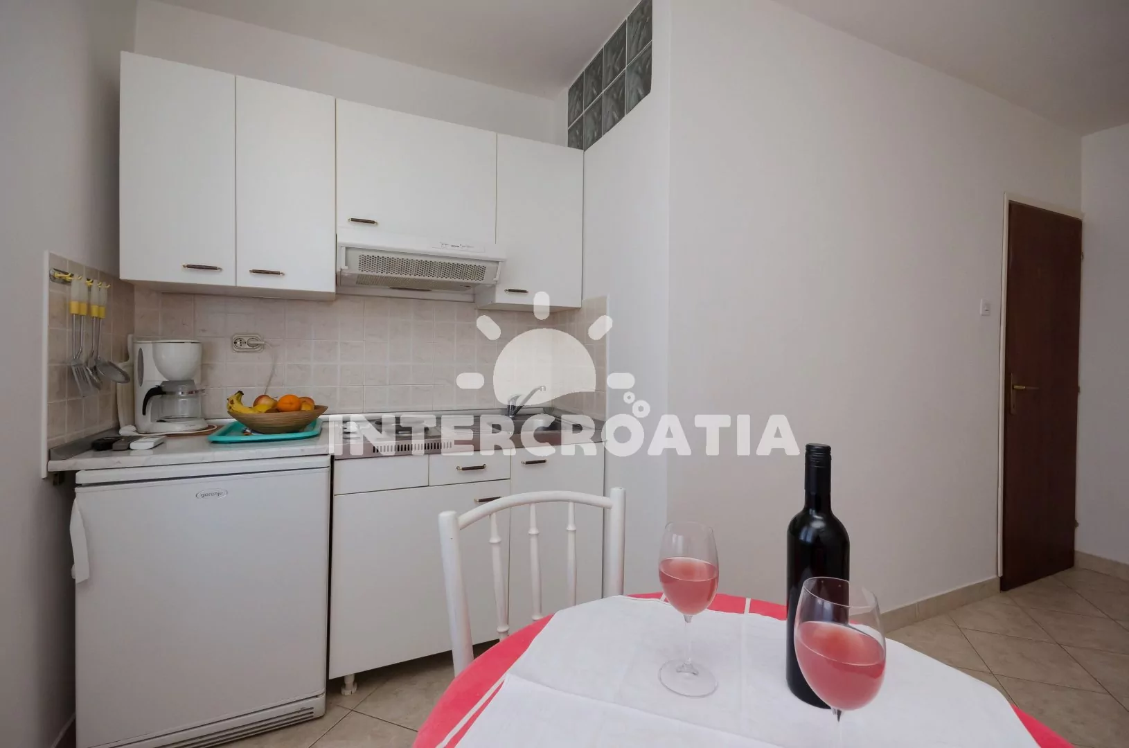 Dvoupokojový apartmán s vlastním balkonem, nacházející se v 1. patře domu. Obývací pokoj je spojený s kuchyní. Kuchyňská linka je vybavena dvouplotýnkovým sporákem, digestoří, lednicí s mrazákem, kávovarem a nádobím. Obývací pokoj s jídelním stolem pro 2 osoby, pohovkou (rozložitelná na extra lůžko pro 1 osobu), televizí se satelitem a klimatizací. Ložnice s dvoulůžkem a vstupem na balkon. Koupelna se sprchovým koutem a umyvadlem. Dále samostatné wc. Hostům je k dispozici parkování u objektu zdarma.