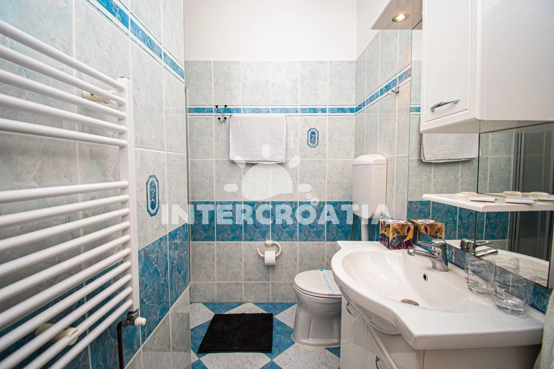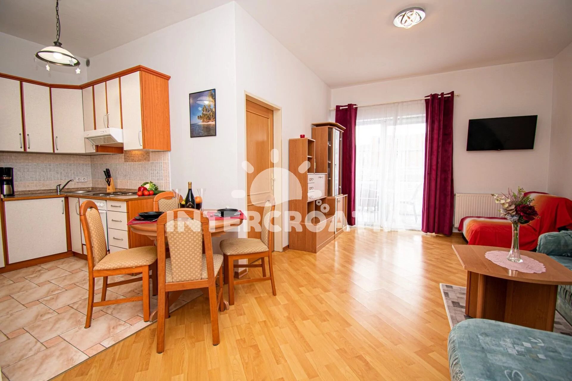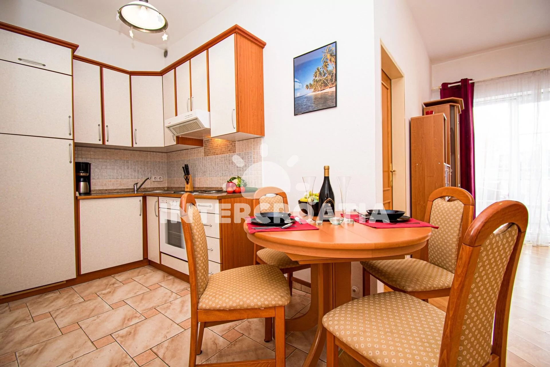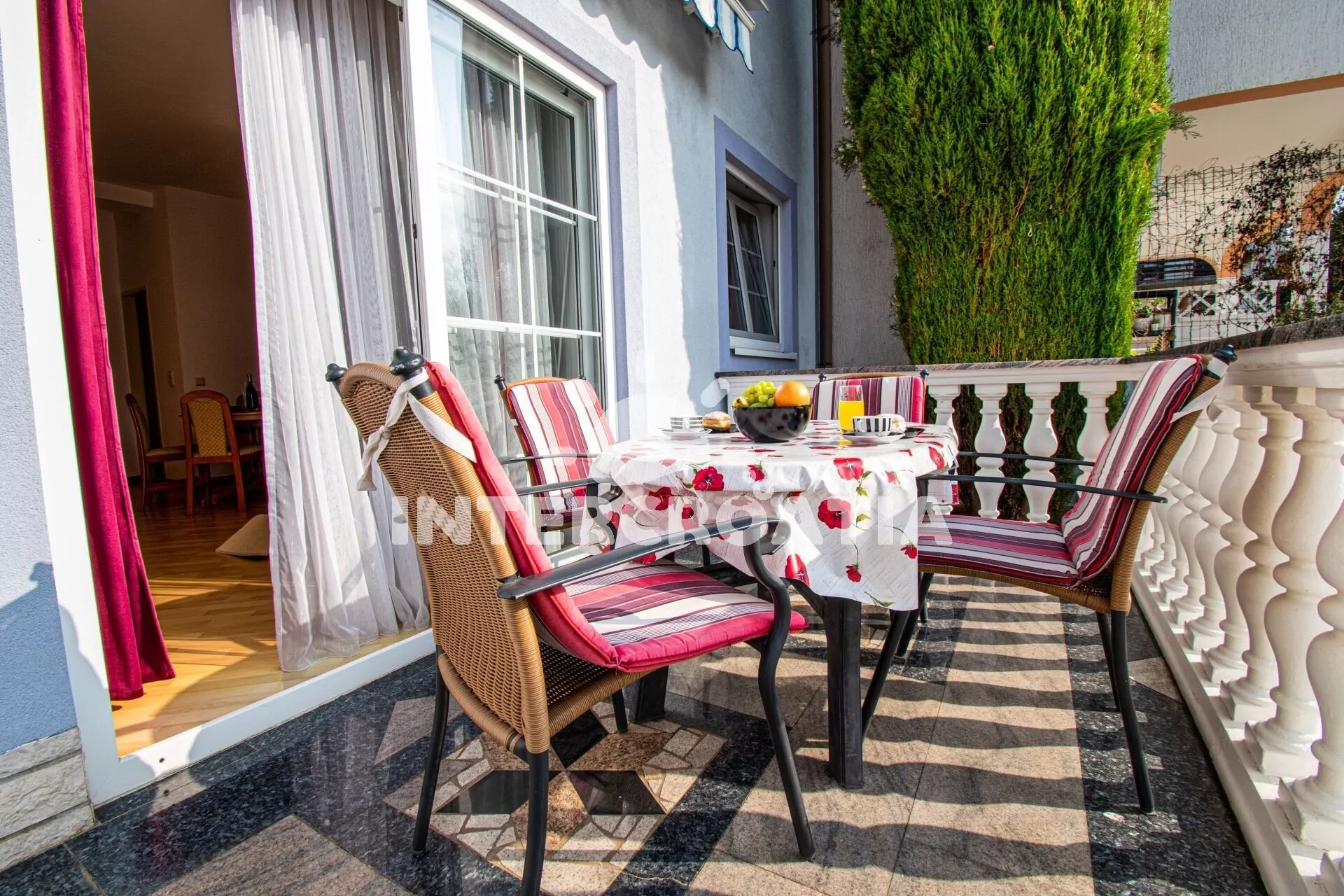 Apartmán (45 m2) s balkonem, posezením a výhledem do dvora se nachází v přízemí domu. Apartmán má 1 ložnici a je vhodný pro 2 až 4 osoby. Obývací pokoj je spojený s kuchyní. Kuchyňská linka je vybavena varnou deskou, digestoří, vestavěnou troubou, rychlovarnou konvicí, kávovarem, nádobím a lednicí s mrazákem. Obývací pokoj s jídelním stolem, pohovkou (rozložitelná na extra lůžko pro 2 osoby), televizí se satelitním programem, klimatizací a vstupem na balkon. Ložnice s jedním dvoulůžkem. Koupelna se sprchovým koutem, umyvadlem, fénem a wc. Hostům je k dispozici parkování u objektu zdarma.
