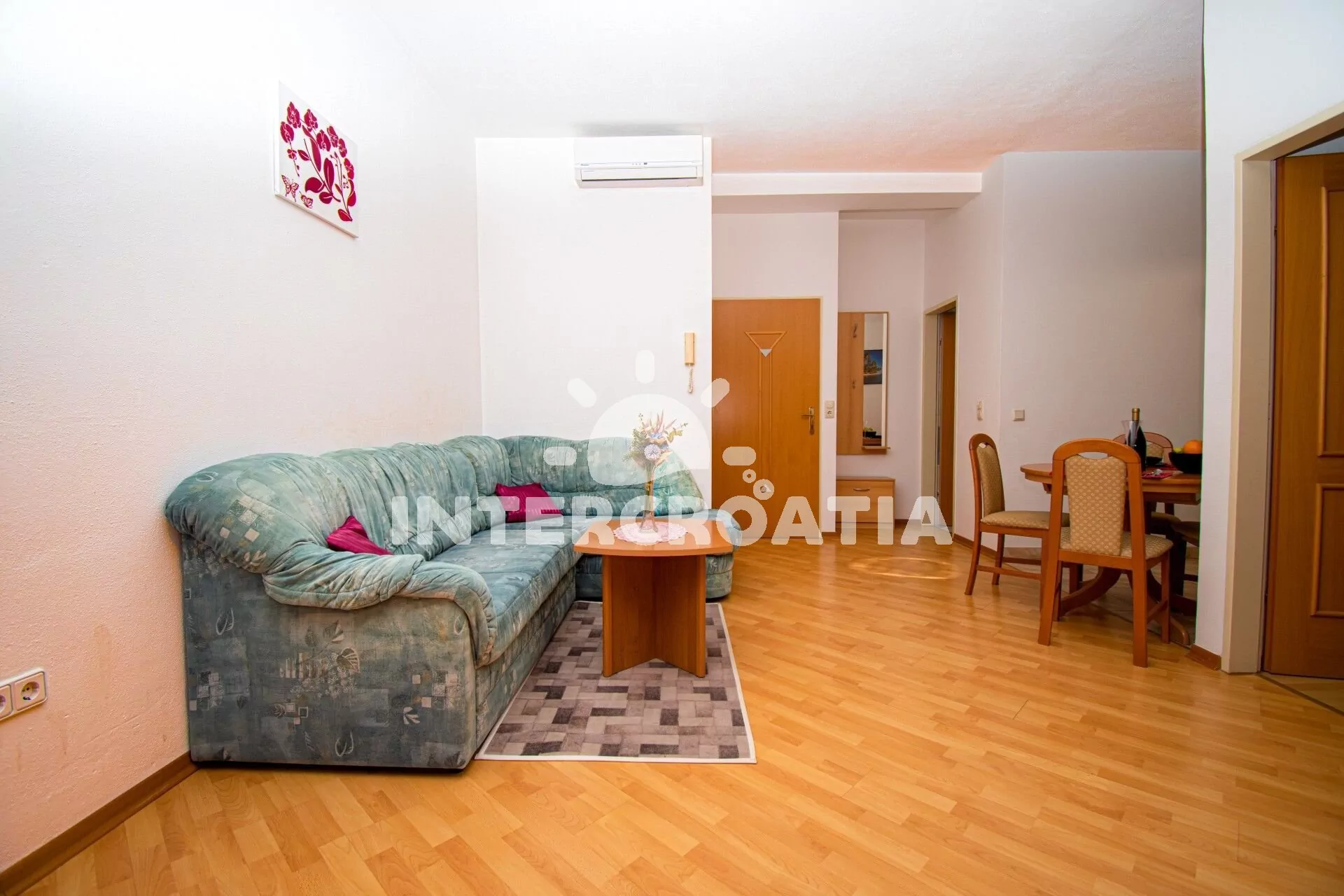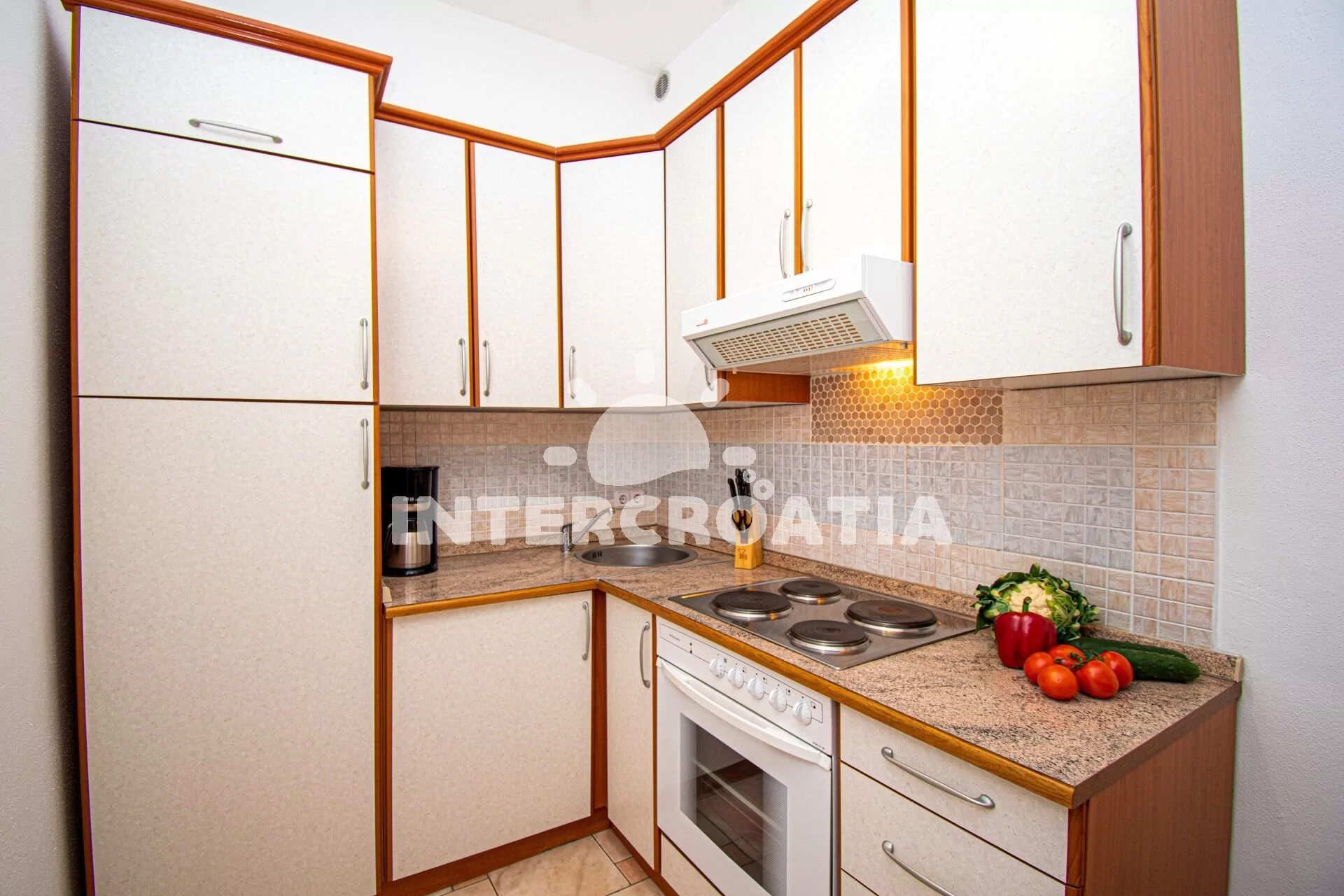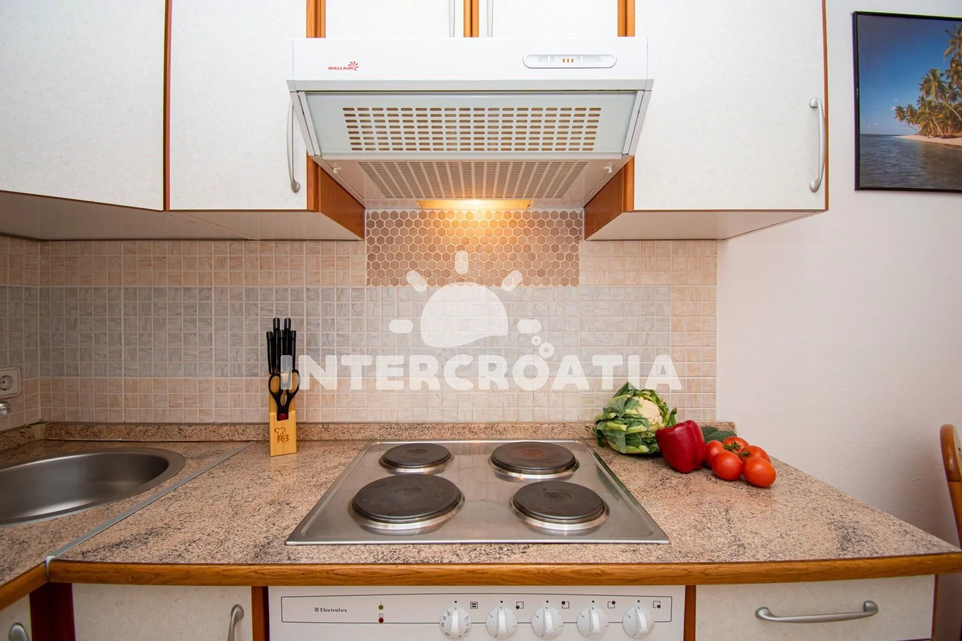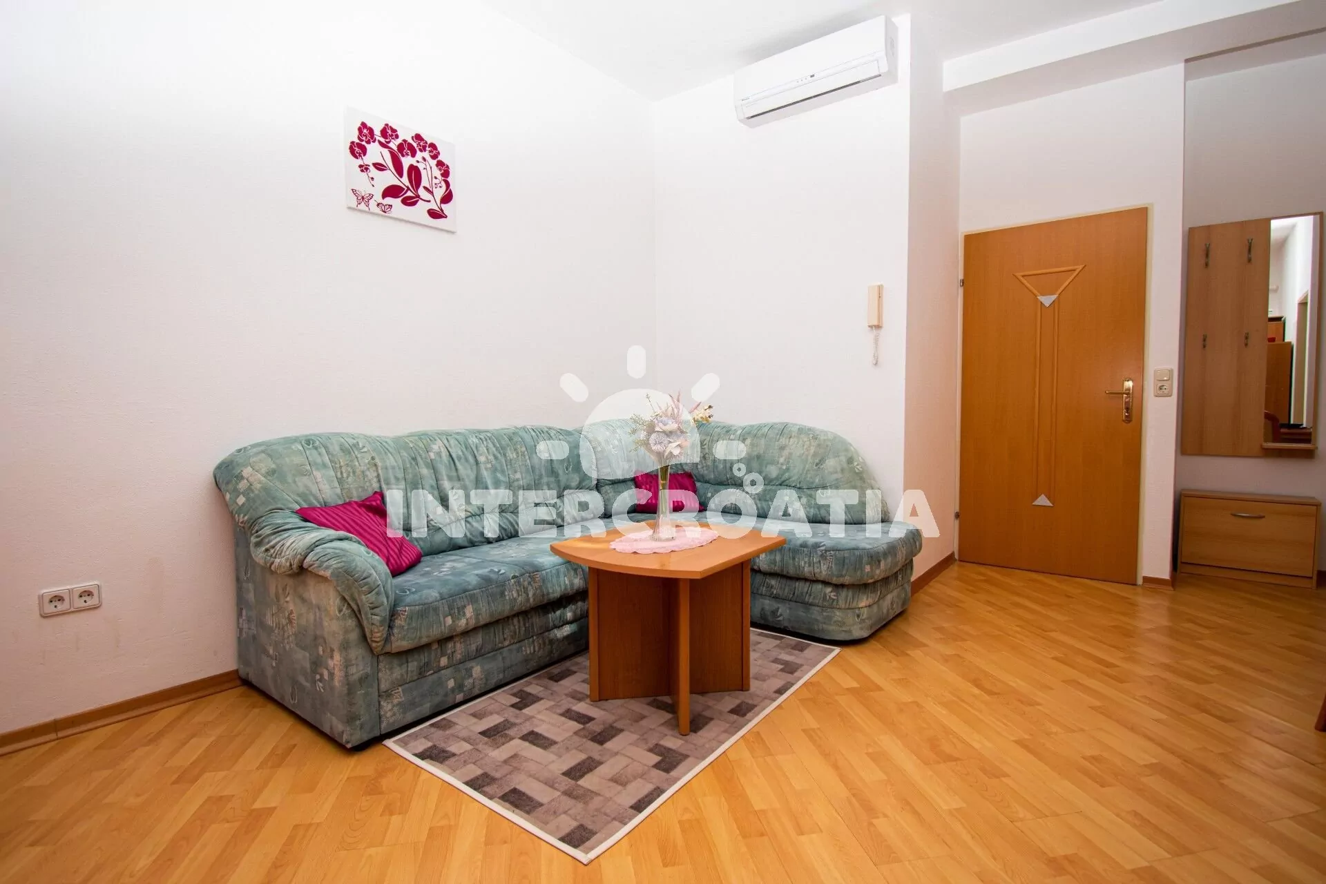 Apartmán (45 m2) s balkonem, posezením a výhledem do dvora se nachází v přízemí domu. Apartmán má 1 ložnici a je vhodný pro 2 až 4 osoby. Obývací pokoj je spojený s kuchyní. Kuchyňská linka je vybavena varnou deskou, digestoří, vestavěnou troubou, rychlovarnou konvicí, kávovarem, nádobím a lednicí s mrazákem. Obývací pokoj s jídelním stolem, pohovkou (rozložitelná na extra lůžko pro 2 osoby), televizí se satelitním programem, klimatizací a vstupem na balkon. Ložnice s jedním dvoulůžkem. Koupelna se sprchovým koutem, umyvadlem, fénem a wc. Hostům je k dispozici parkování u objektu zdarma.