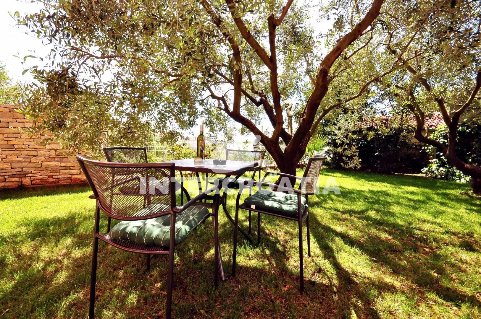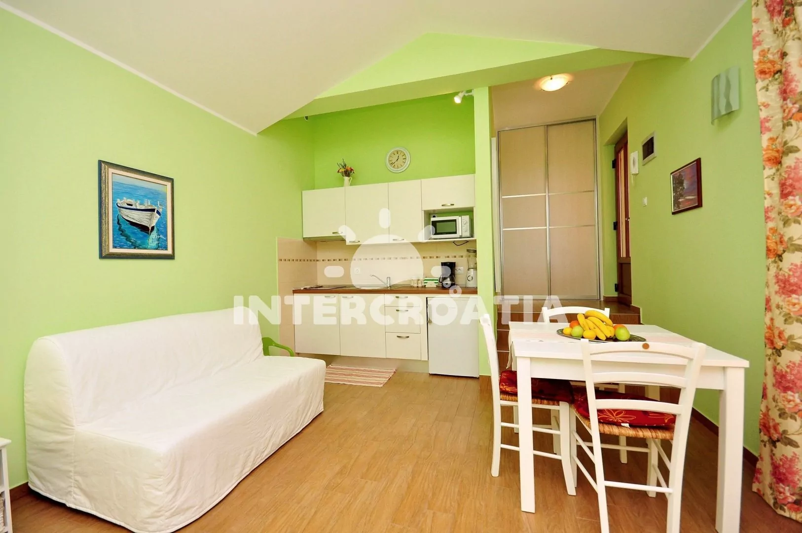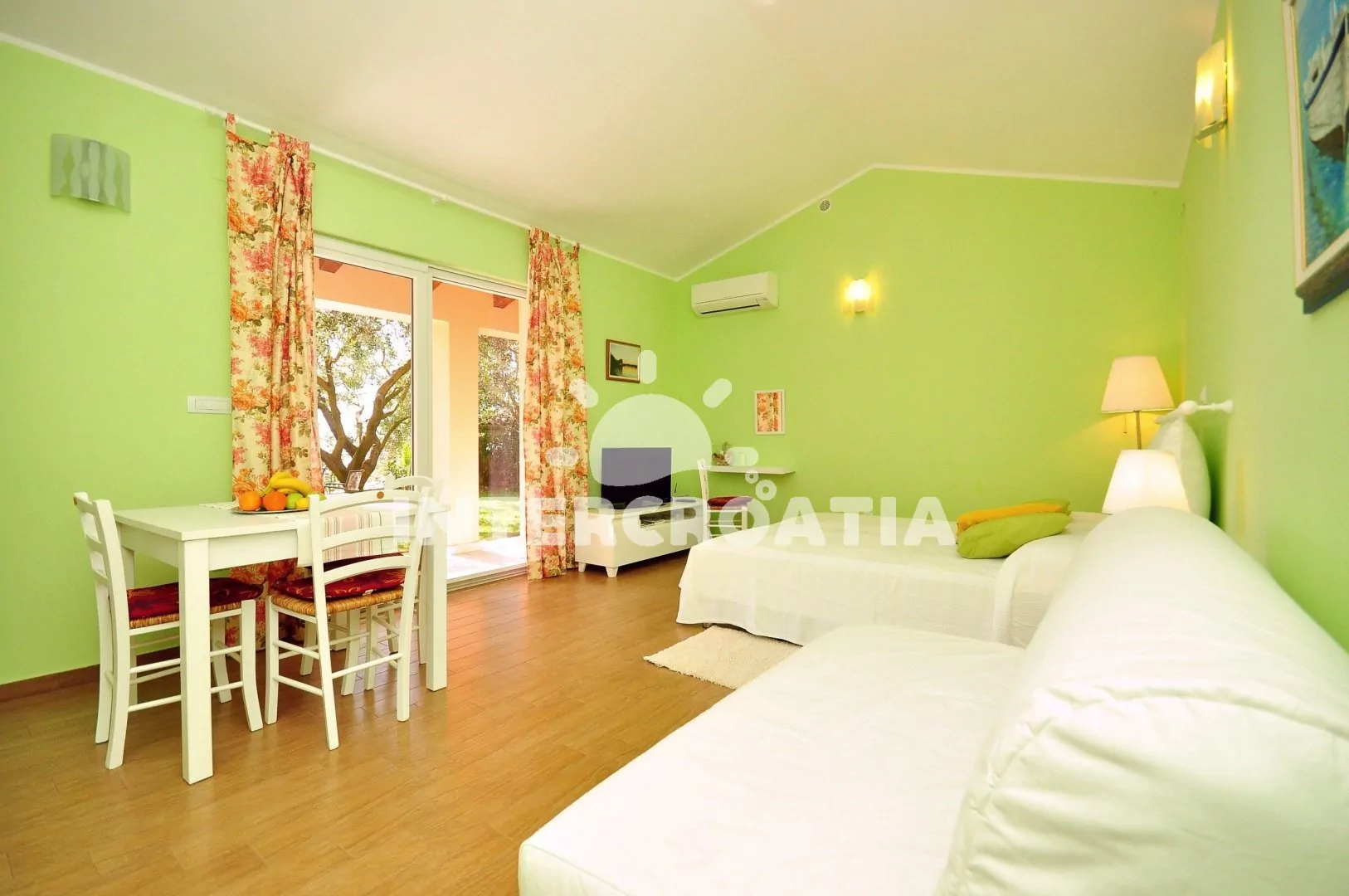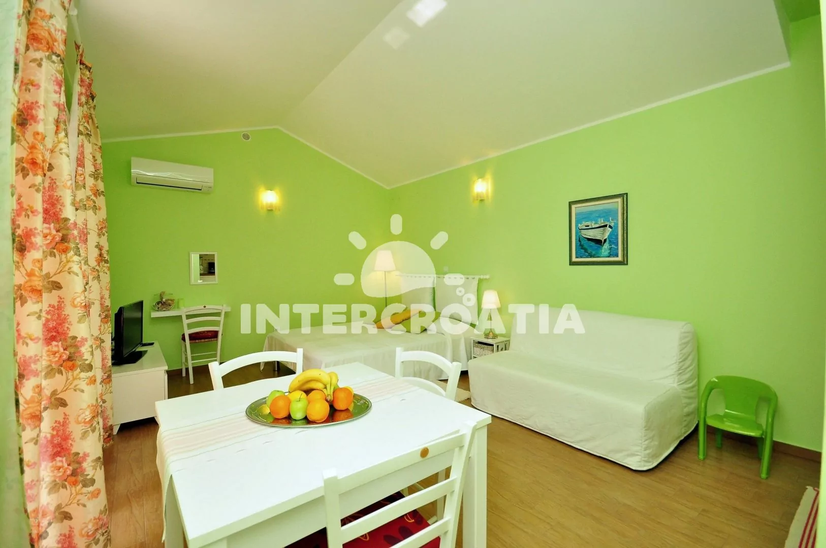 Apartmán typu studio je umístěný v přízemí vilky a je vhodný pro 2 osoby, nabízí výhled na moře a venkovní posezení v zahradě pod olivovníkem. Kuchyňský kout je vybavený varnou deskou, mikrovlnnou troubou, rychlovarnou konvicí, kávovarem, nádobím a lednicí s mrazákem. Obývací místnost s jídelním stolem pro 3 osoby, pohovkou, televizí se satelitním programem, klimatizací, jedním dvoulůžkem a vstupem na terasu. Koupelna se sprchovým koutem, umyvadlem, fénem a wc. Hostům je k dispozici sejf a parkování u objektu zdarma.