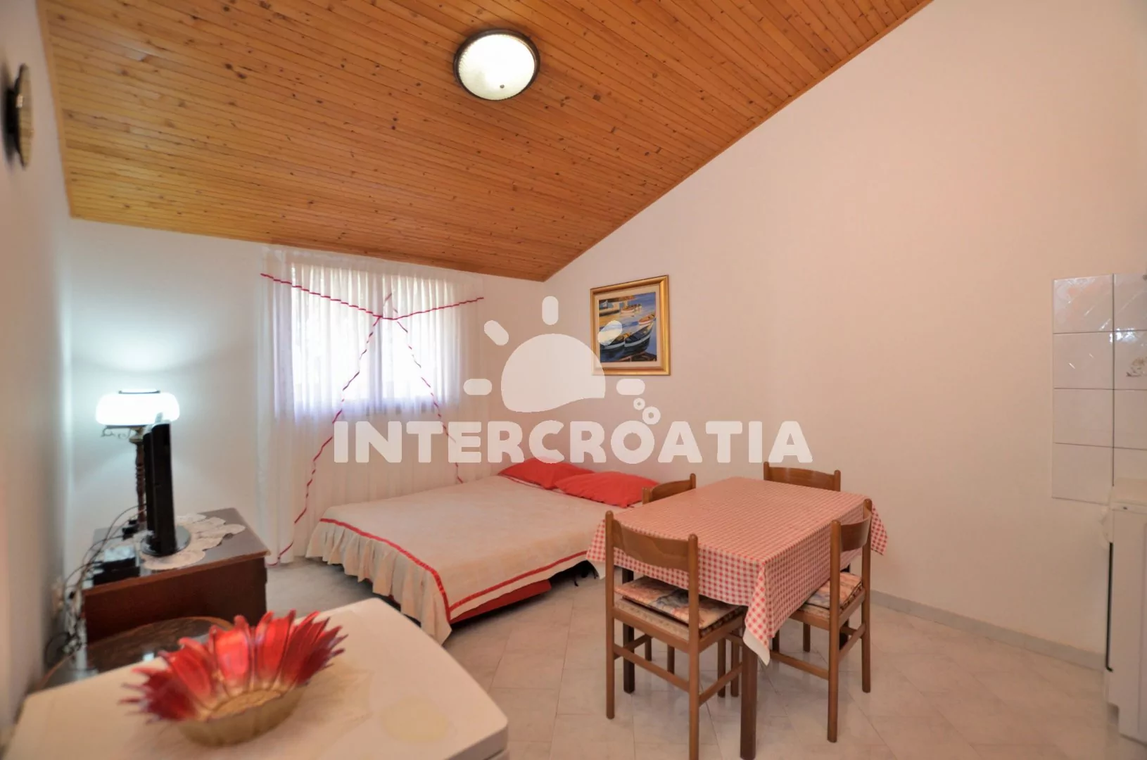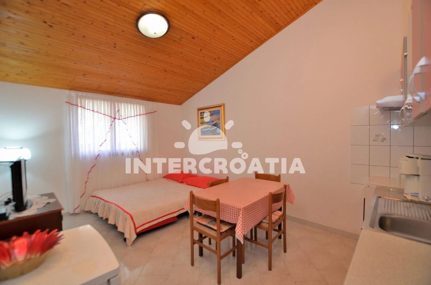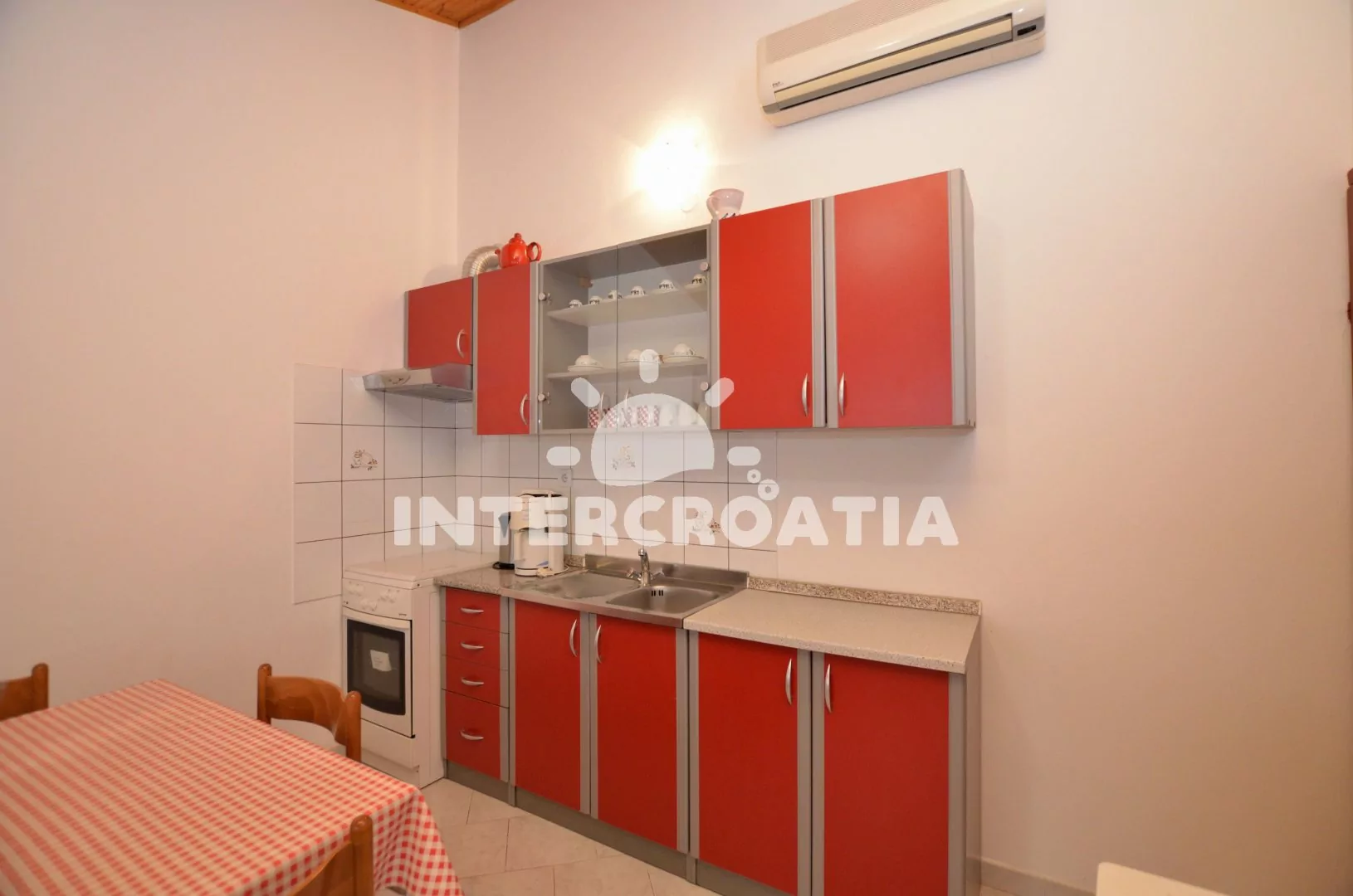Apartmán (40 m2) s terasou a posezením se nachází v přízemí domu. Apartmán je vhodný pro 2 až 4 osoby. Obývací pokoj je spojený s kuchyní. Kuchyňská linka je vybavena sporákem s troubou, digestoří, rychlovarnou konvicí, toustovačem, kávovarem, nádobím a lednicí s mrazákem. Obývací pokoj s jídelním stolem pro 4 osoby, pohovkou (rozložitelná na extra lůžko pro 2 osoby), televizí se satelitním programem a klimatizací. Ložnice s jedním dvoulůžkem. Koupelna se sprchovým koutem, umyvadlem, fénem a wc. Hostům je k dispozici parkování (150 až 300 m) od objektu zdarma.