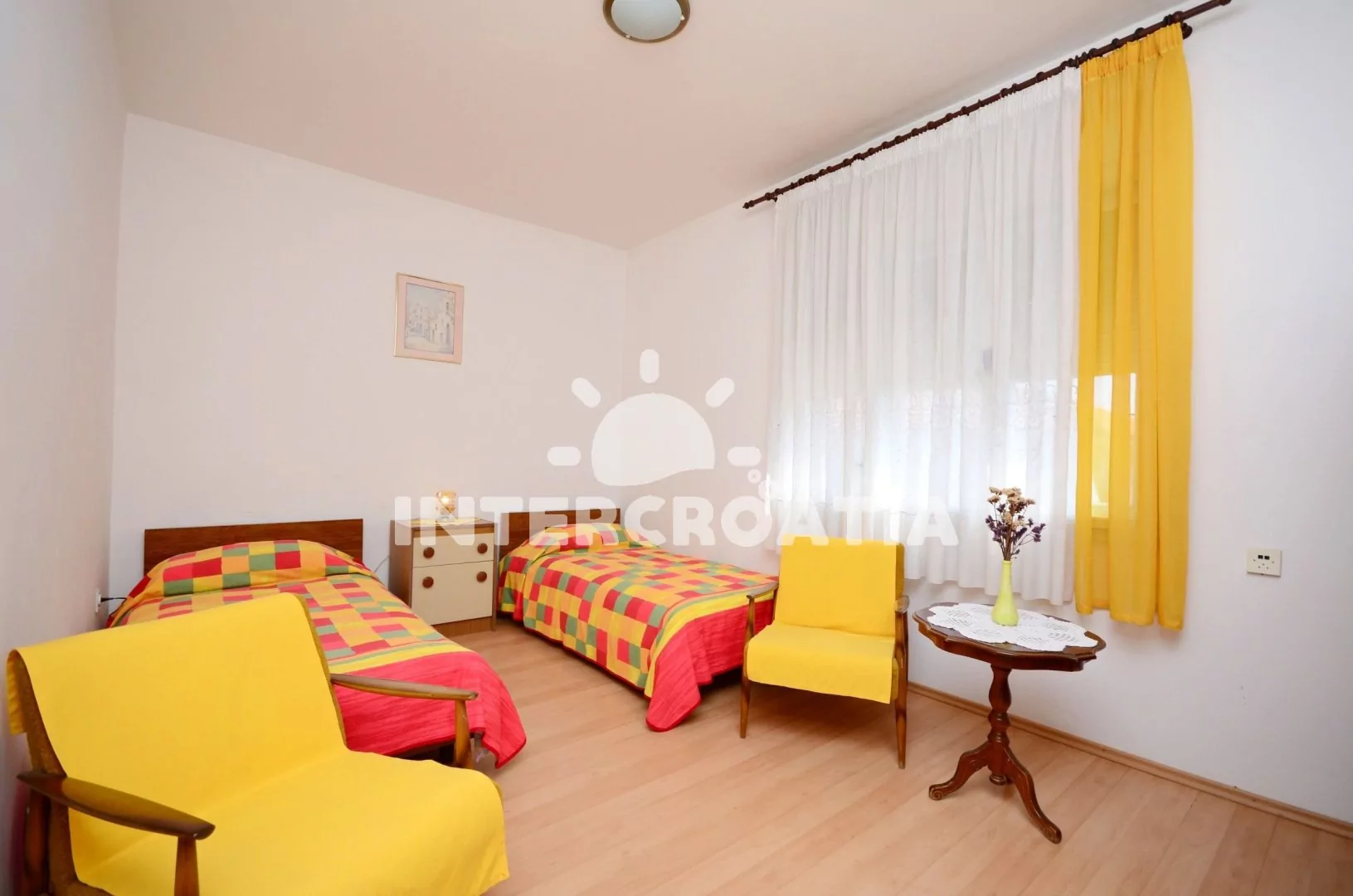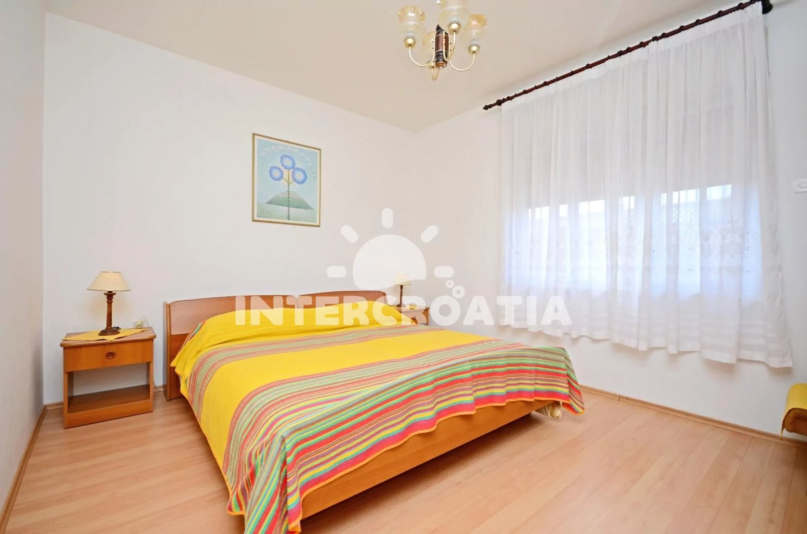 Apartmán (58 m2) s terasou a venkovním posezením se nachází v 1. patře domu. Apartmán má 2 ložnice a je vhodný pro až 4 osoby. Obývací pokoj je spojený s kuchyní. Kuchyňská linka je vybavena dvouplotýnkovým vařičem, rychlovarnou konvicí, kávovarem, nádobím a lednicí s mrazákem. Obývací pokoj s jídelním stolem, pohovkou, televizí se satelitním programem, klimatizací a vstupem na terasu. První ložnice s dvoulůžkem. Druhá ložnice se dvěma jednolůžky. Koupelna s vanou, umyvadlem a wc. Hostům je k dispozici parkování u objektu zdarma.